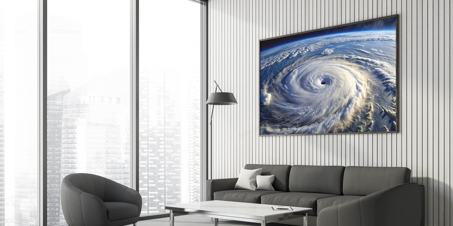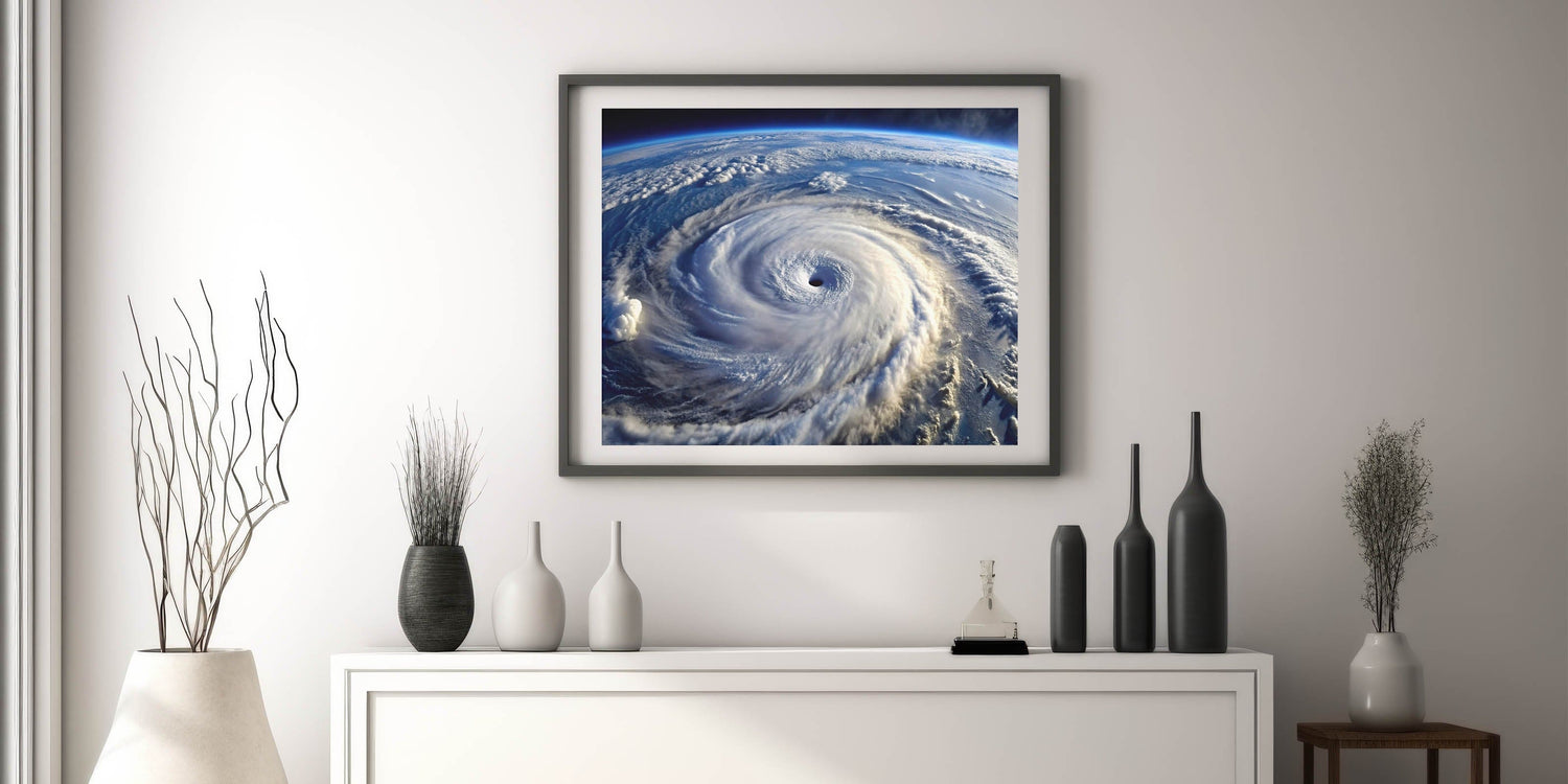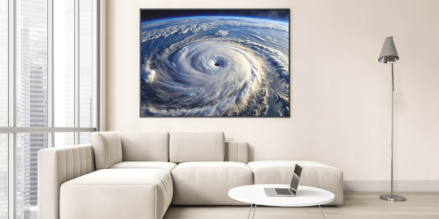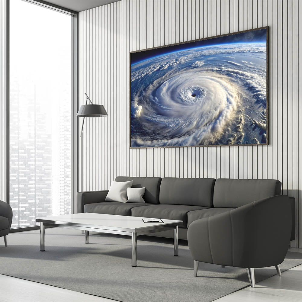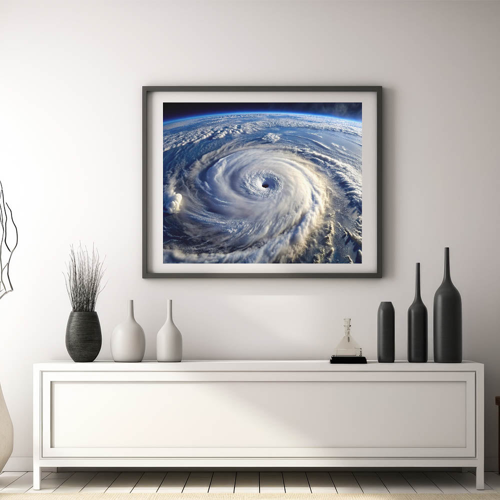 Take a journey into space with this breathtaking wall art featuring a hurricane’s eye as seen from above. This image captures the swirling beauty and raw power of Earth’s natural forces in a unique, cosmic perspective. The stunning detail of the clouds spiraling into the hurricane’s calm center is a visual masterpiece that showcases the fascinating relationship between Earth and space.