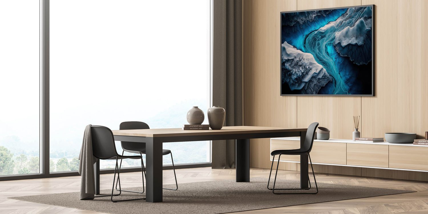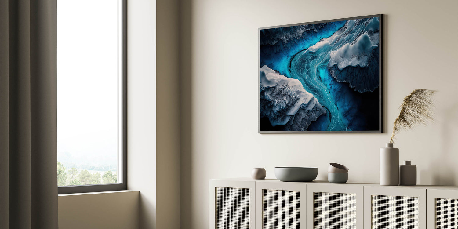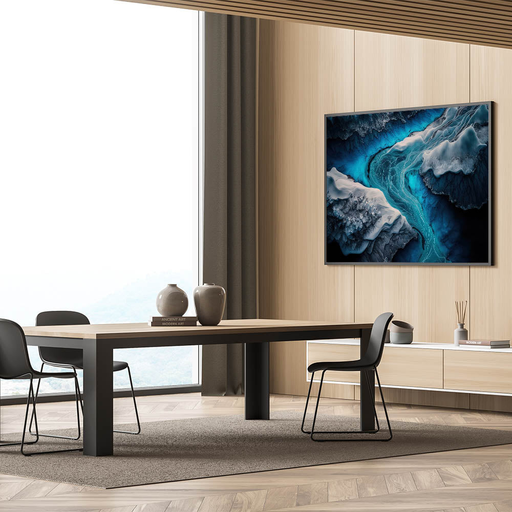 Admire the breathtaking beauty of Iceland's glacial rivers with this stunning aerial photography artwork. Capturing the winding paths of icy blue waters against white, snow-covered terrain, this piece evokes the serenity and power of Icelandic nature. The intricate textures and vivid colors bring the abstract beauty of nature to life, making it a perfect centerpiece for any space that celebrates the raw beauty of the natural world.