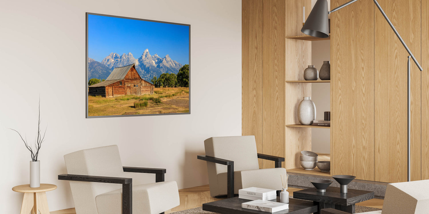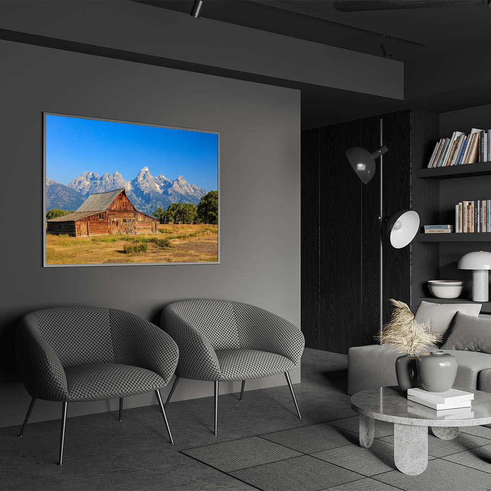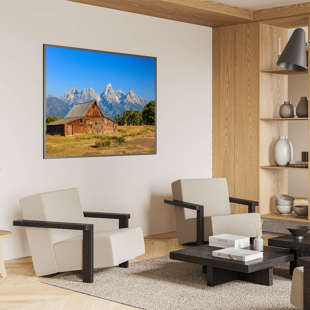 Capture the charm of Idaho's rustic beauty with this stunning wall art featuring a classic barn set against the majestic Grand Teton Mountains. The vivid colors and clear blue sky create a breathtaking backdrop, highlighting the beauty of Idaho's landscape. Perfect for those who appreciate Idaho photography, this artwork will bring a touch of natural elegance to your home or office decor.