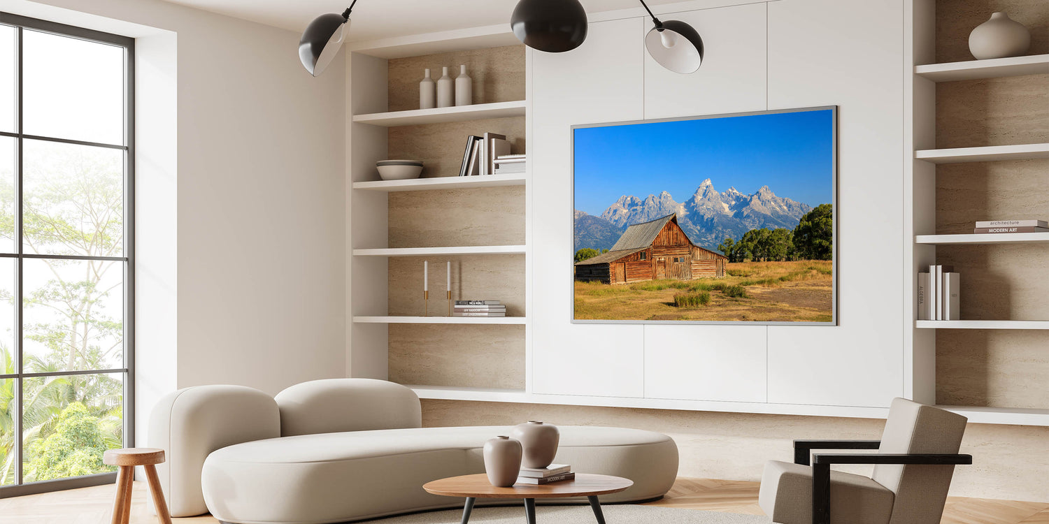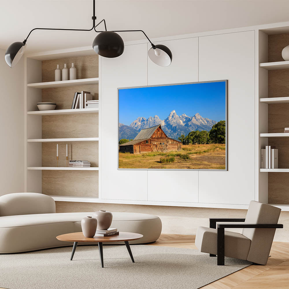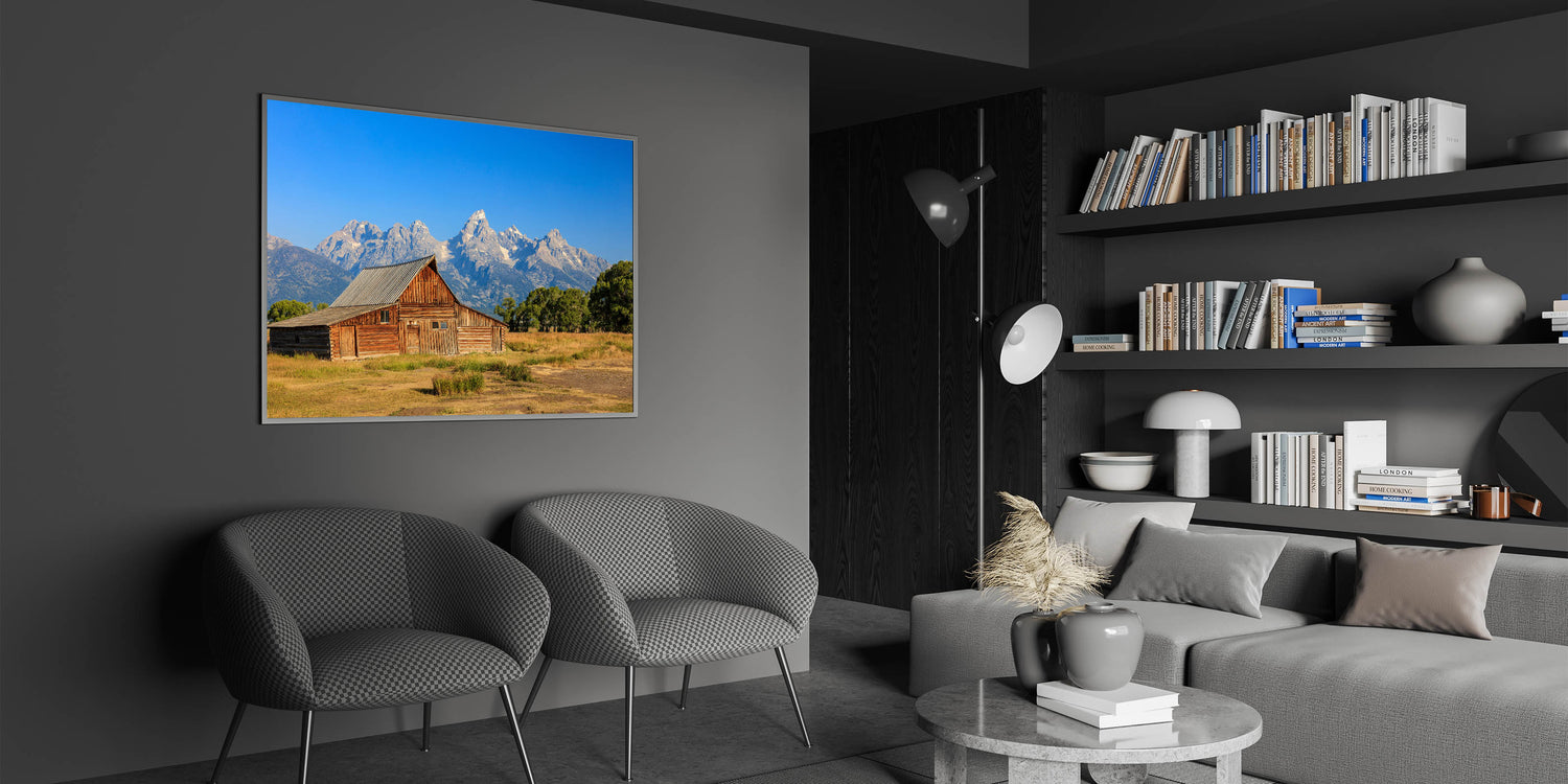 Capture the charm of Idaho's rustic beauty with this stunning wall art featuring a classic barn set against the majestic Grand Teton Mountains. The vivid colors and clear blue sky create a breathtaking backdrop, highlighting the beauty of Idaho's landscape. Perfect for those who appreciate Idaho photography, this artwork will bring a touch of natural elegance to your home or office decor.