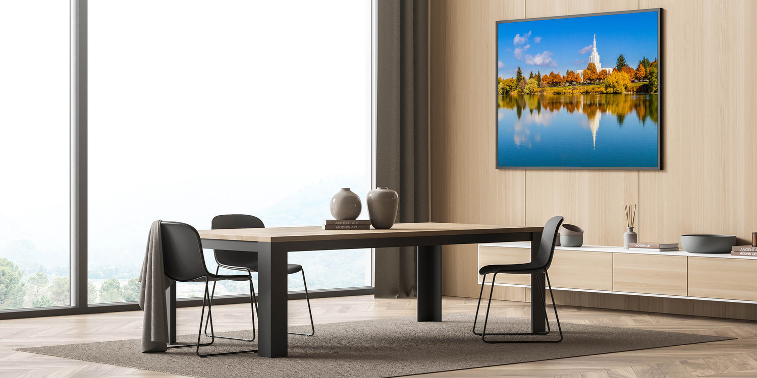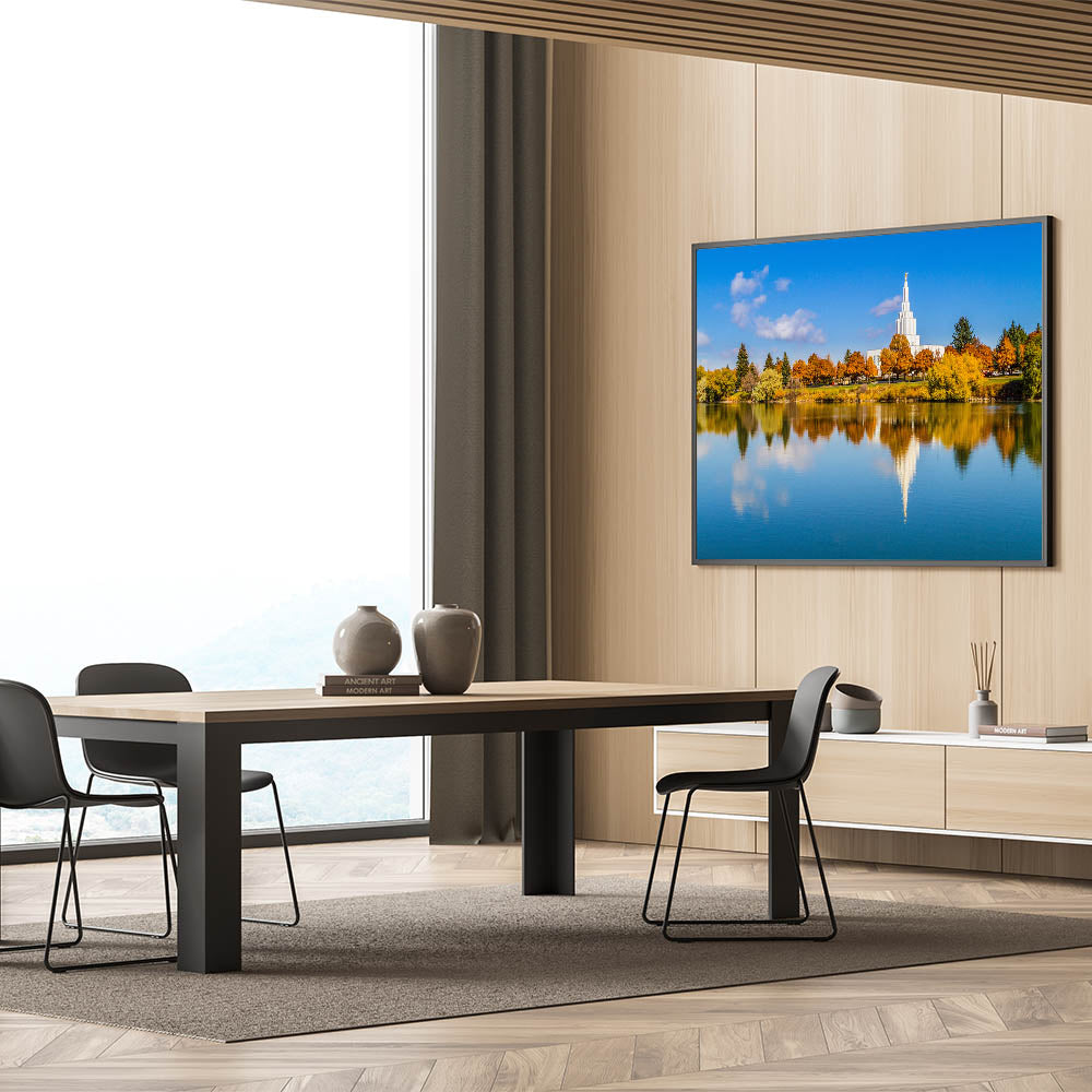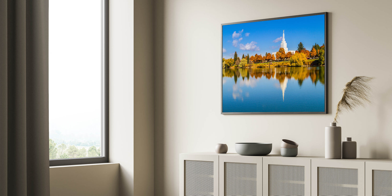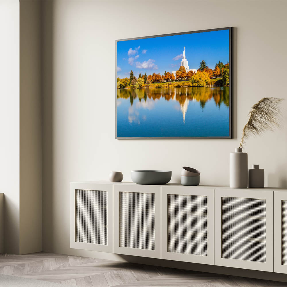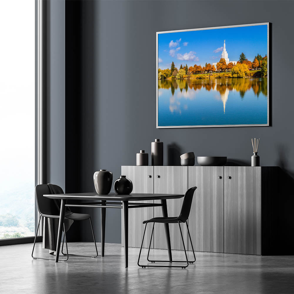 Embrace the serene beauty of Idaho with this stunning wall art featuring the Idaho Falls Temple surrounded by vibrant autumn foliage. The picturesque scene captures the temple’s reflection on the tranquil water, creating a breathtaking view that embodies the essence of Idaho’s natural and architectural beauty. Perfect for those who appreciate Idaho photography, this artwork will bring a touch of elegance and tranquility to any home or office decor.