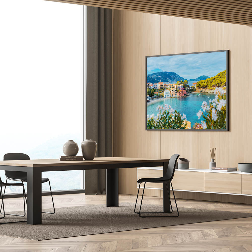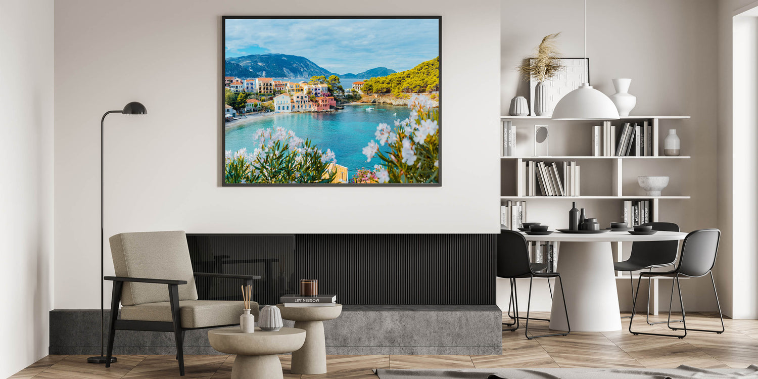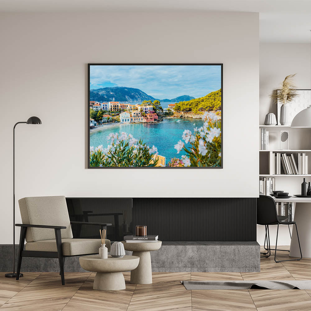 This Idyllic village canvas print is a celebration of coastal living, evoking feelings of relaxation and joy. It's an excellent choice for those who love the sea and wish to bring a piece of the Mediterranean into their home decor.