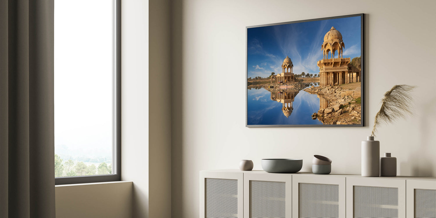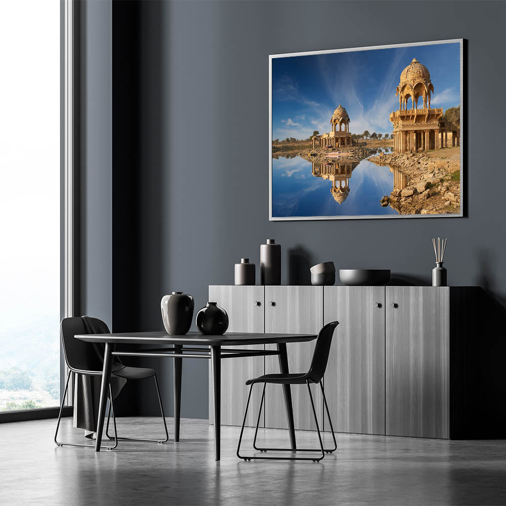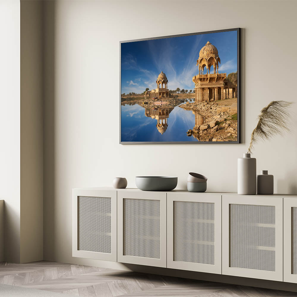 Introduce the captivating beauty of India to your living space with this stunning India Wall Art featuring the serene Gadi Sagar Lake in Jaisalmer. This mesmerizing print captures the intricate domes reflecting peacefully in the lake’s still waters, creating a perfect balance of architectural elegance and natural beauty.