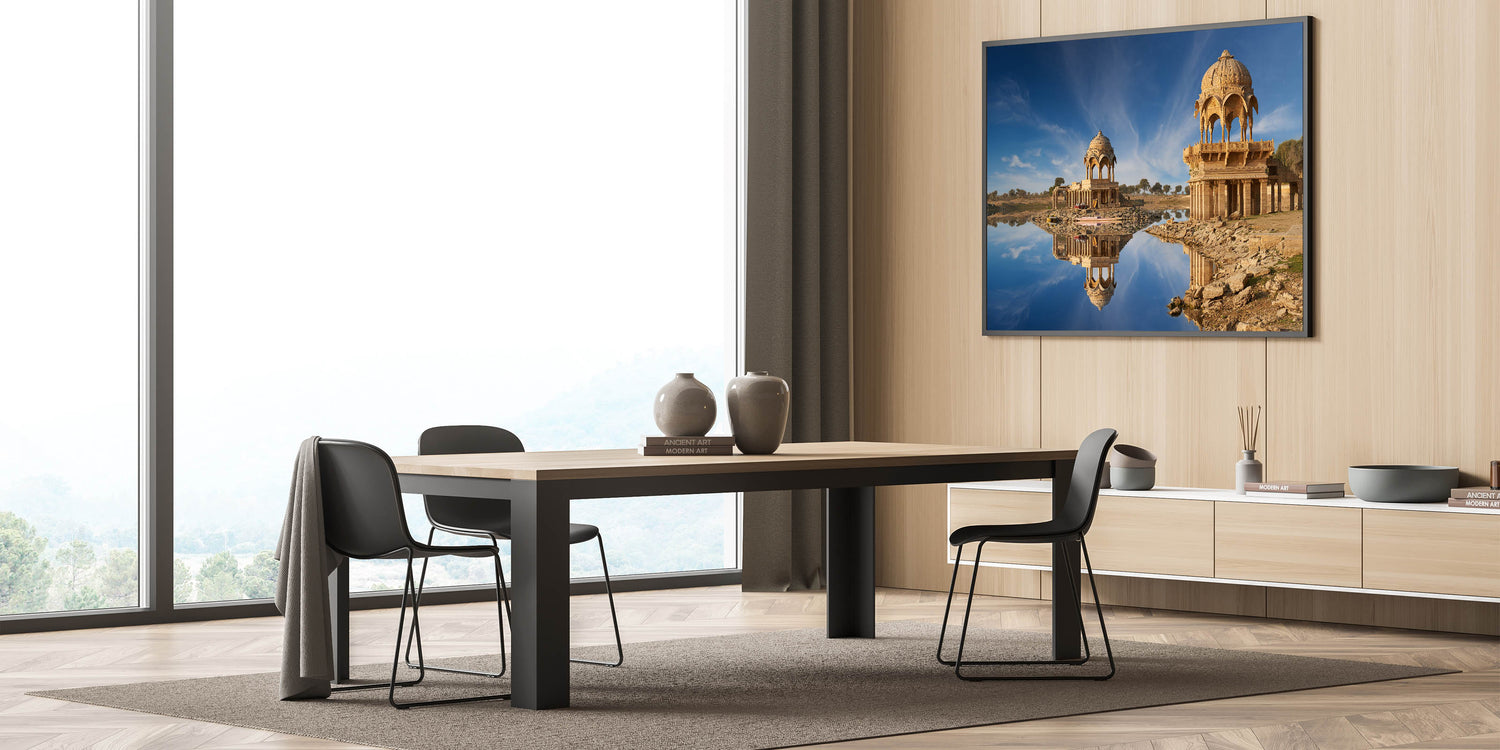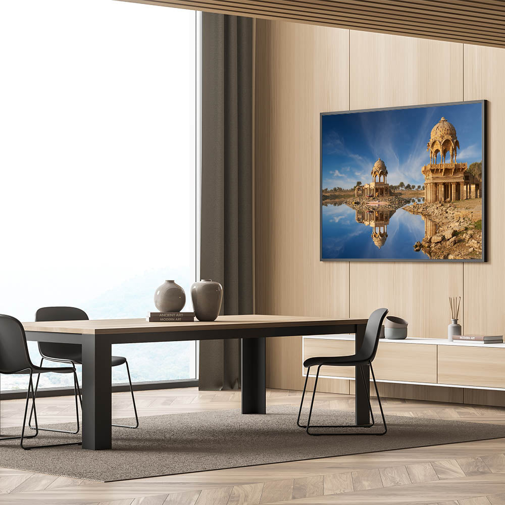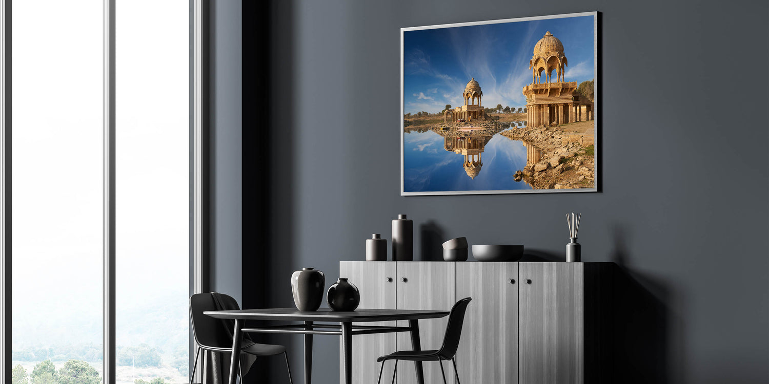 Introduce the captivating beauty of India to your living space with this stunning India Wall Art featuring the serene Gadi Sagar Lake in Jaisalmer. This mesmerizing print captures the intricate domes reflecting peacefully in the lake’s still waters, creating a perfect balance of architectural elegance and natural beauty.