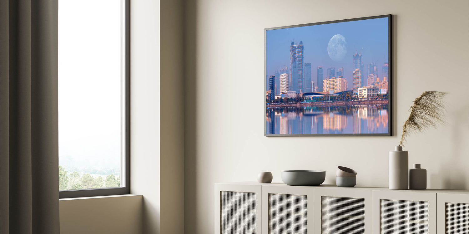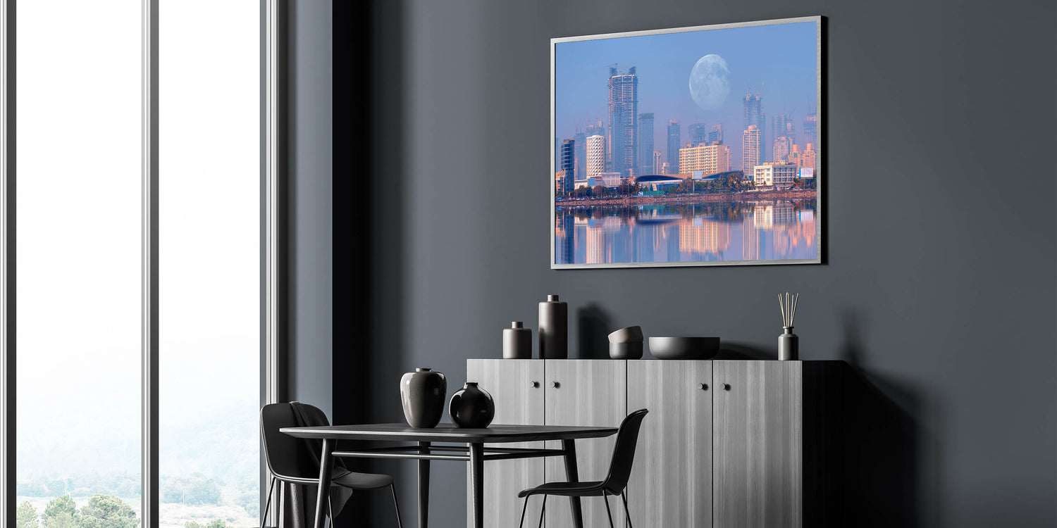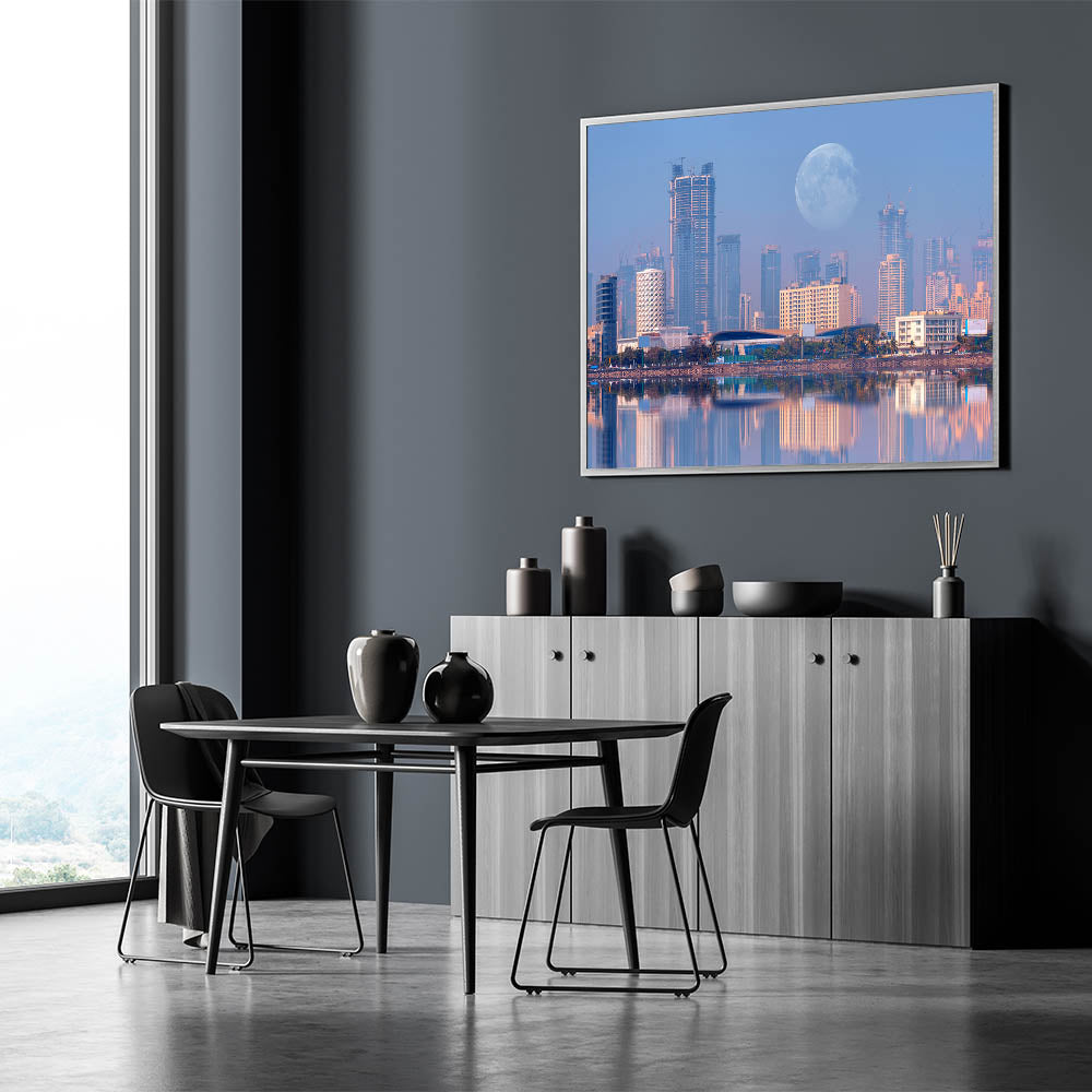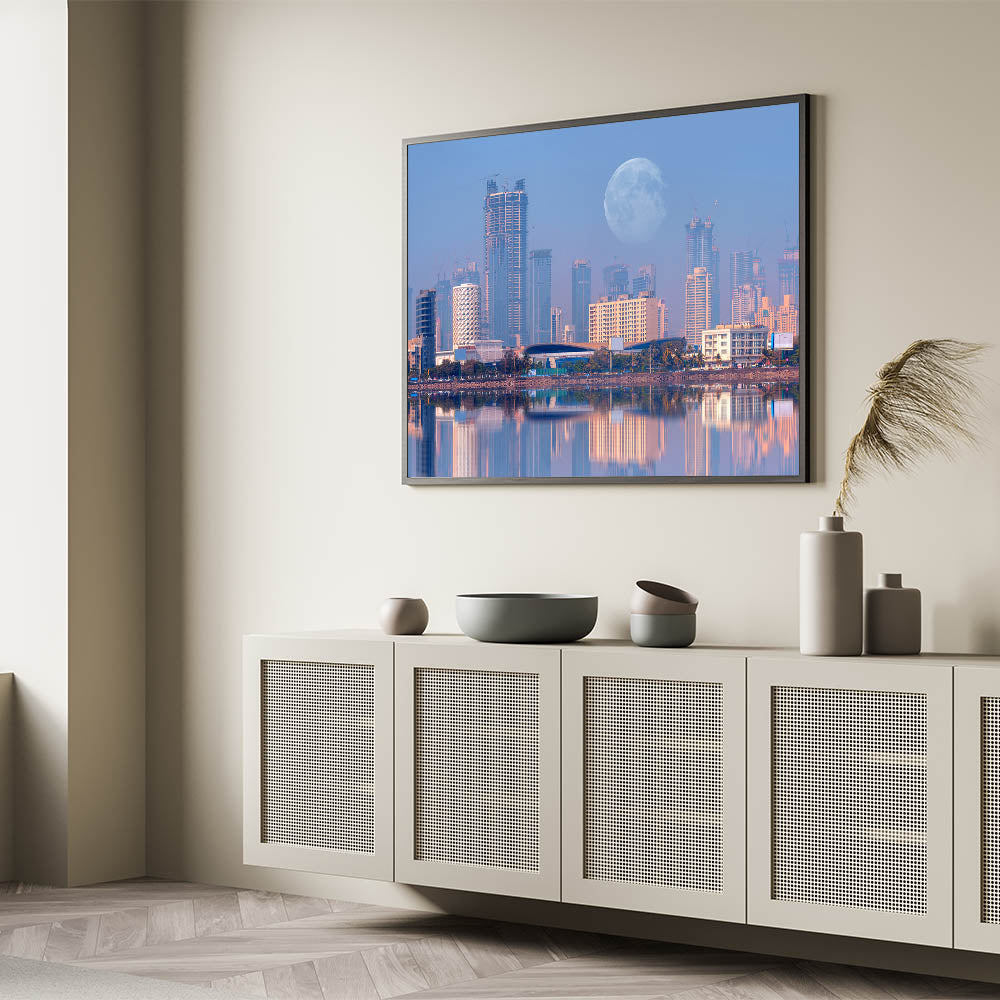 - High-quality print of the modern Mumbai skyline with full moon reflections