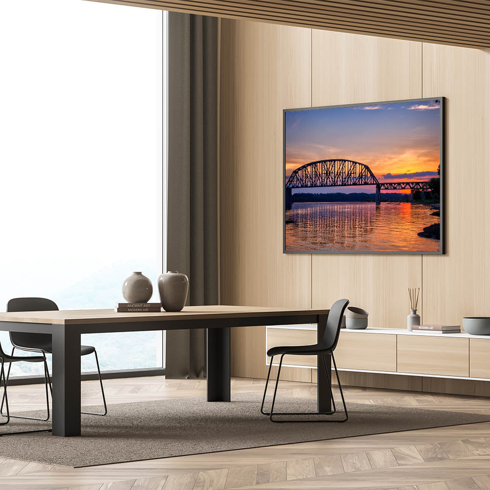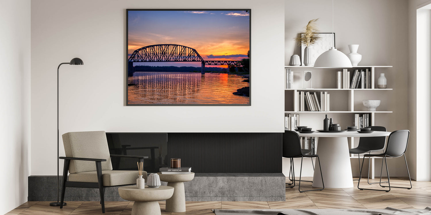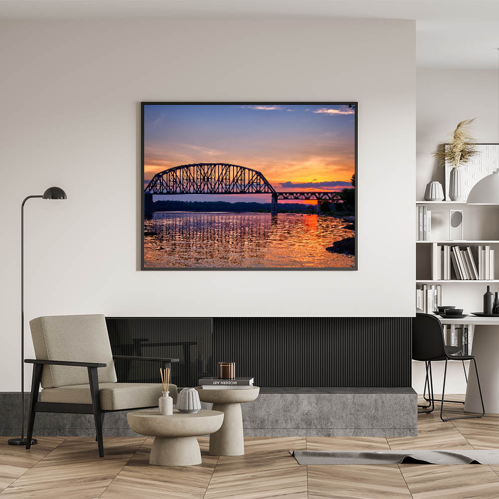 This beautiful piece of Indiana wall art captures the serene beauty of a bridge reflecting off calm waters at sunset. The warm tones of the sunset, from soft oranges to deep blues, create a tranquil yet captivating scene that adds warmth and peace to any room. This Indiana scenery print is perfect for those looking to add a touch of elegance and calmness to their space, blending architectural beauty with the soothing colors of the setting sun.
