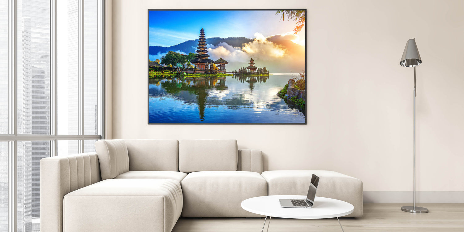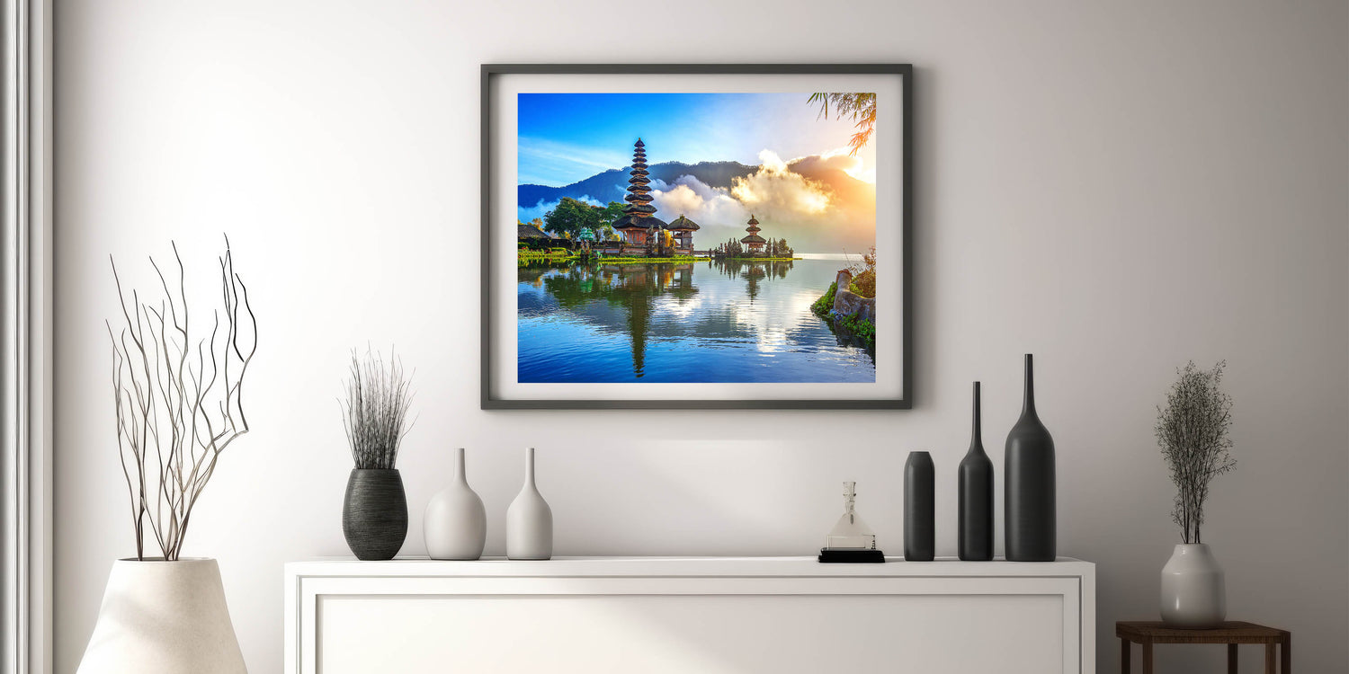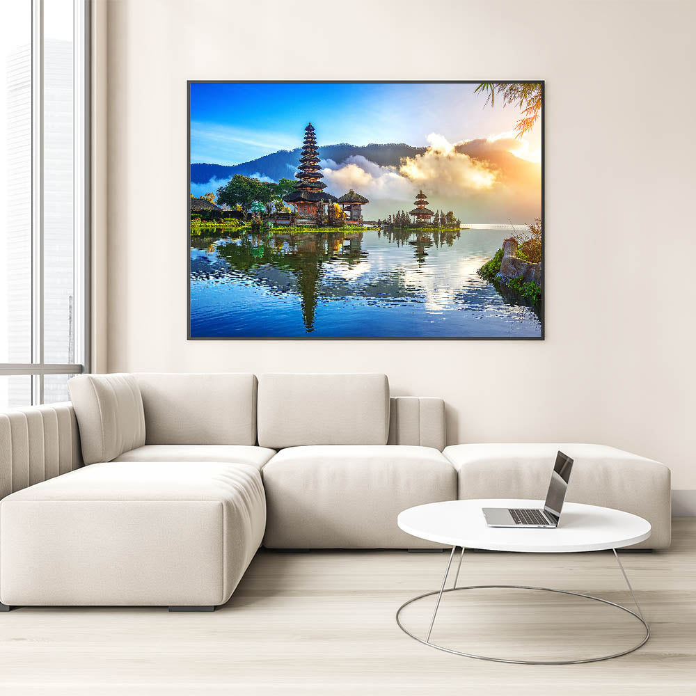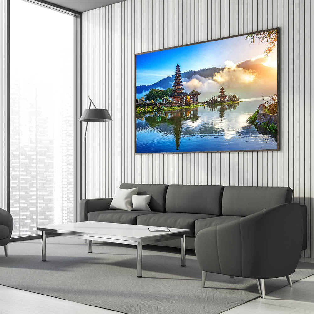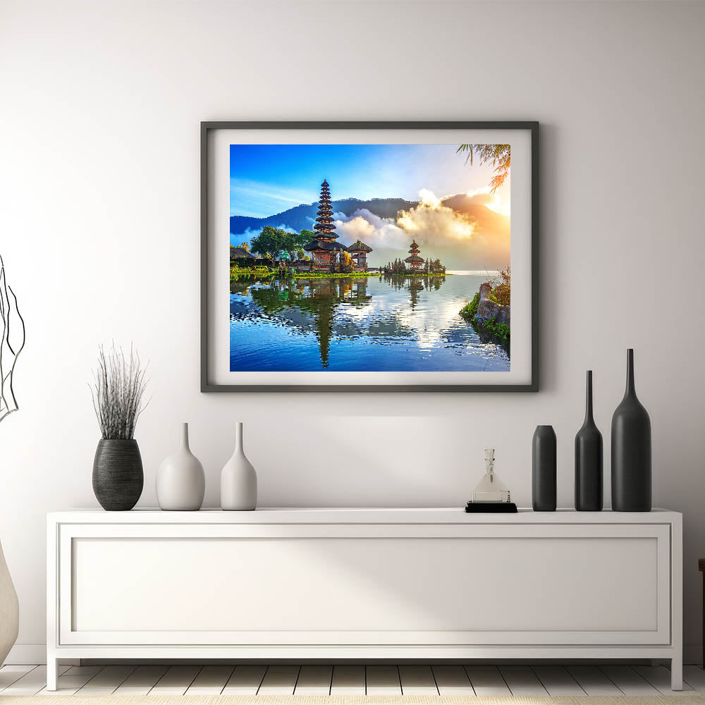 Experience the breathtaking beauty of Indonesia with this stunning wall art showcasing the tranquil reflections of a Balinese temple on serene waters. This captivating piece of art captures the essence of Indonesia's rich culture and natural beauty, blending vibrant colors with peaceful surroundings. Perfect for those who love to bring a touch of Southeast Asia into their home or office.