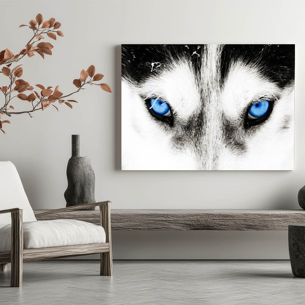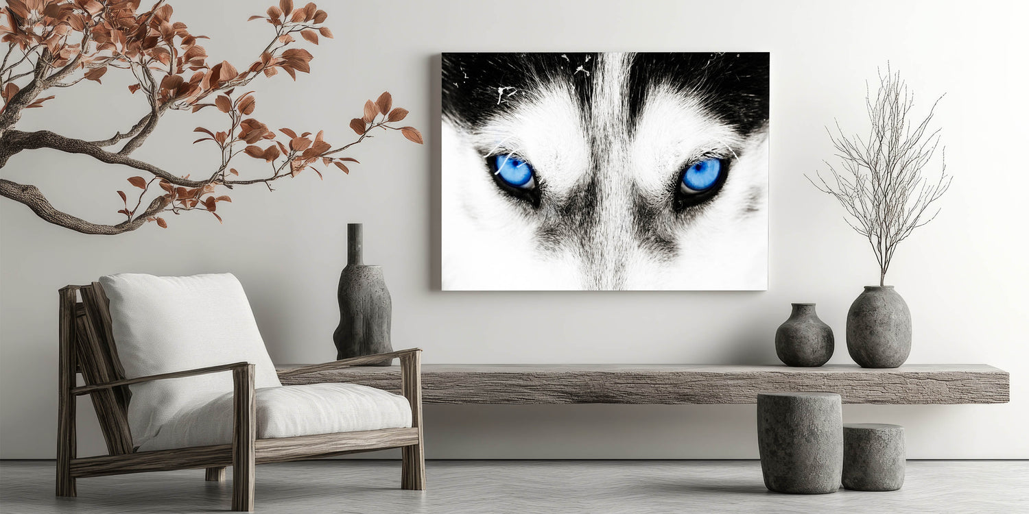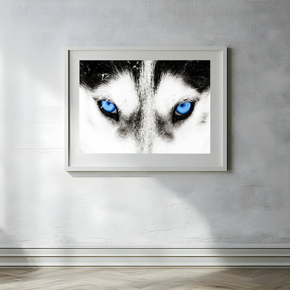 Make a bold statement with this striking wolf art, featuring the intense blue eyes of a wolf captured in breathtaking detail. The close-up composition draws you into the powerful gaze of the wolf, creating a mesmerizing and unforgettable piece of art. The contrast between the wolf’s white fur and its piercing blue eyes adds a dramatic and captivating element, making this artwork a perfect addition to modern and minimalist interiors.