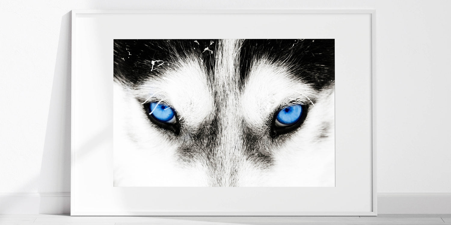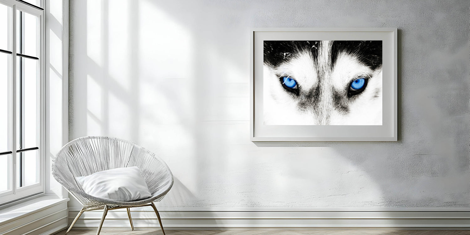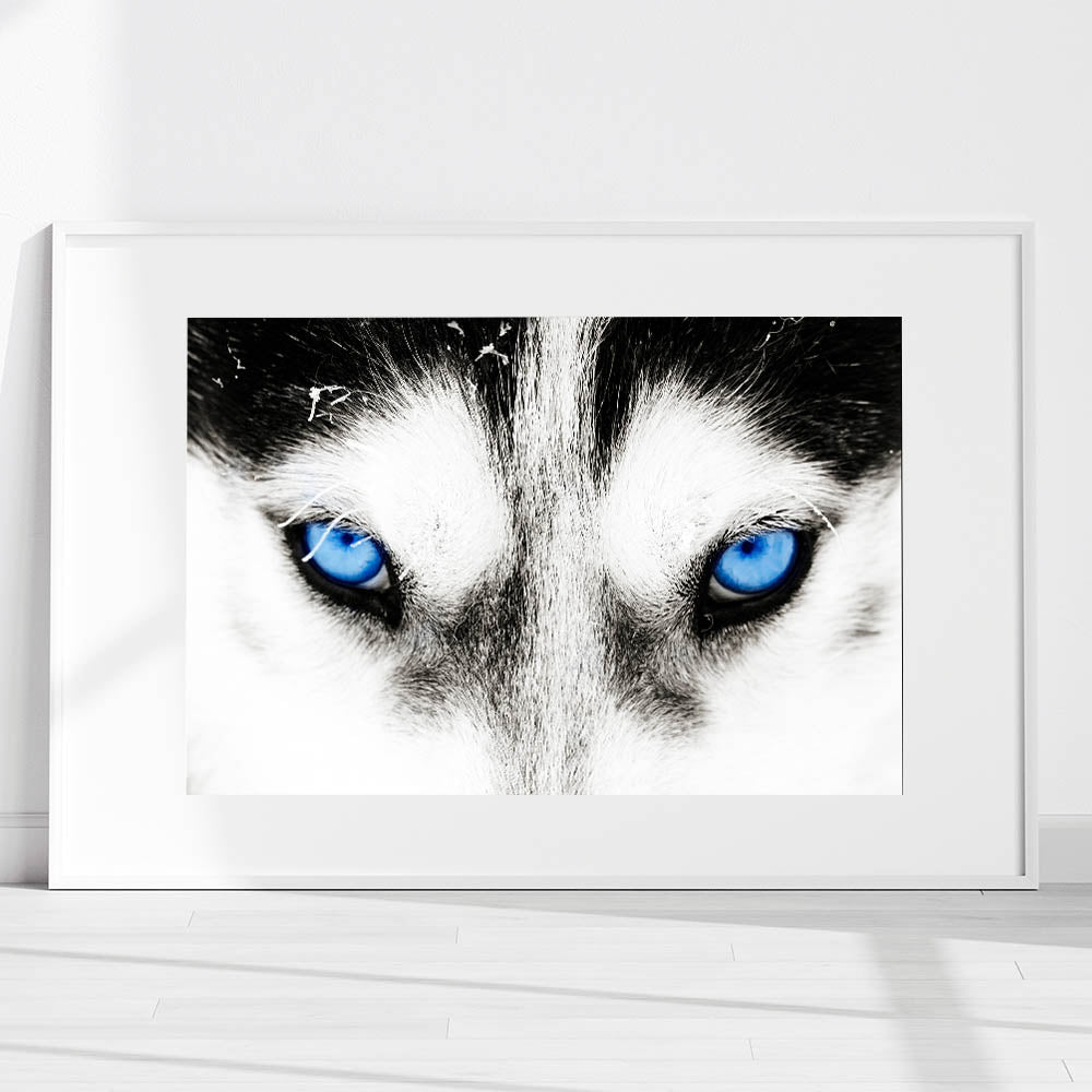 Make a bold statement with this striking wolf art, featuring the intense blue eyes of a wolf captured in breathtaking detail. The close-up composition draws you into the powerful gaze of the wolf, creating a mesmerizing and unforgettable piece of art. The contrast between the wolf’s white fur and its piercing blue eyes adds a dramatic and captivating element, making this artwork a perfect addition to modern and minimalist interiors.