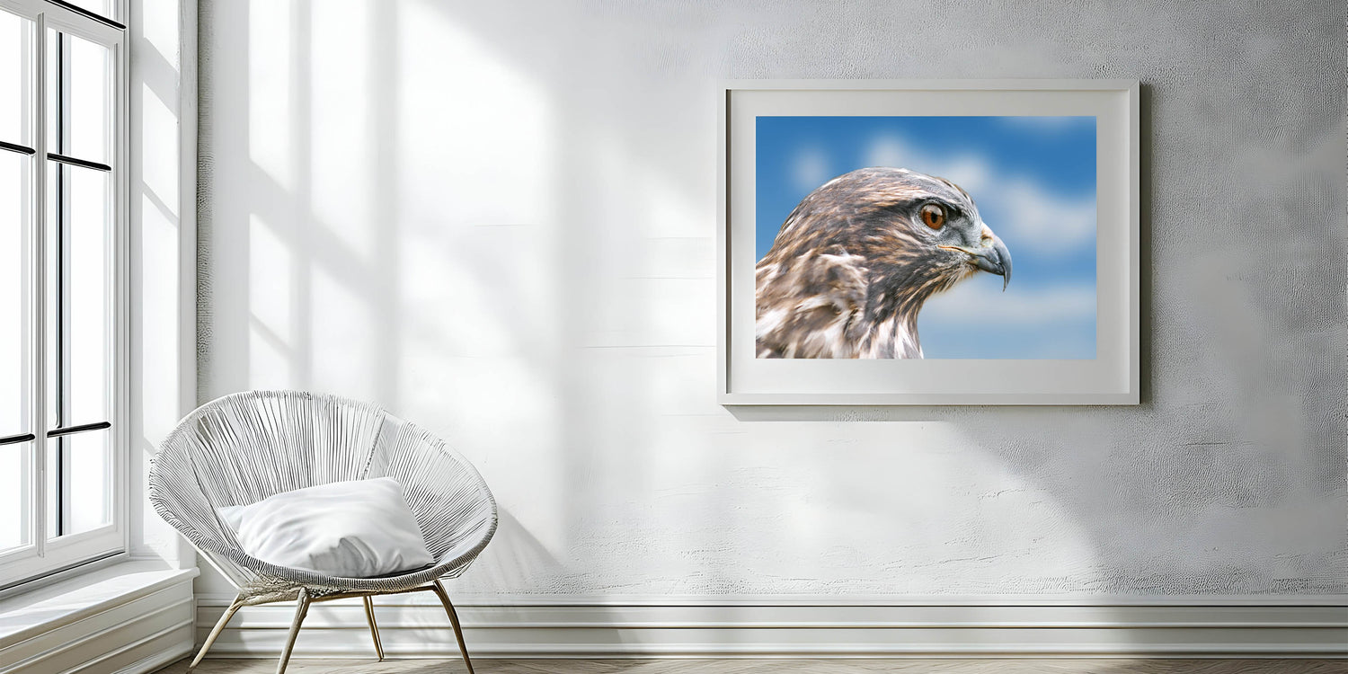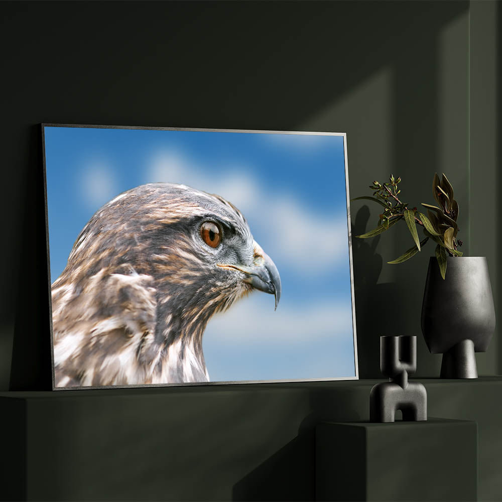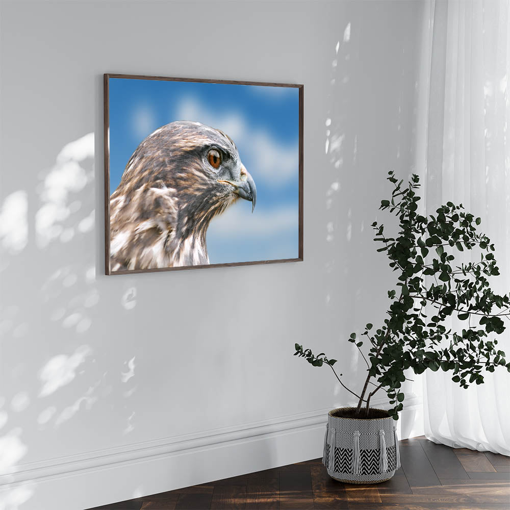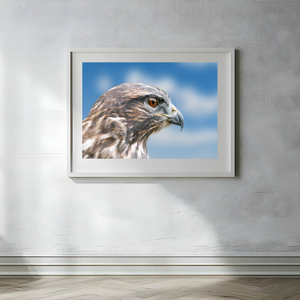 Bring the raw power and sharp focus of nature into your space with this striking close-up photograph of a hawk, part of our Birds of Prey collection. This artwork captures the hawk's intense gaze, highlighting every intricate detail of its feathers, beak, and eye. The soft blue sky background adds contrast, making the bird's piercing look even more compelling.