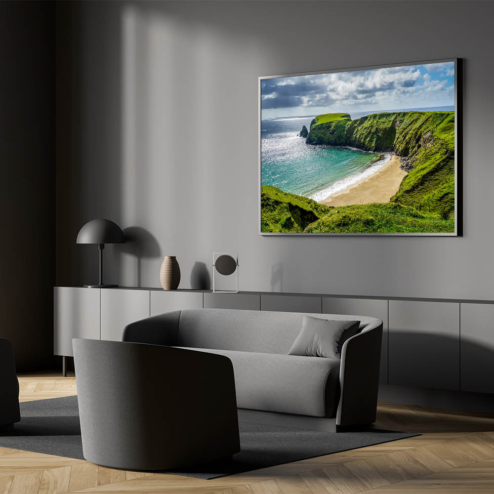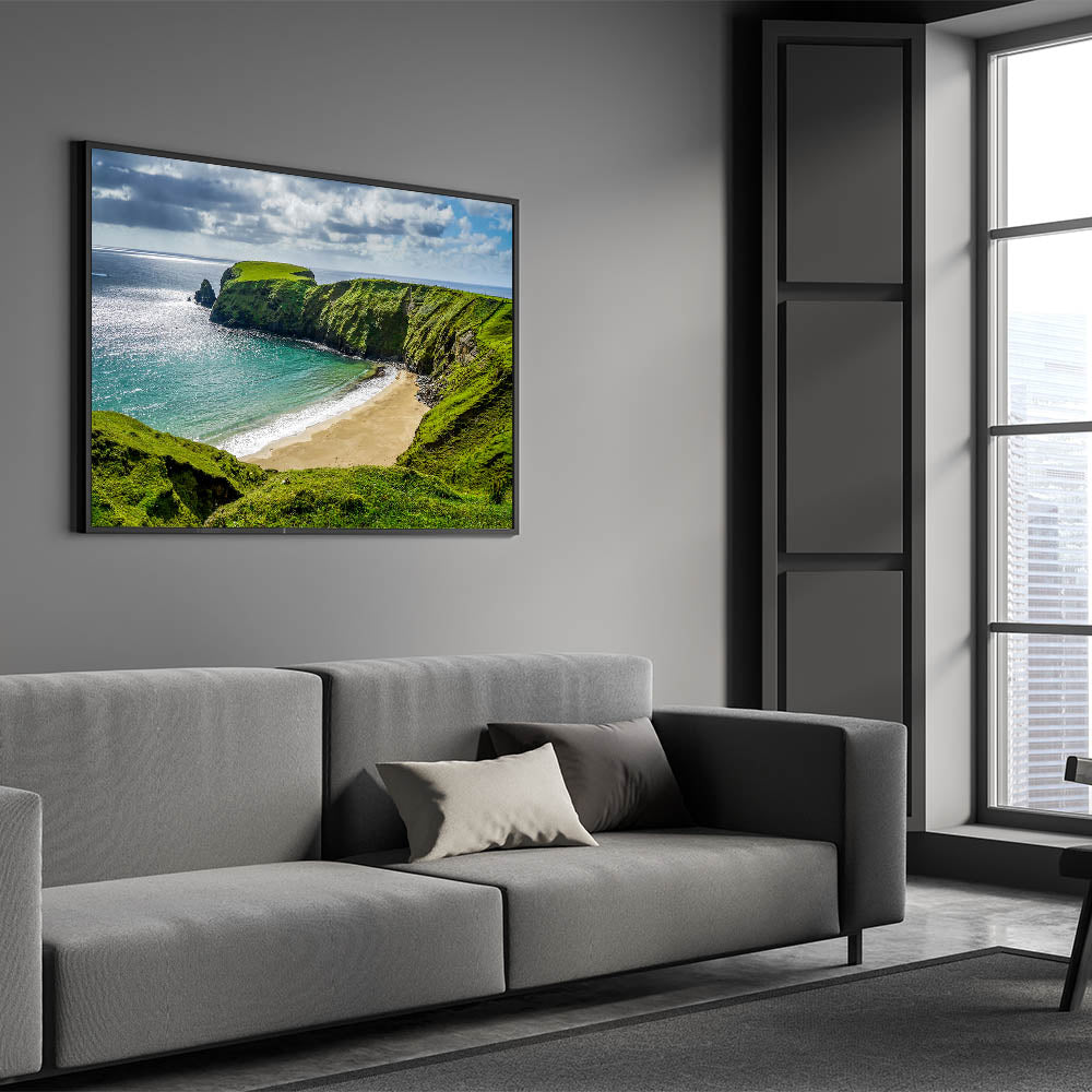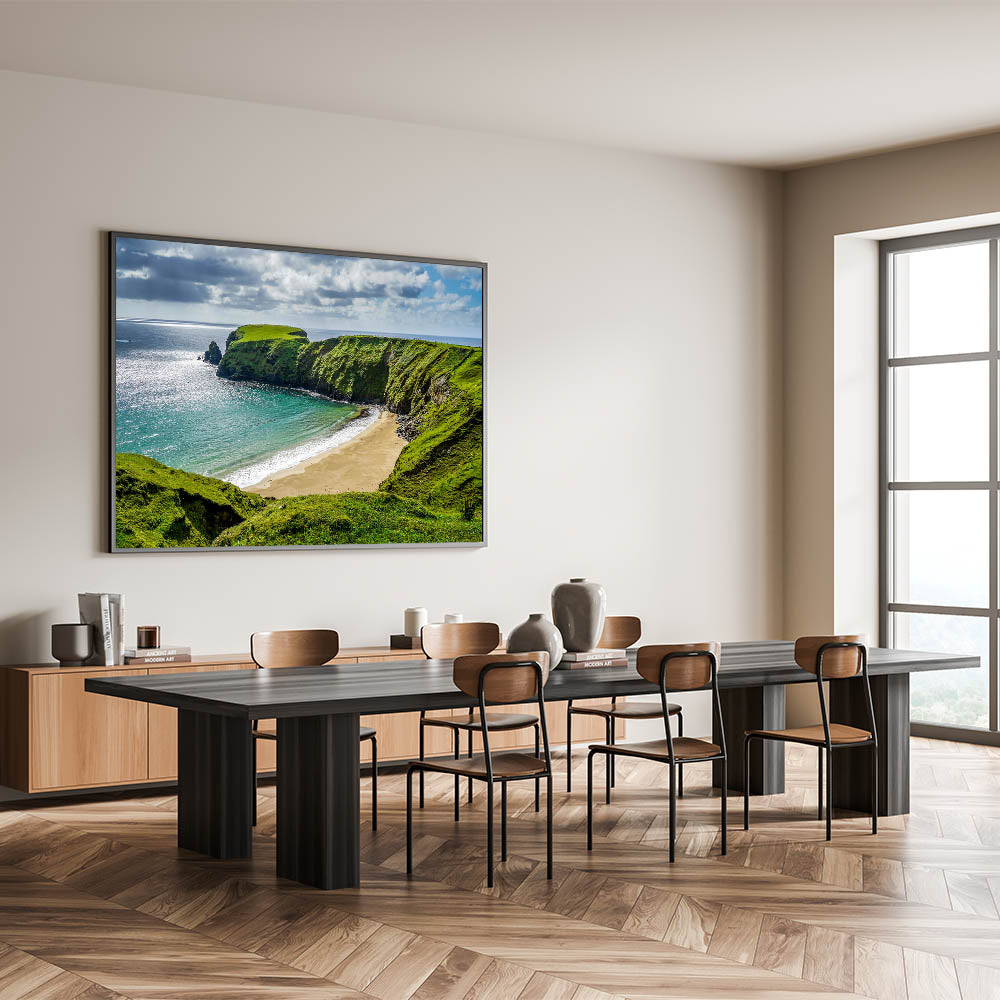 Immerse yourself in the natural beauty of Ireland's coast with this stunning Ireland nature artwork, featuring a serene beach nestled between lush green cliffs. The crystal-clear waters shimmer under the sunlight, creating a calming and peaceful atmosphere that captures the essence of Ireland’s wild and unspoiled landscapes. This high-quality Irish landscape print brings a touch of coastal serenity to your home, perfect for those who love the outdoors and the beauty of nature.