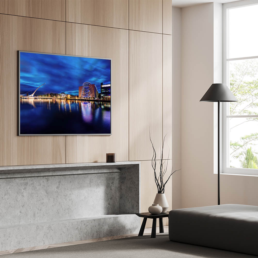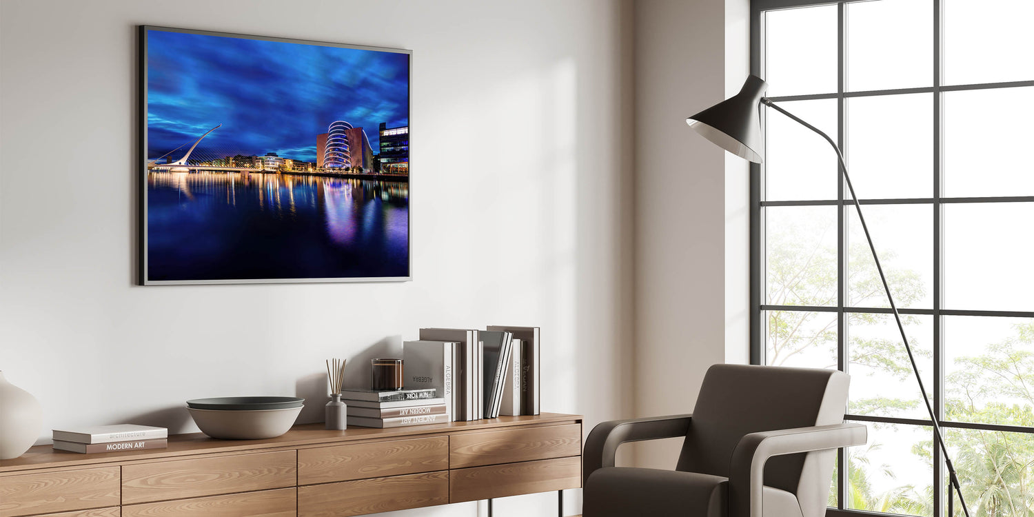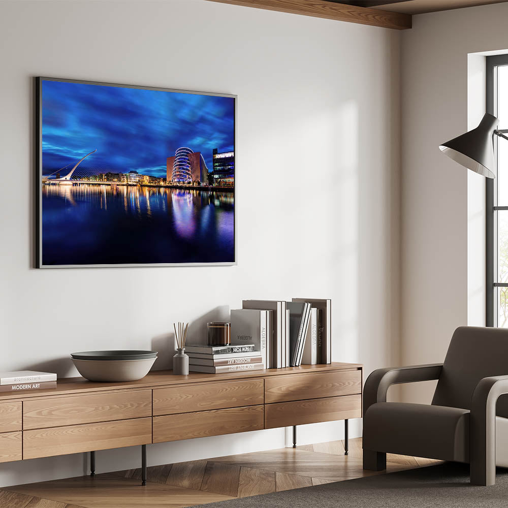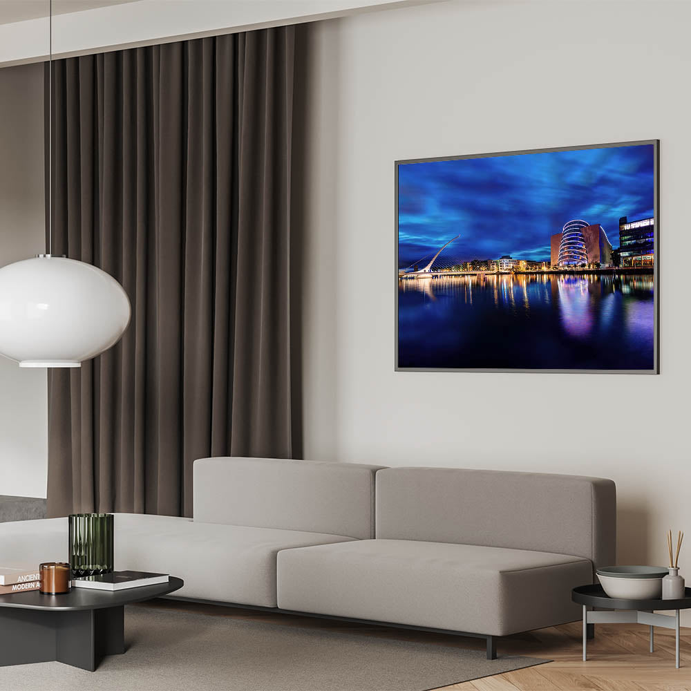 Illuminate your space with the dynamic energy of Dublin’s cityscape captured in this Ireland photography wall decor. This stunning night scene features the modern architecture of Dublin, including the Samuel Beckett Bridge and the iconic Convention Centre, with their lights beautifully reflected on the calm waters of the River Liffey. The vibrant blues, purples, and golds in this high-quality Irish landscape print create a sense of movement and excitement, perfect for adding a contemporary touch to any room.
