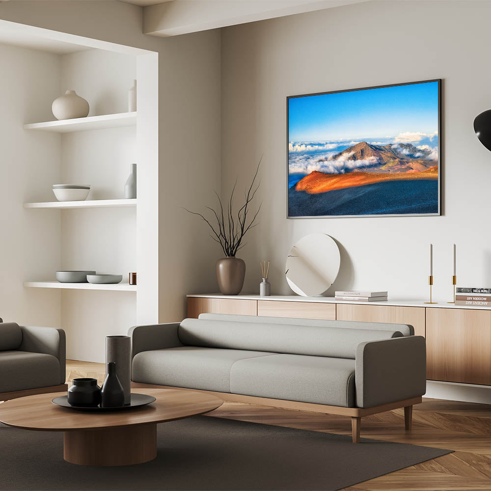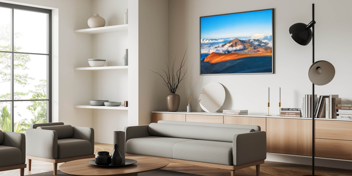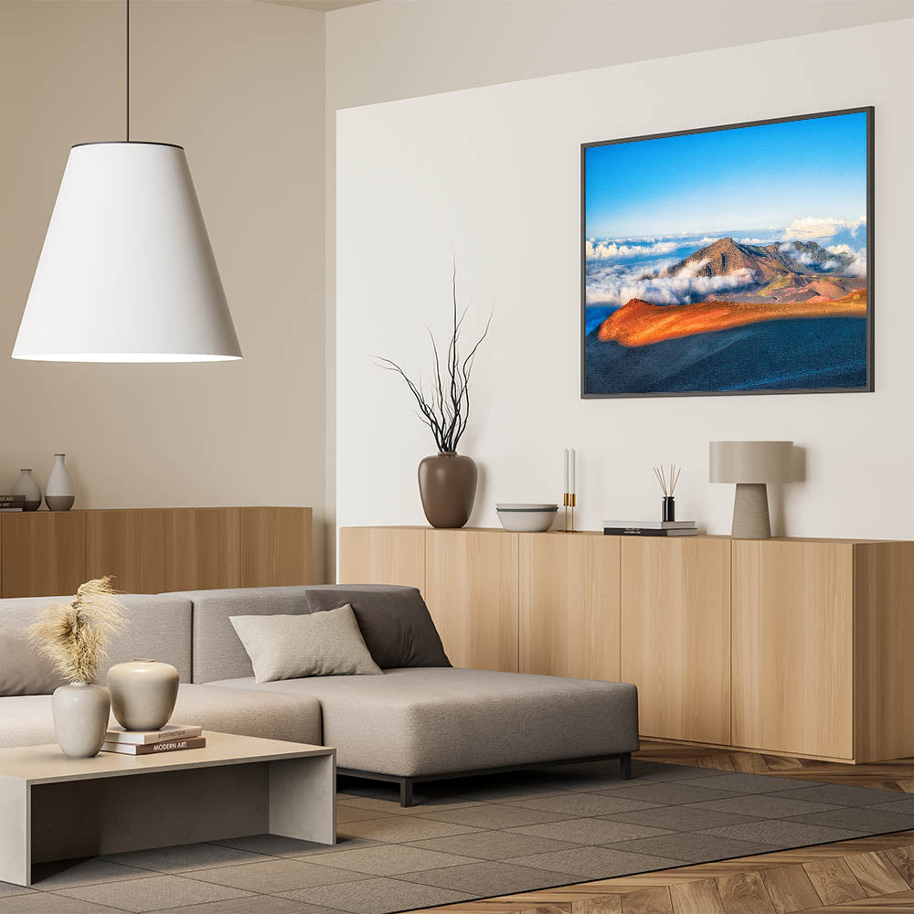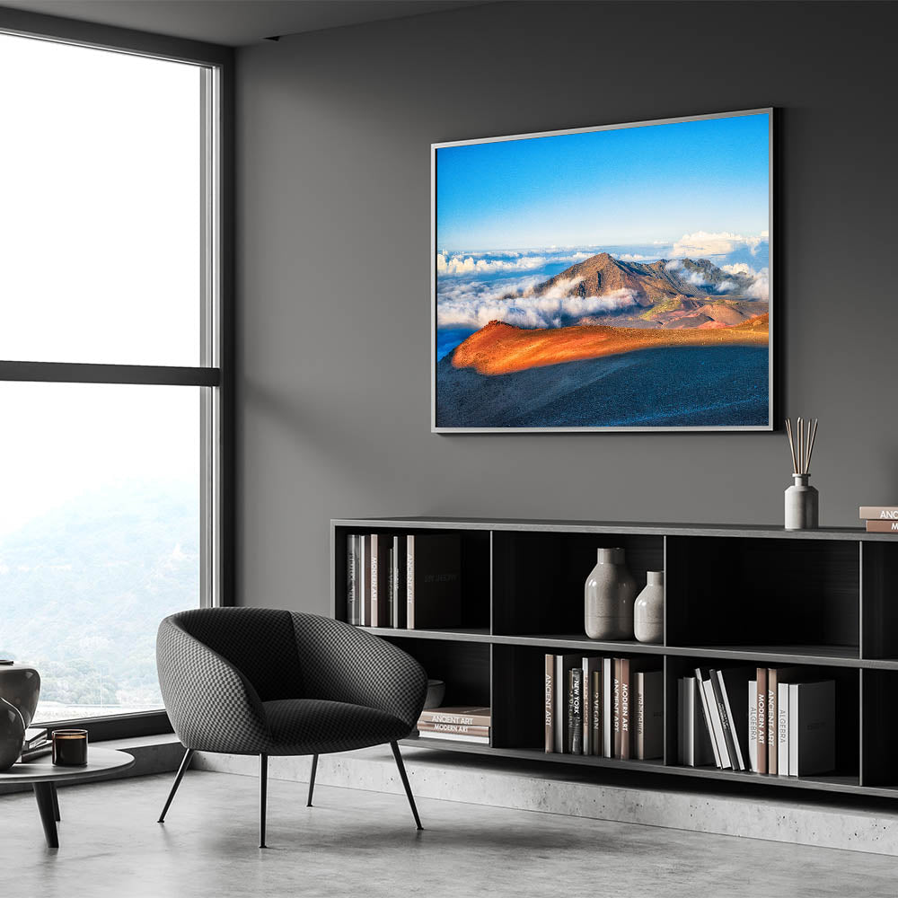 Discover the raw beauty of Maui's Haleakalā Crater with this Island Landscape Art. Captured in stunning detail, the vibrant orange and red tones of the volcanic landscape contrast beautifully with the soft, rolling clouds below. This Maui Photography print brings the grandeur and serenity of one of Hawaii's most iconic landmarks right into your home.
