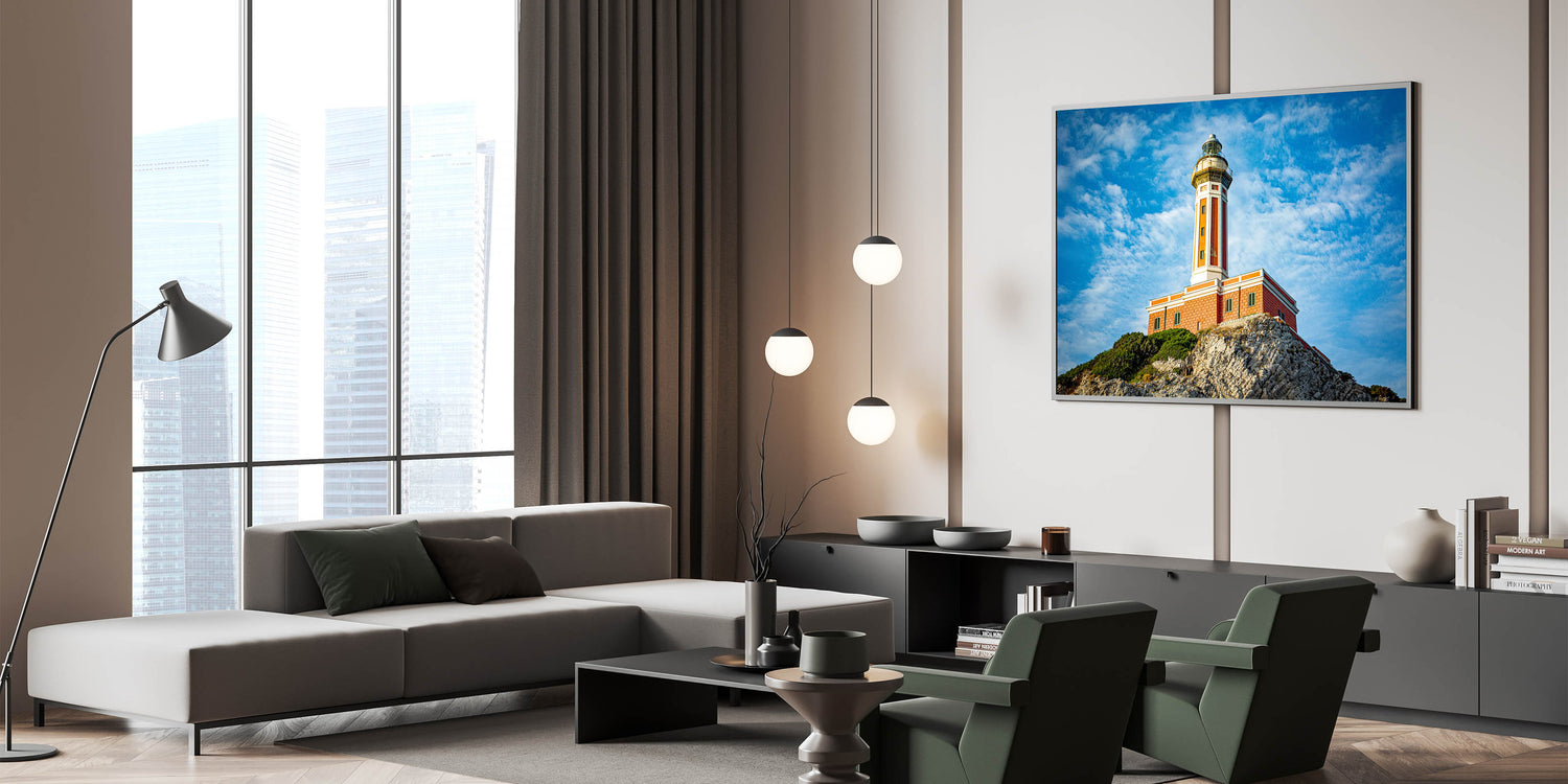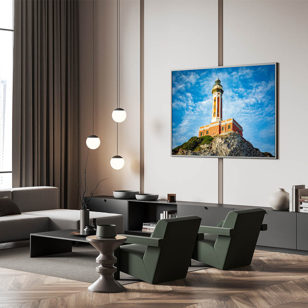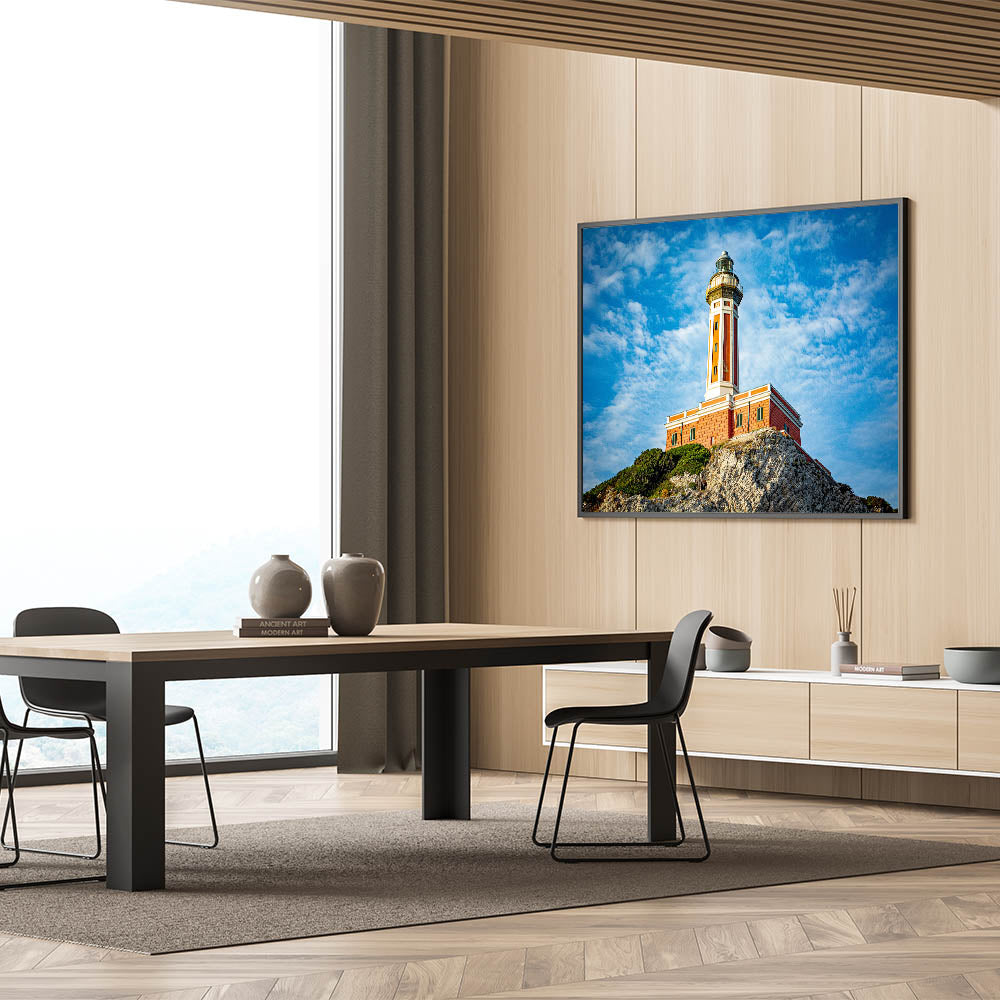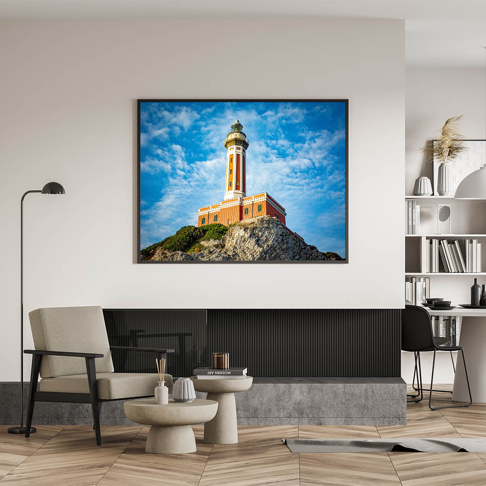 - Stunning depiction of a Capri coastal lighthouse, ideal for coastal or Mediterranean-themed interiors.