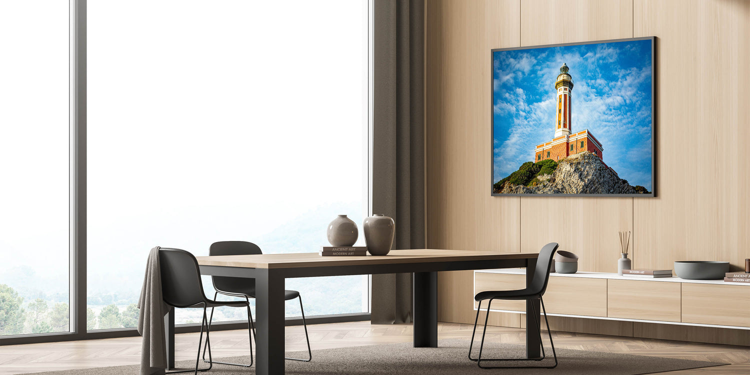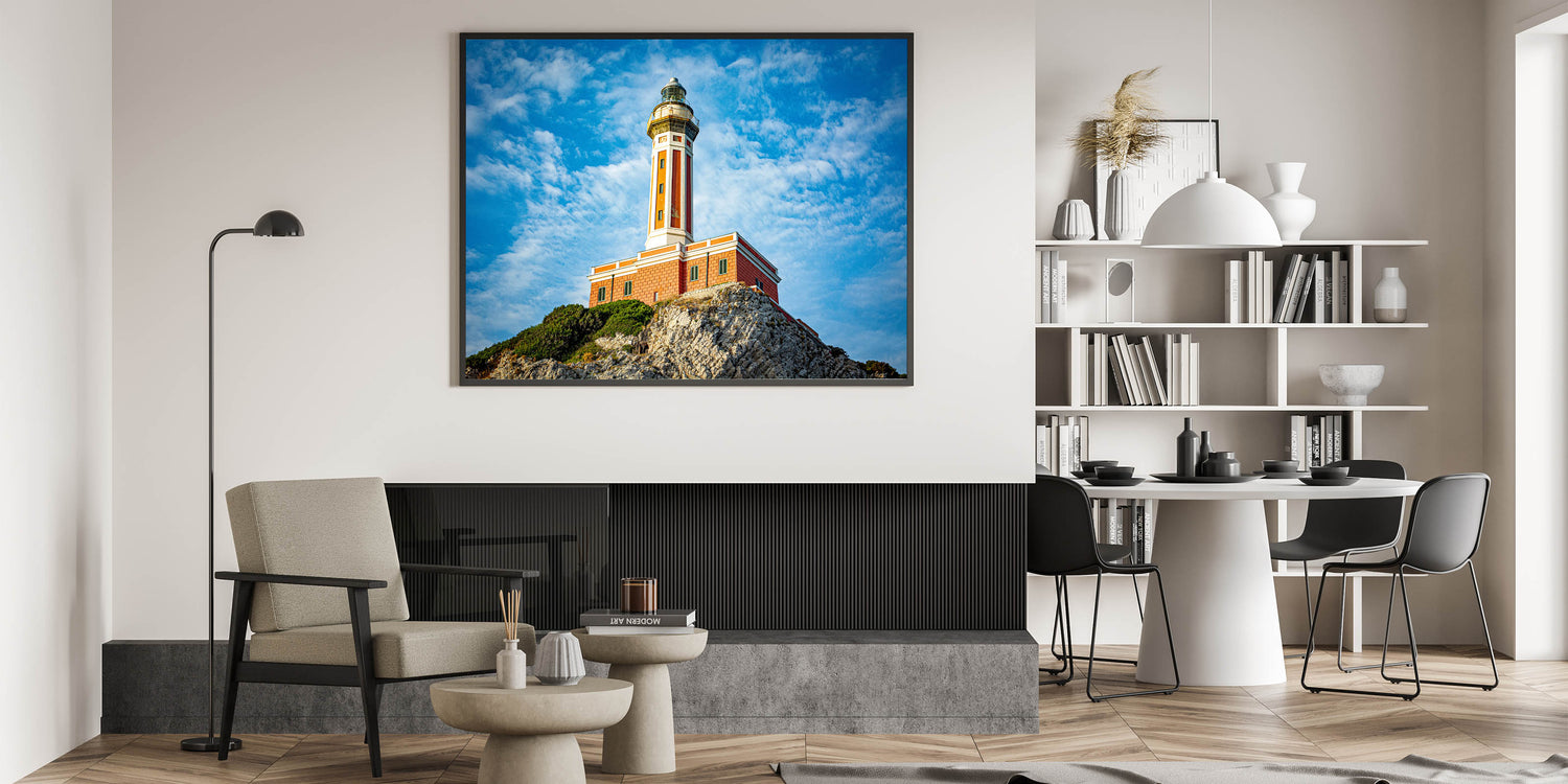 Add a touch of Mediterranean decor to your home with this captivating Italy scenic print, featuring a majestic lighthouse in Capri. This detailed artwork portrays the lighthouse standing proudly on a rocky cliff, framed by the deep blue sky and rugged coastline. Perfect for anyone who loves Capri coastal art or seeks to bring the charm of Italian landscape art into their space.