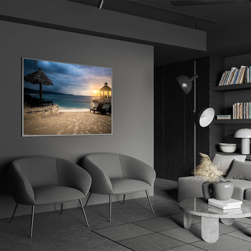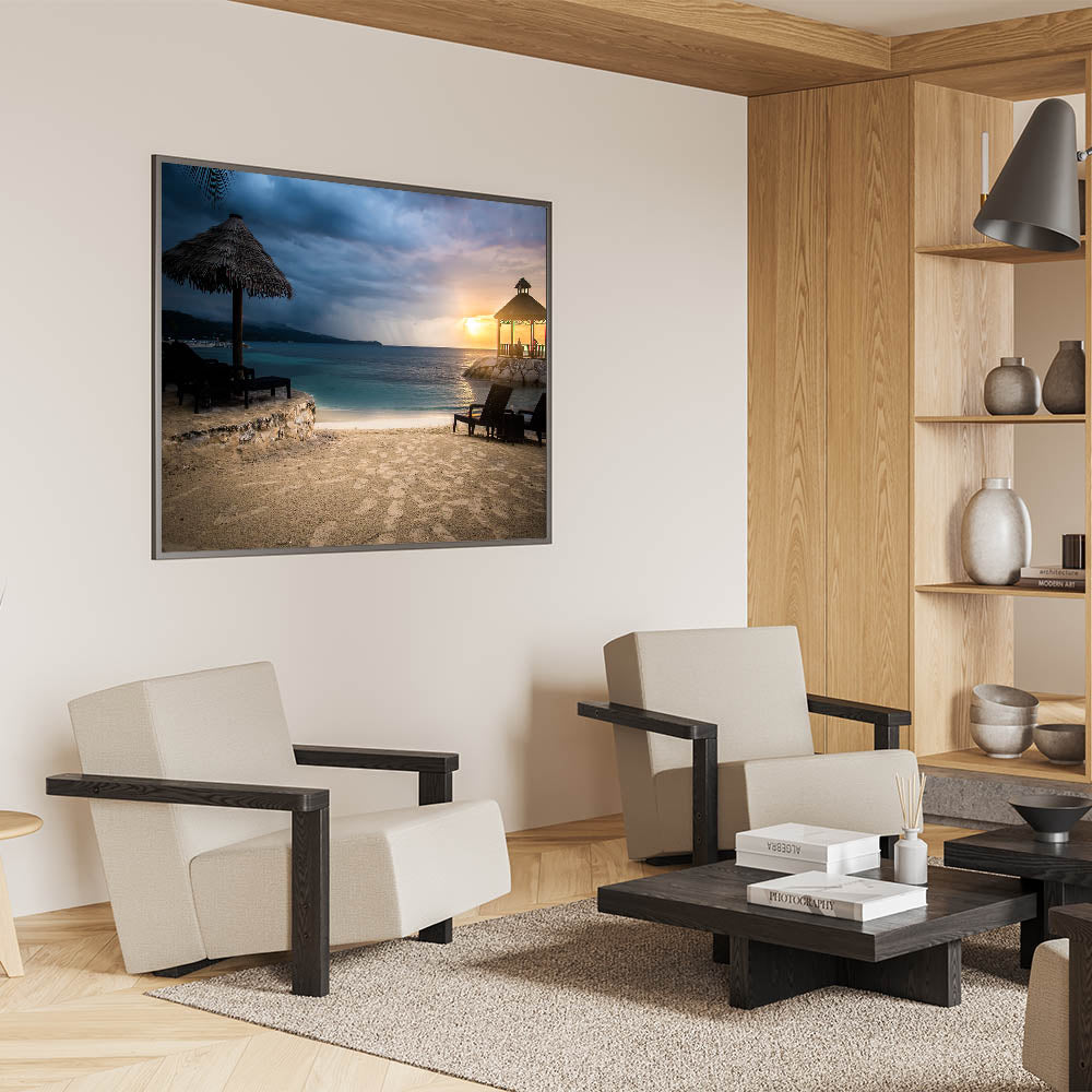 Relax and enjoy the tranquil beauty of a Jamaican beach at sunset with this captivating wall art. This piece features a serene beach setting with lounge chairs under a traditional thatched umbrella, all framed by the breathtaking colors of a Caribbean sunset. The peaceful pavilion in the distance adds a sense of calm and relaxation, making this artwork a perfect addition to any room that needs a touch of tropical warmth.