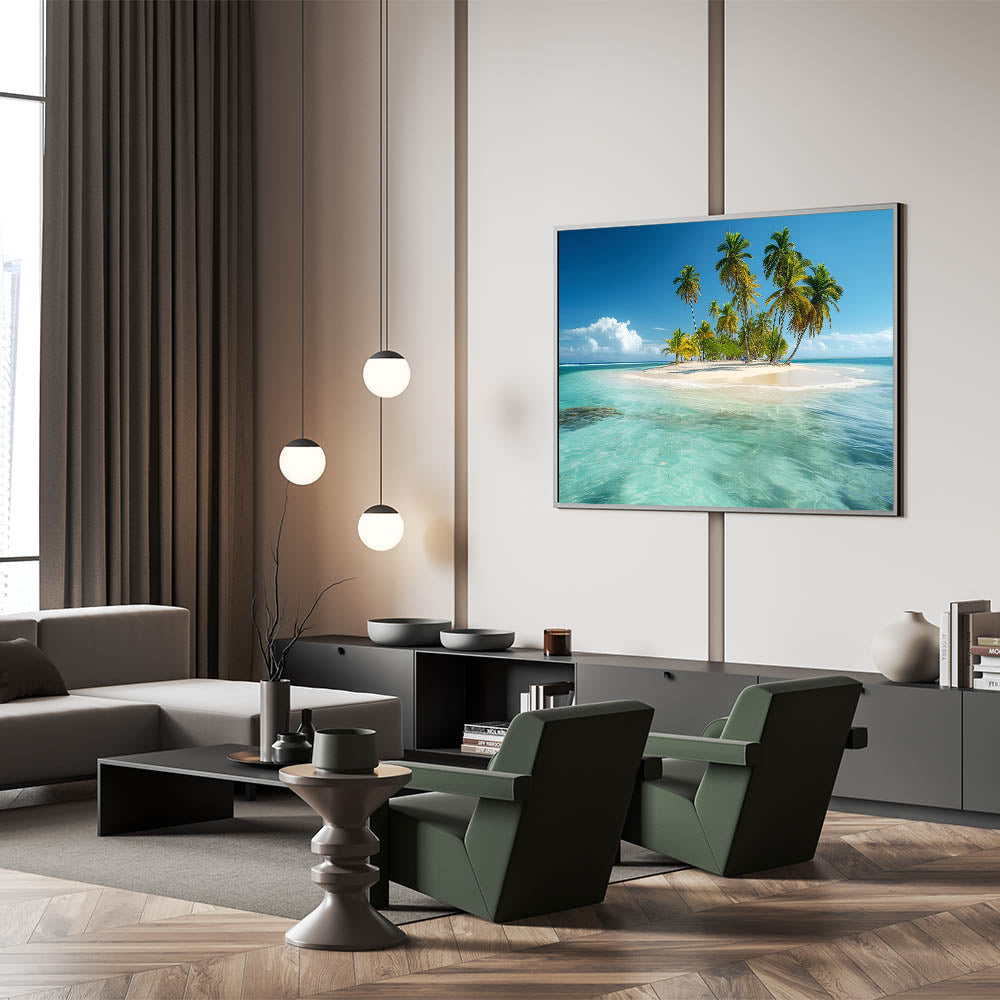 - Tropical Island Scene: A breathtaking image of a palm tree-covered island surrounded by turquoise waters, ideal for creating a serene and refreshing atmosphere.