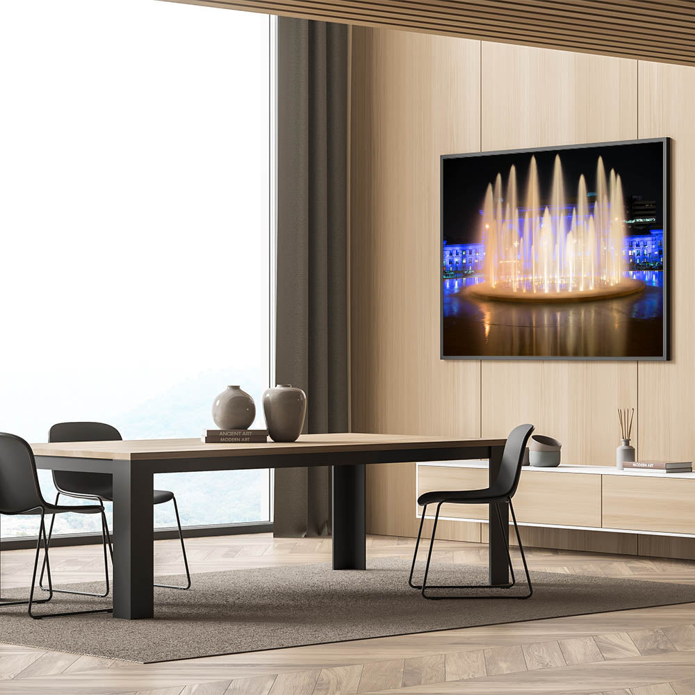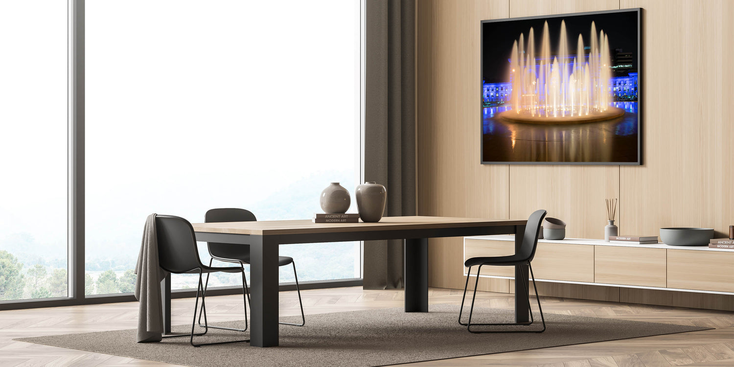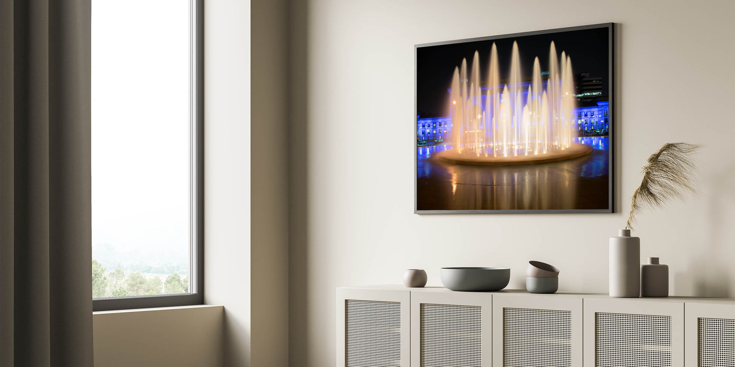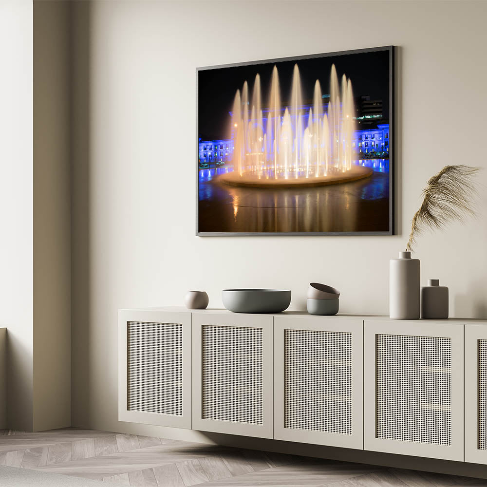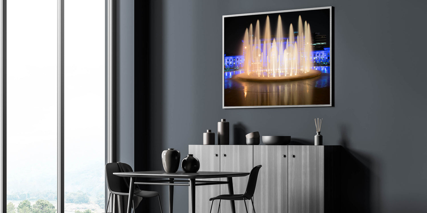 Add a touch of elegance and serenity to your space with this captivating Kansas City photography art, featuring the mesmerizing Union Station fountains illuminated at night. This piece captures the dynamic flow of water under a beautiful interplay of warm lights and soft blue hues, creating a scene that radiates tranquility and sophistication. Perfect for any room, this Missouri cityscape canvas brings the essence of Kansas City's vibrant nightlife right to your walls.