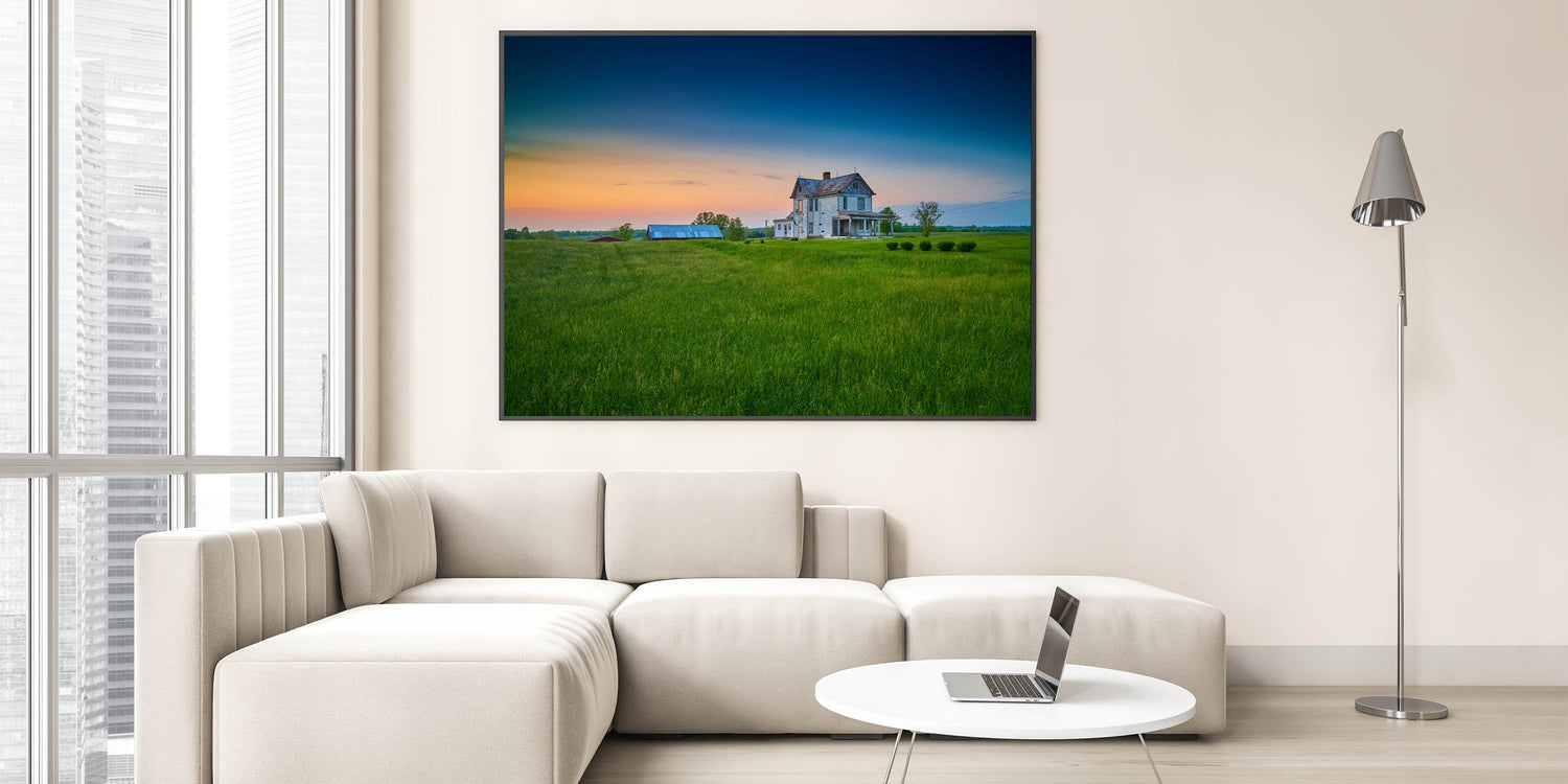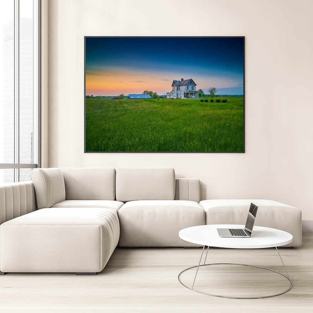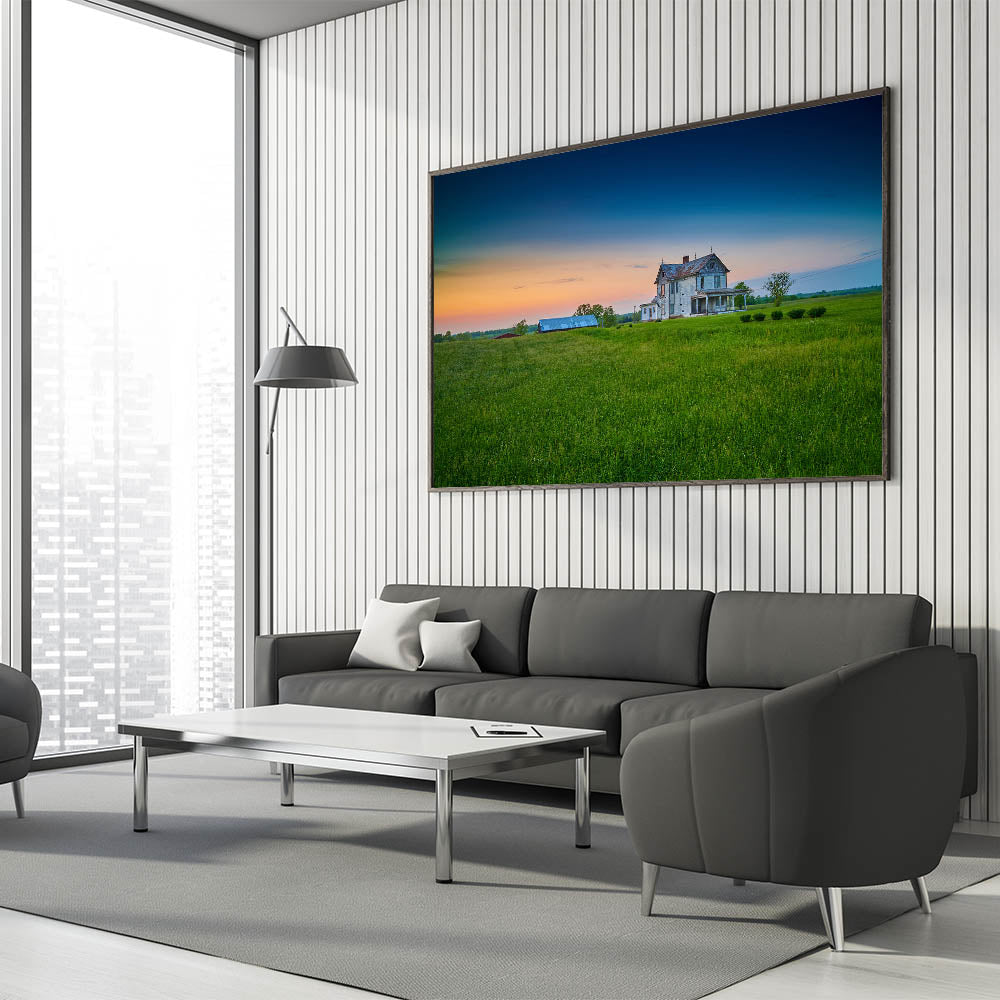 - High-quality materials: Premium finishes enhance the vibrant colors of the sunset and the rich textures of the farmhouse.