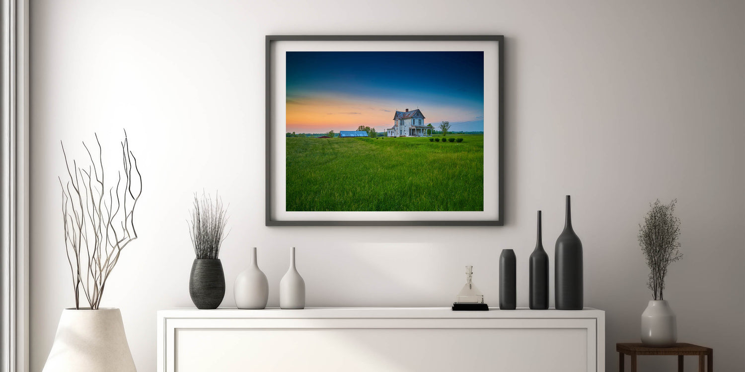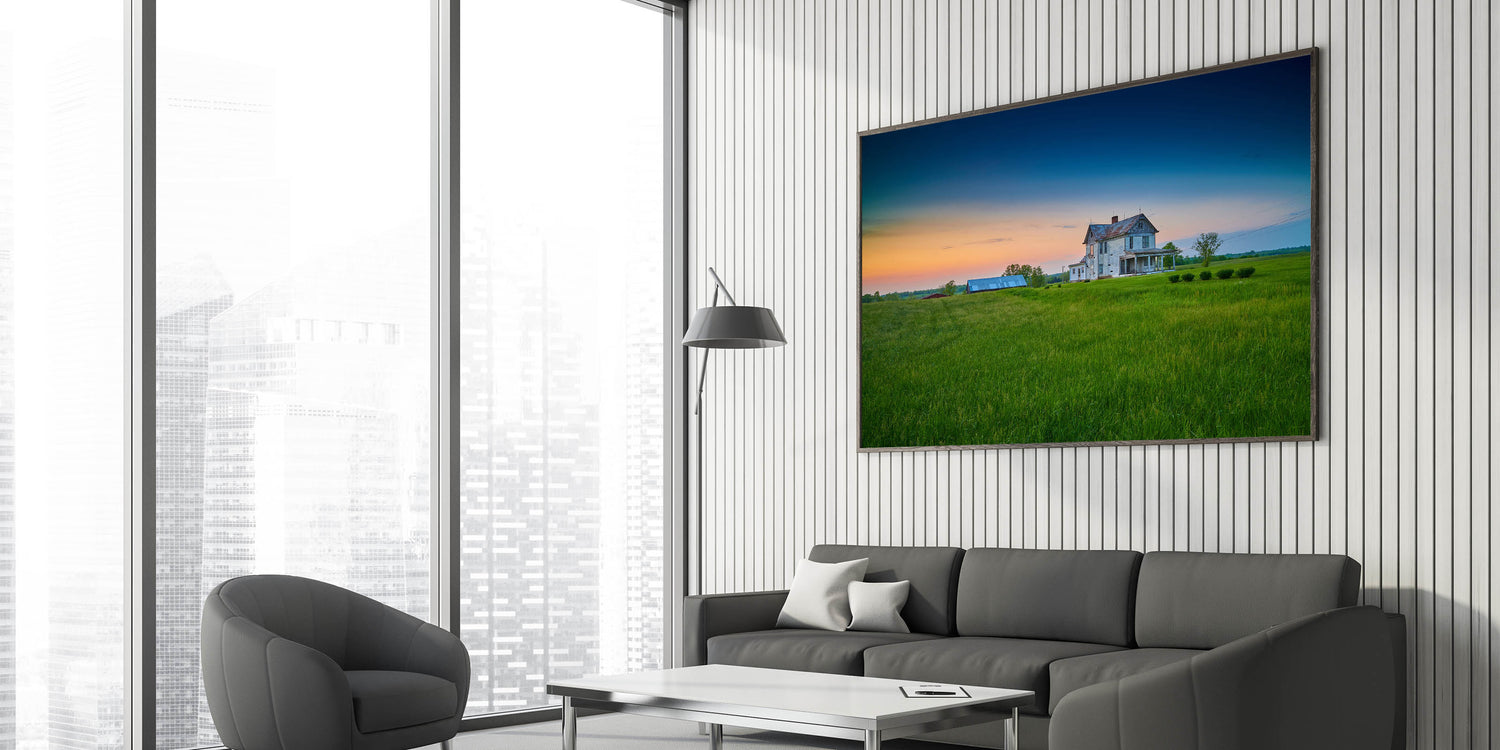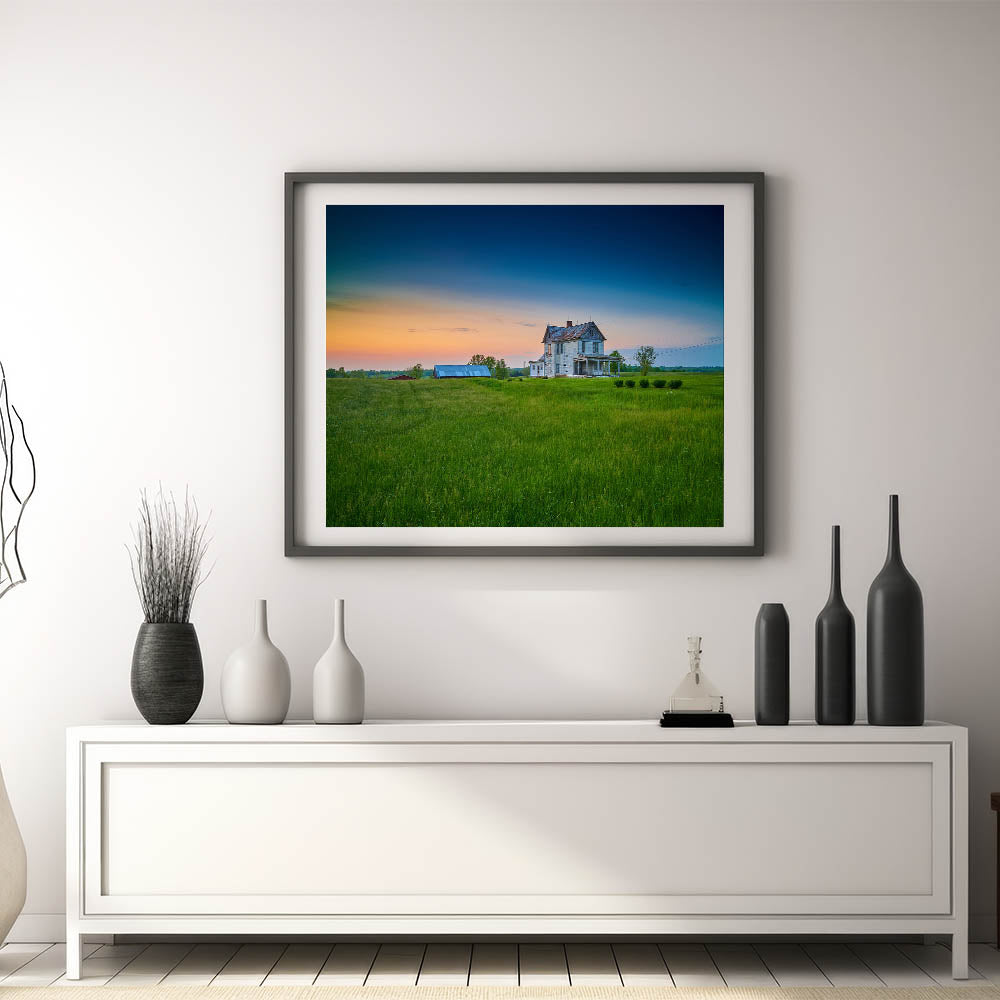 - High-quality materials: Premium finishes enhance the vibrant colors of the sunset and the rich textures of the farmhouse.