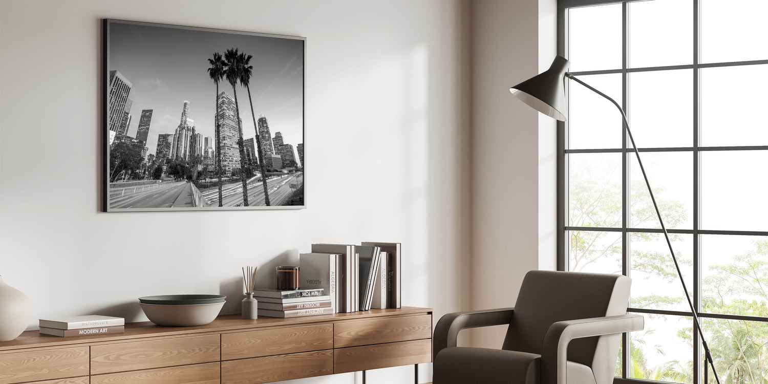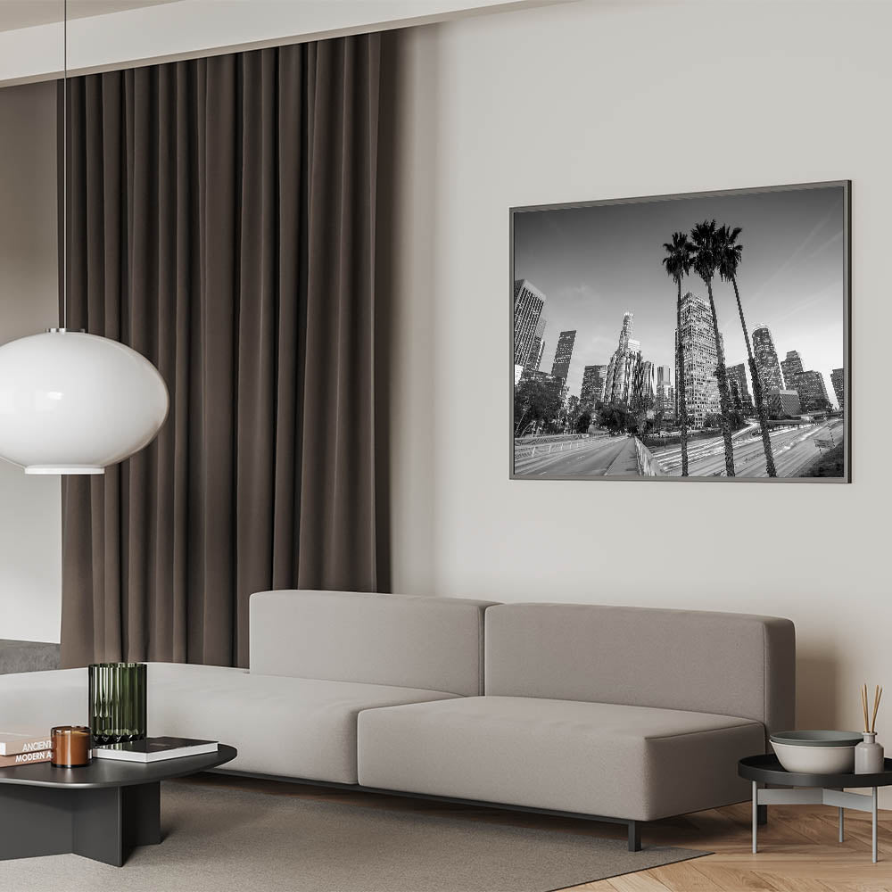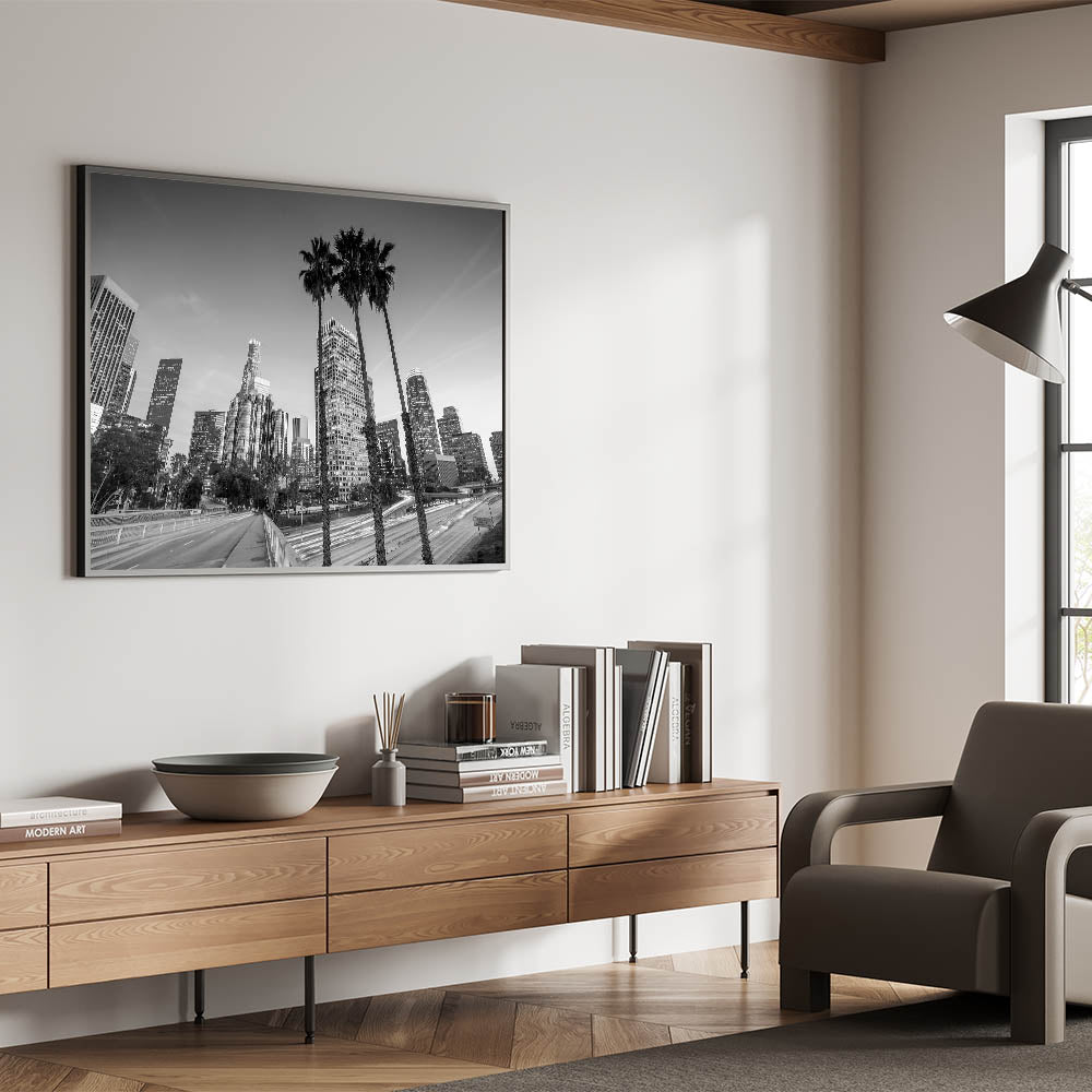 Immerse yourself in the pulse of Los Angeles with this captivating night cityscape. The blend of bold light trails and towering skyscrapers evokes a sense of movement, making this print a striking addition to any space. Ideal for those who love the energy of LA and want to bring that fast-paced city vibe into their home.