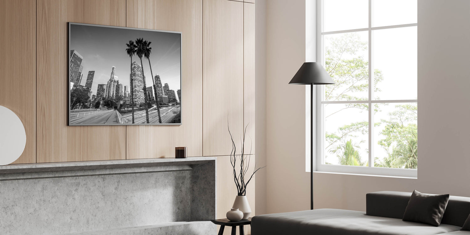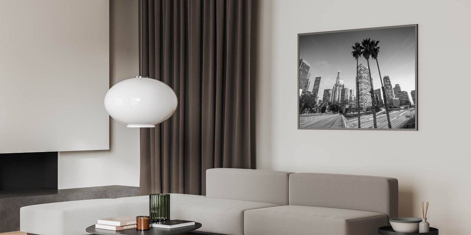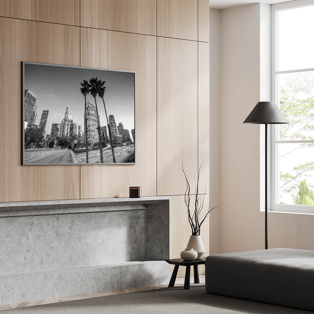 Immerse yourself in the pulse of Los Angeles with this captivating night cityscape. The blend of bold light trails and towering skyscrapers evokes a sense of movement, making this print a striking addition to any space. Ideal for those who love the energy of LA and want to bring that fast-paced city vibe into their home.