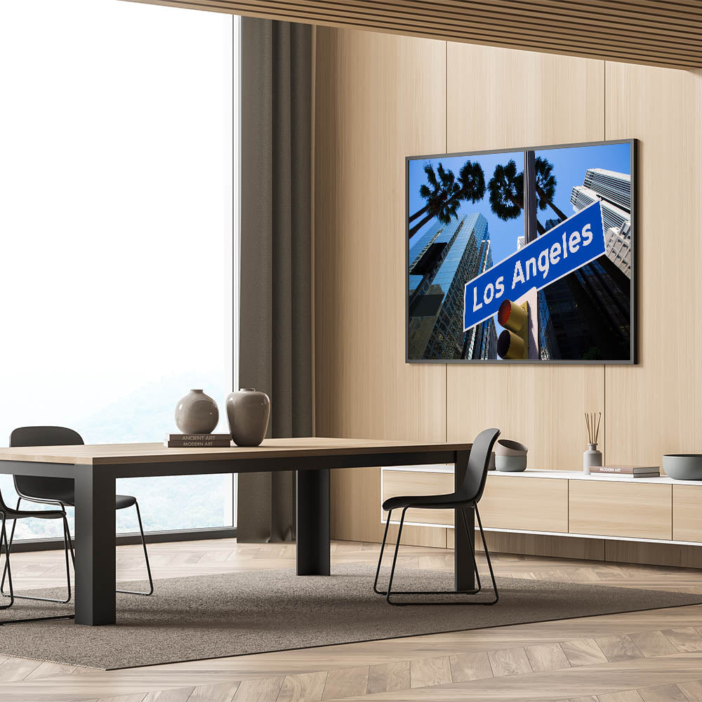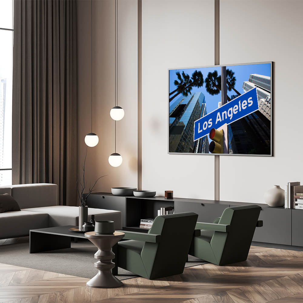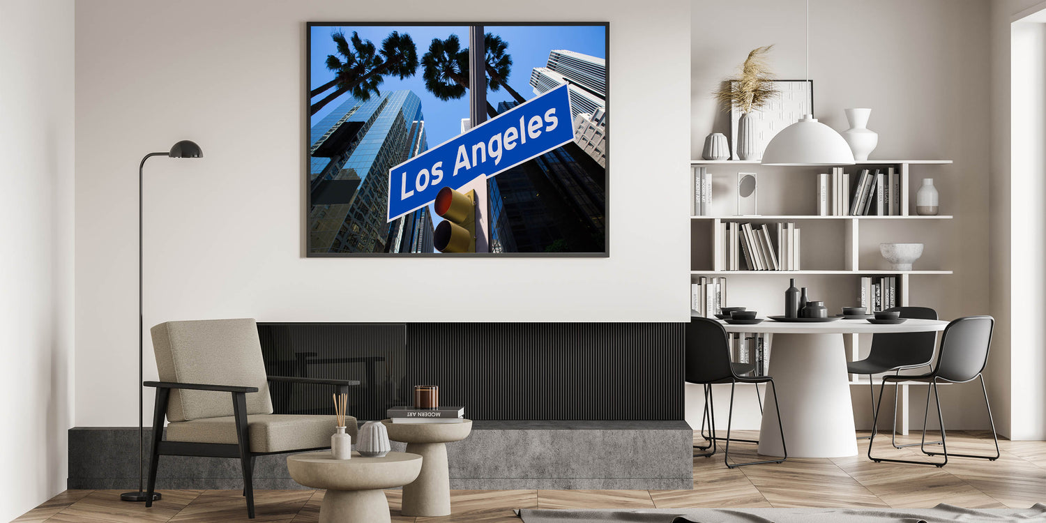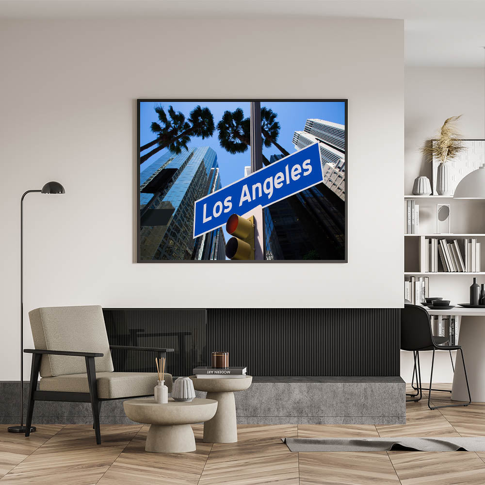 This dynamic artwork showcases the iconic Los Angeles street sign against a backdrop of towering, modern skyscrapers and palm trees swaying in the breeze. The vivid blue skies and reflective glass buildings capture the energetic spirit of the city, offering a bold representation of LA's urban landscape. Perfect for anyone who loves the unique charm of Los Angeles, this piece blends urban design with the city's unmistakable vibe.