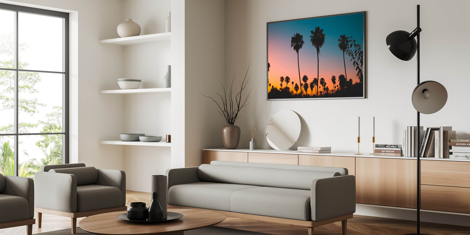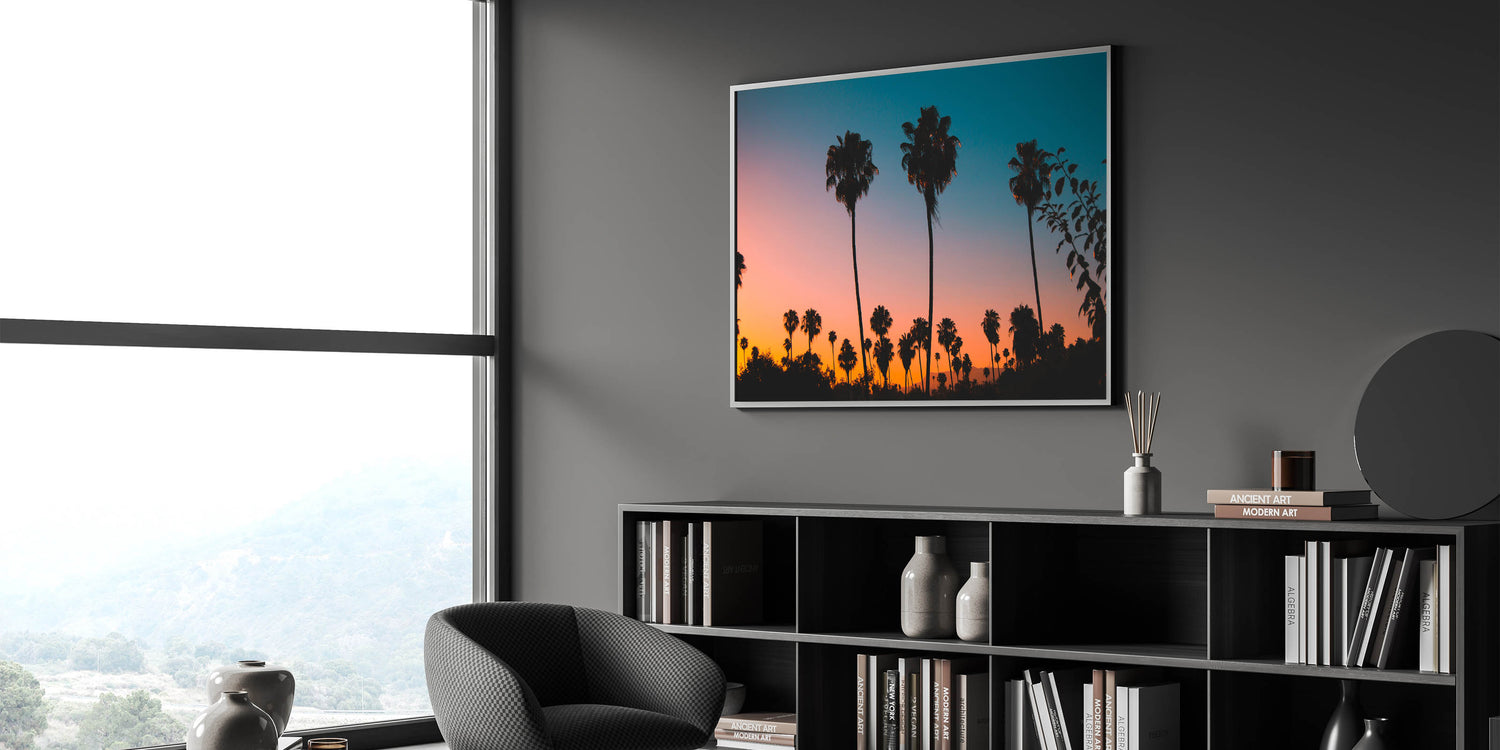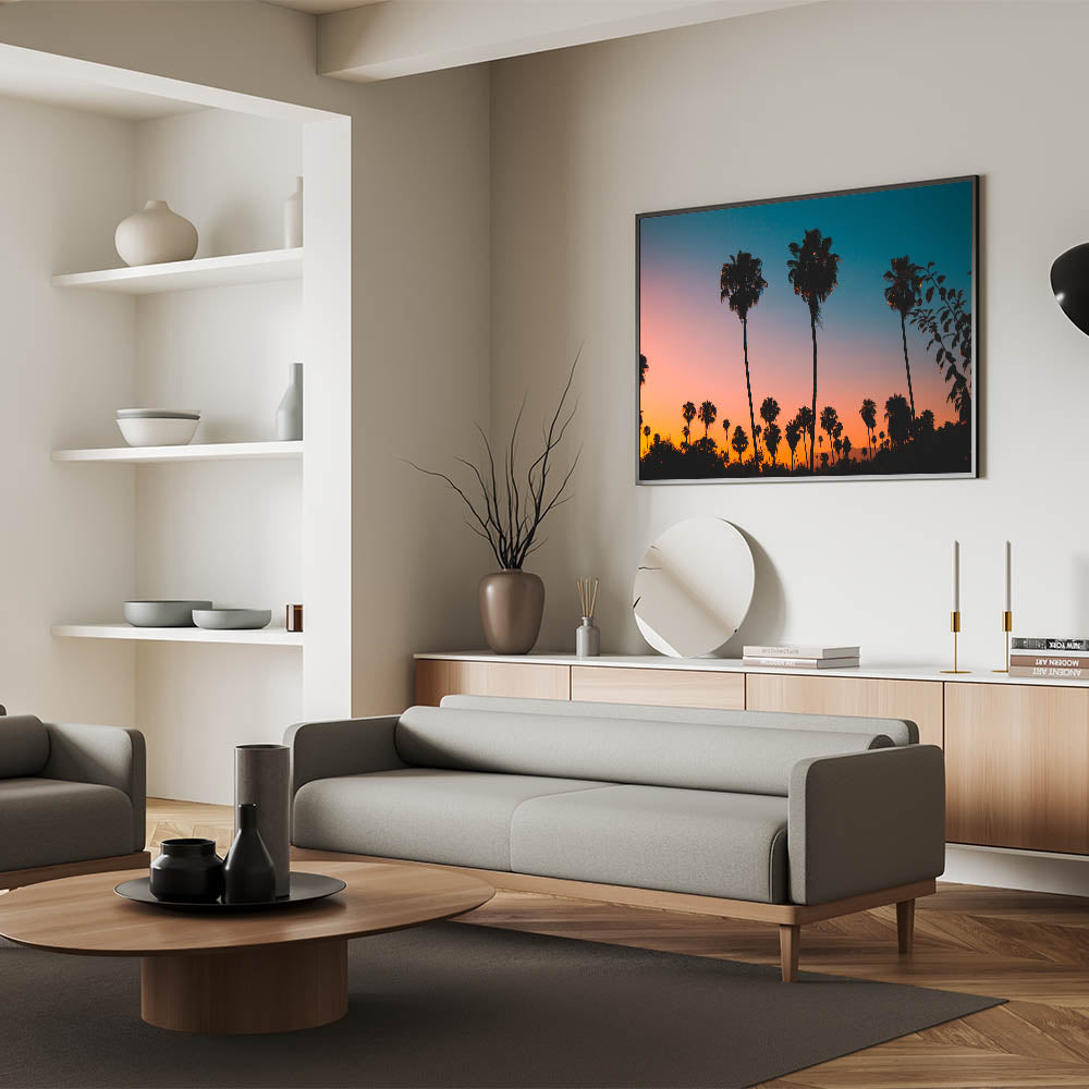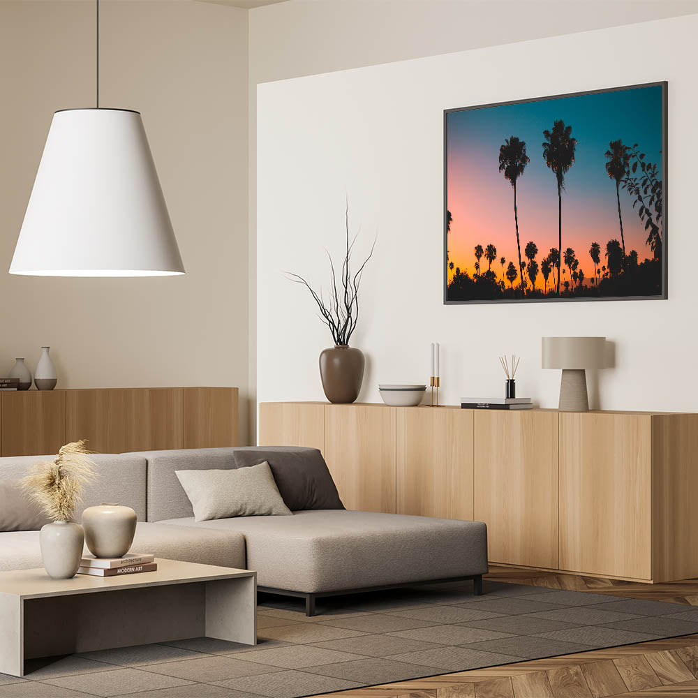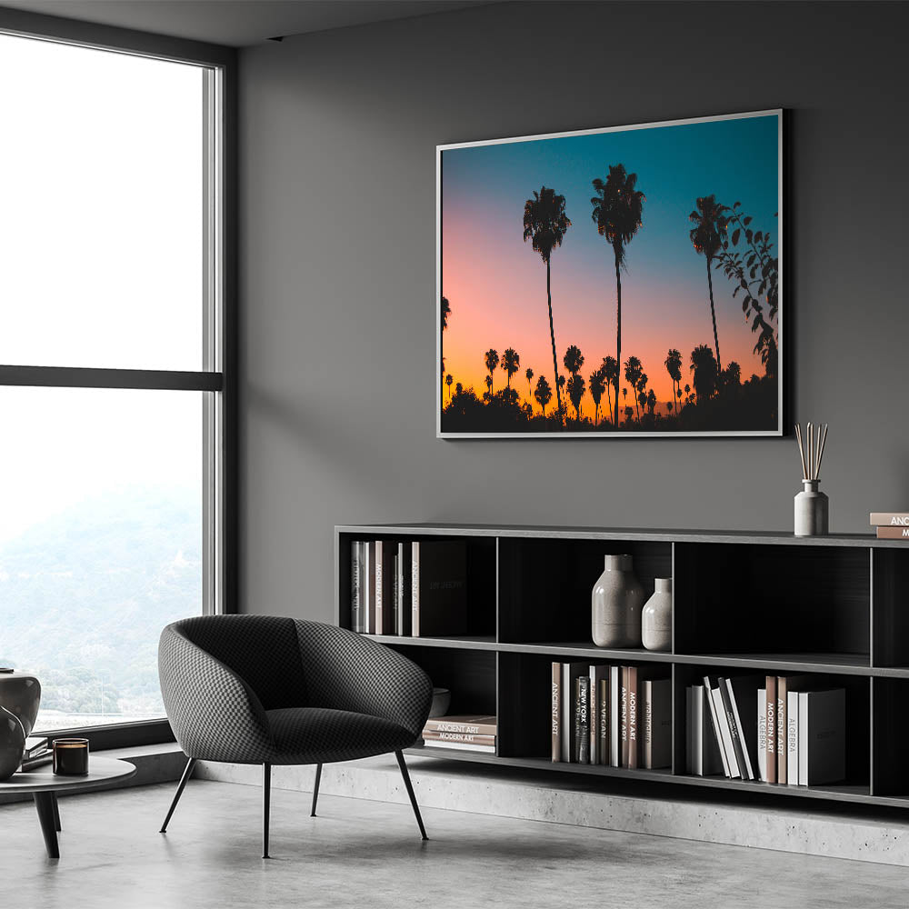 Transform your space with the calming hues of this LA sunset artwork. The silhouetted palm trees against a vibrant sky bring a sense of tranquility and beauty, making it a perfect addition to any home or office. Ideal for those who want to capture the essence of California sunsets.