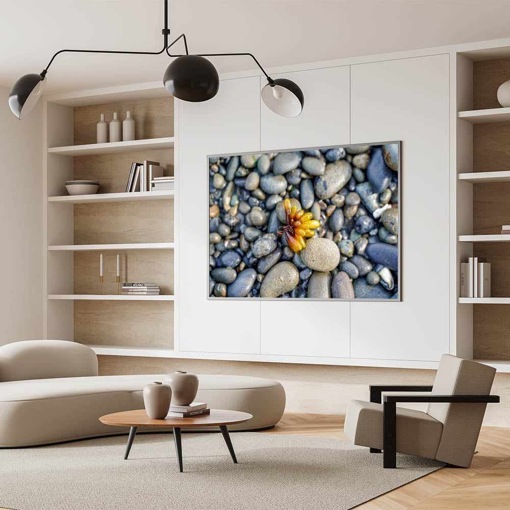 Bring the intricate beauty of nature into your space with this stunning Olympic National Park wall art. Featuring a detailed close-up of smooth pebbles and golden seaweed washed ashore, this piece captures the simplicity and elegance of the Pacific Northwest’s coastal treasures. The rich textures and earthy tones of the stones contrasted with the warm hues of the seaweed make this artwork a unique and captivating addition to any home.