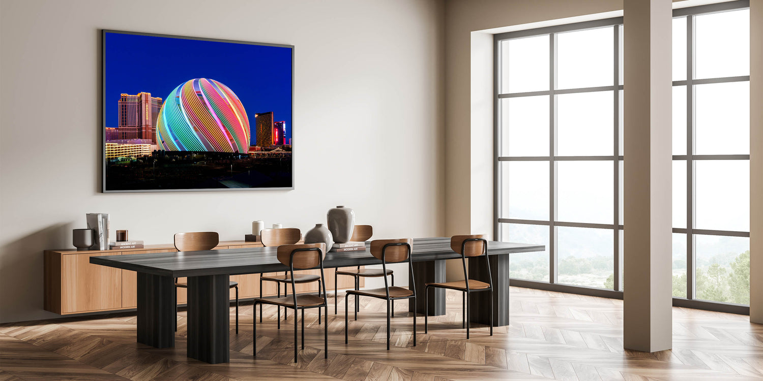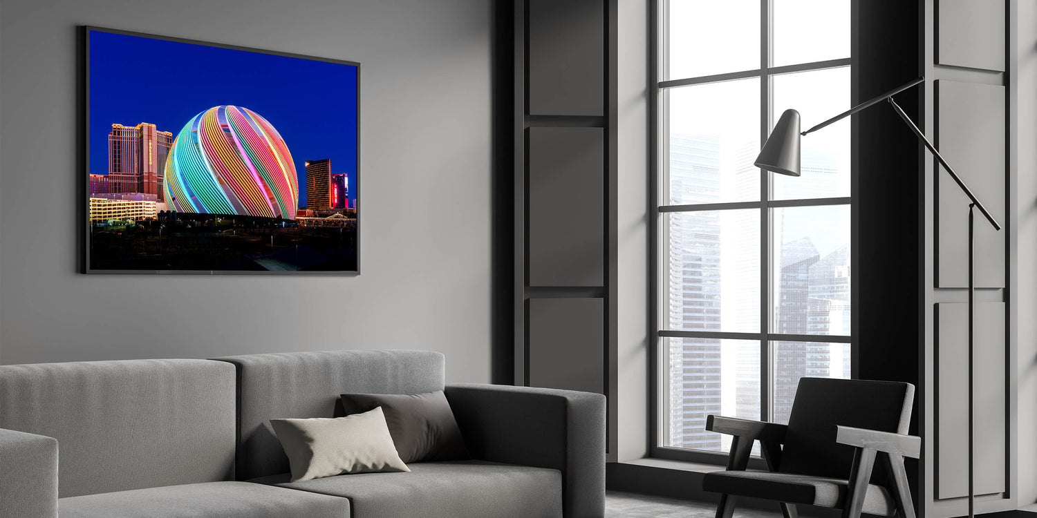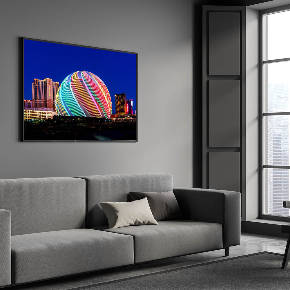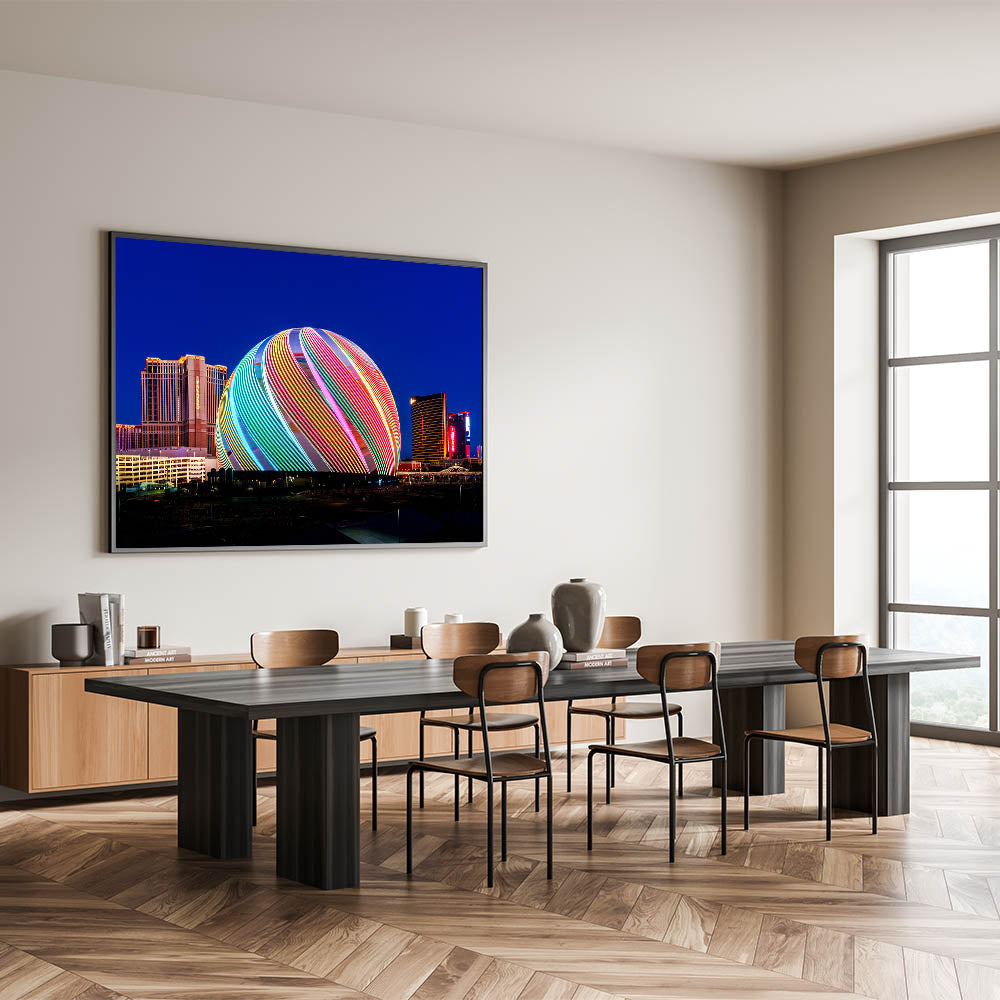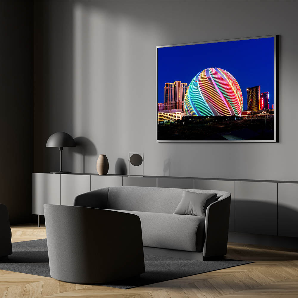 Add a burst of color and energy to your space with this vibrant Las Vegas wall art, showcasing the mesmerizing sphere at the heart of the Vegas skyline. The iconic building, illuminated with swirling neon lights, captures the spirit of the city’s modern architecture and electrifying nightlife. The rich blue sky in the background enhances the contrast, making this artwork a bold statement piece for any room.
