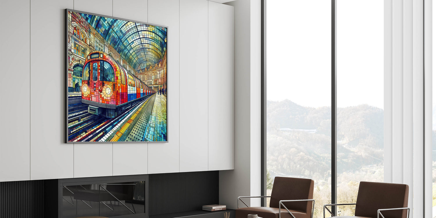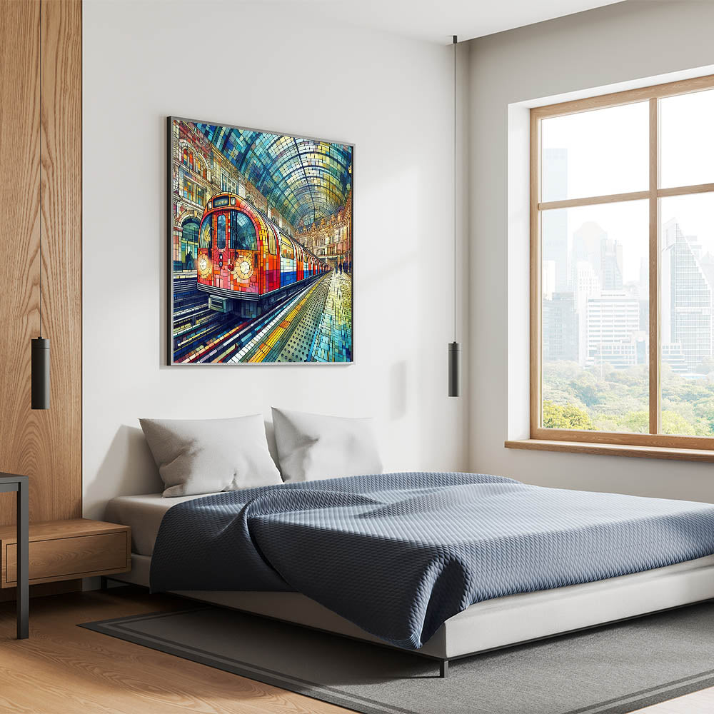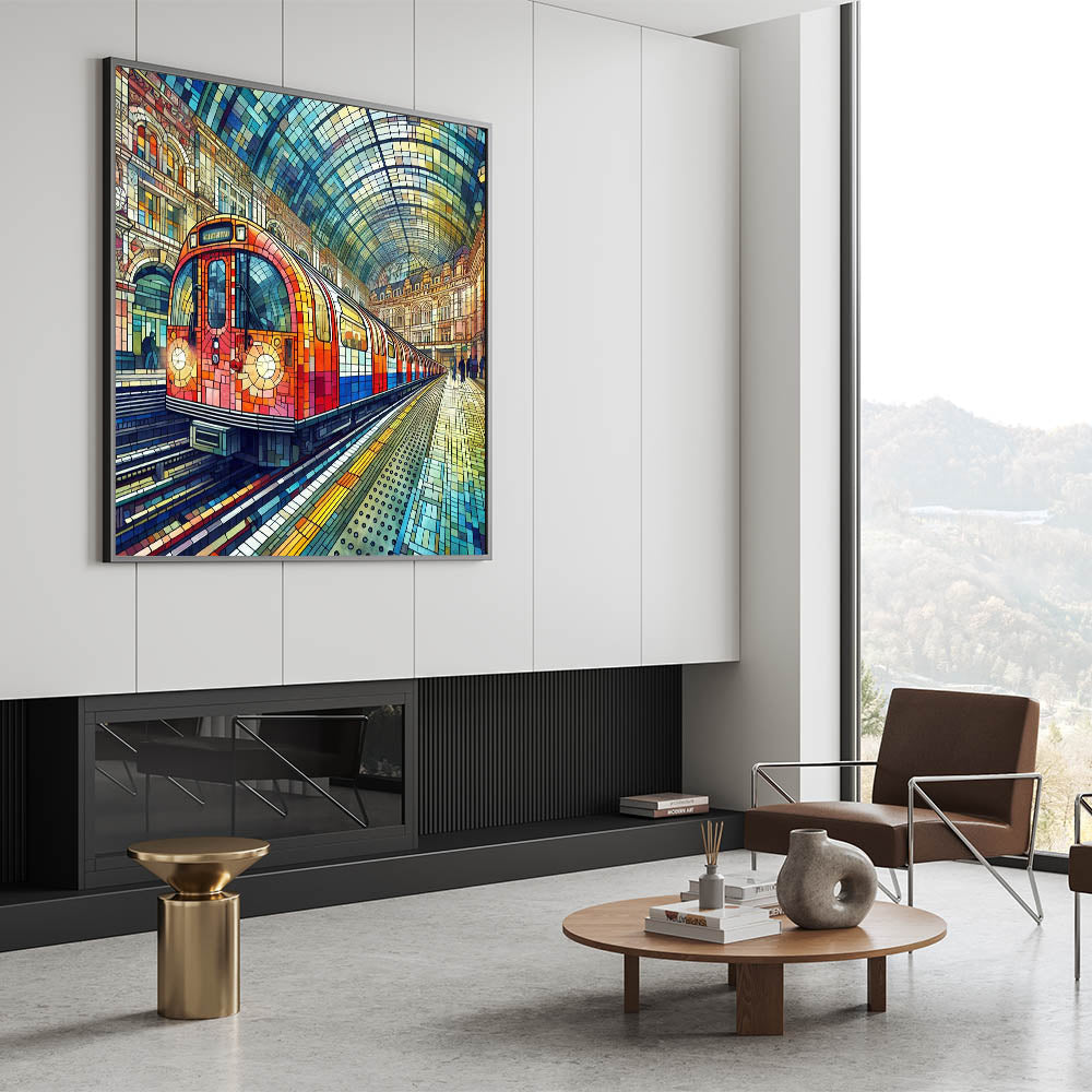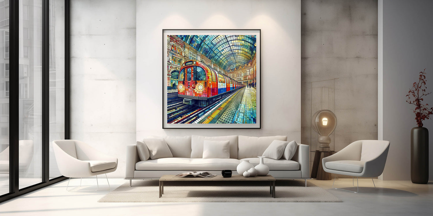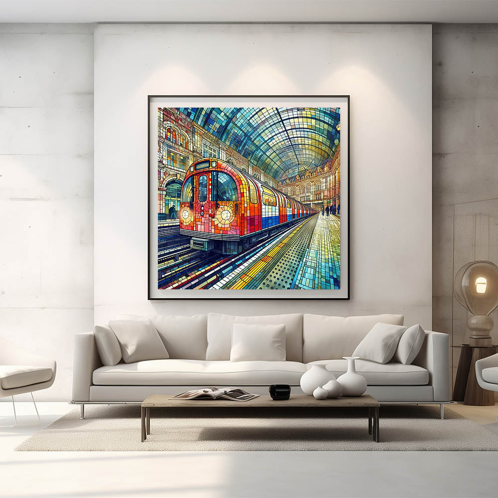 Immerse yourself in the vibrant energy of London with this stunning mosaic art print of King's Cross Tube Station. The intricate stained glass style transforms the classic London Underground train into a work of art, bringing to life the architecture and energy of the station in dazzling color. Perfect for lovers of contemporary street art and London’s rich transport history, this piece adds a unique, dynamic touch to any space.