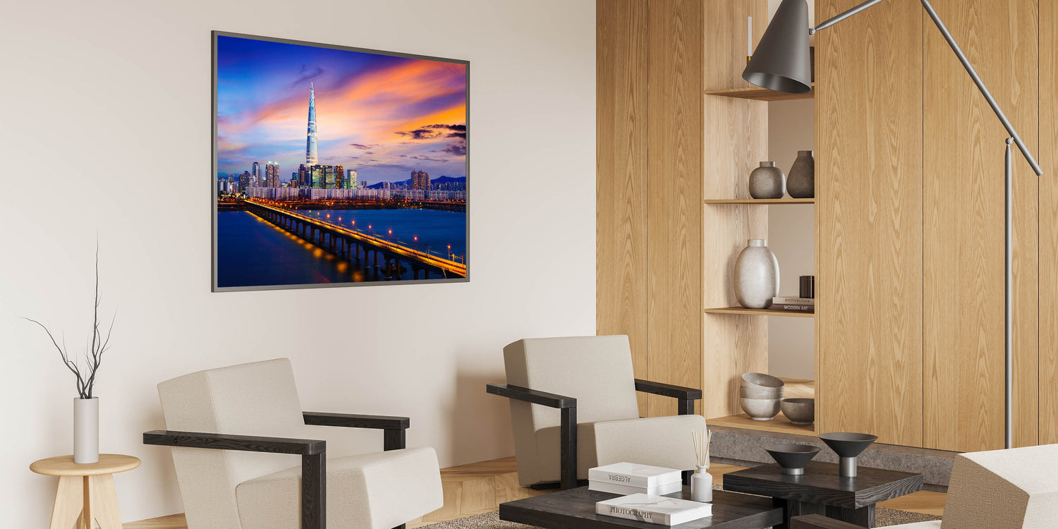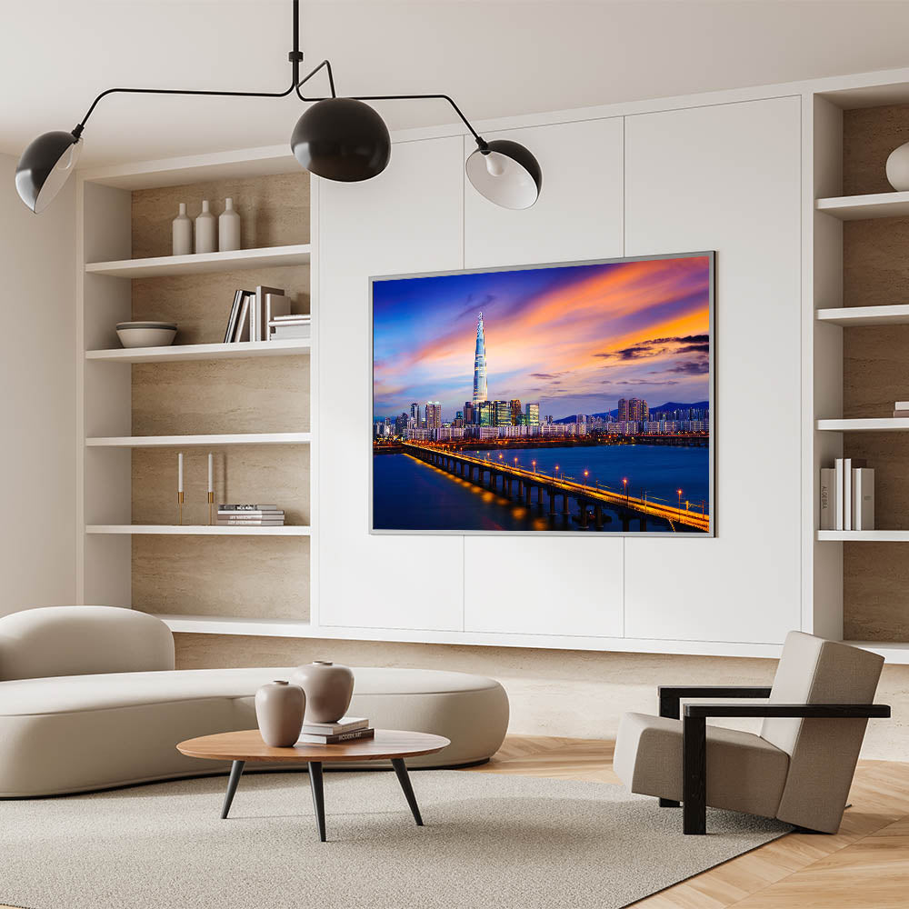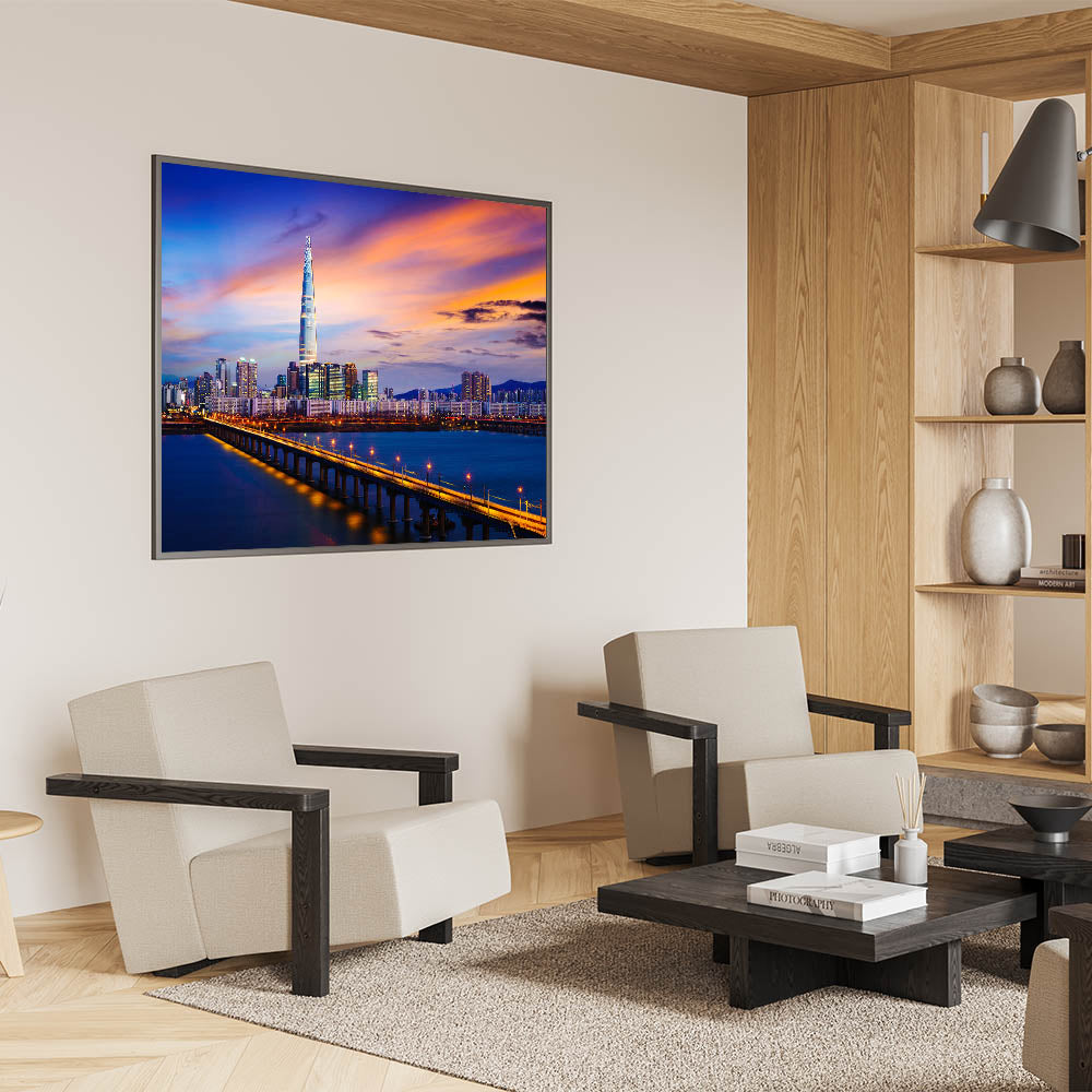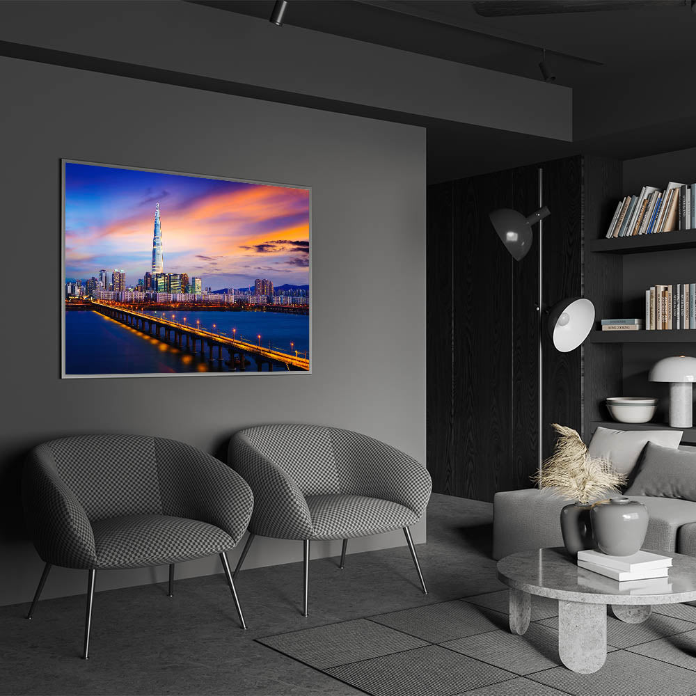 This stunning wall art captures the beauty of Seoul’s skyline at dusk, with the iconic Lotte World Tower towering over the city. The soft sunset hues blend effortlessly with the shimmering city lights, while the Han River and the illuminated bridge add depth to the composition. Perfect for fans of modern architecture and vibrant cityscapes, this artwork brings the energy and beauty of Seoul into your home.