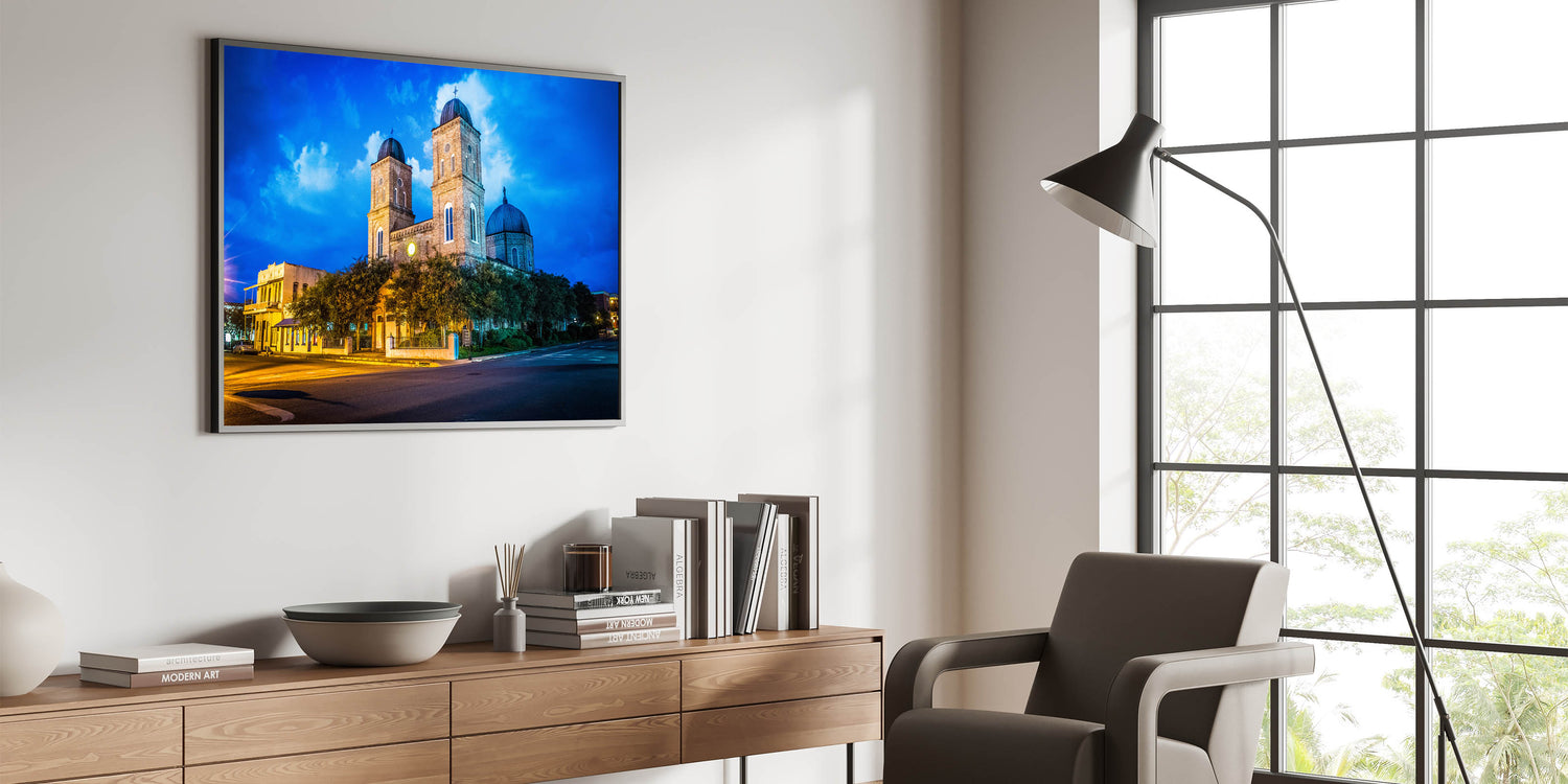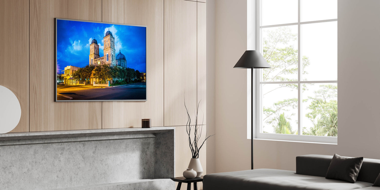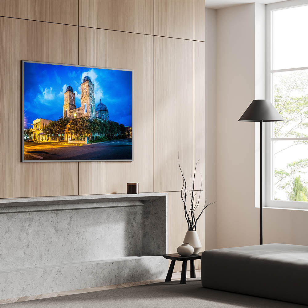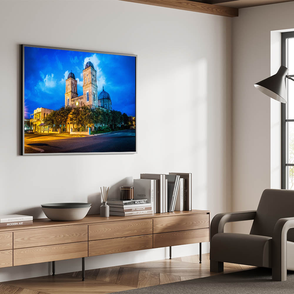 Celebrate the rich architectural history of Louisiana with this vibrant wall art featuring a historic church illuminated against a deep blue twilight sky. The glowing lights cast a warm hue over the building’s detailed brickwork, creating a beautiful contrast with the dramatic evening sky. This artwork captures both the cultural and architectural essence of Louisiana, making it a perfect addition for lovers of historic and scenic art.