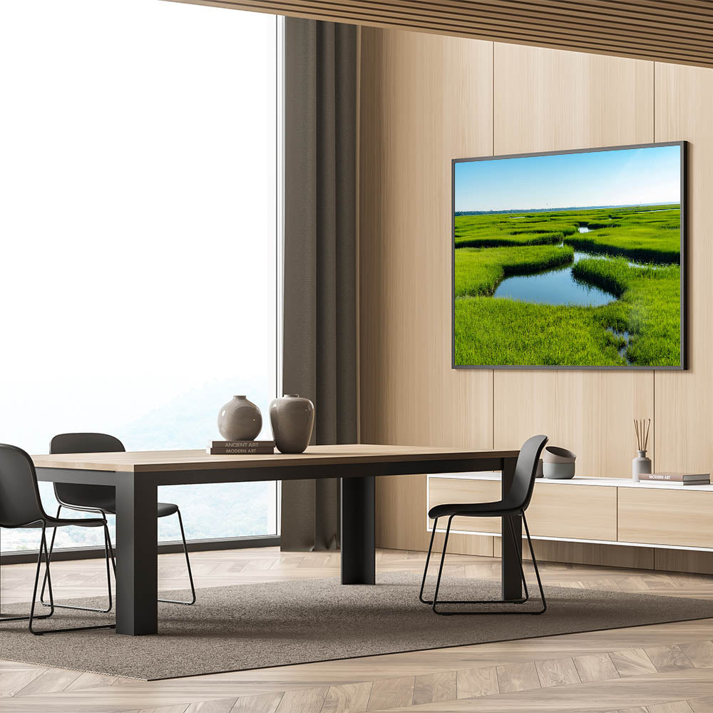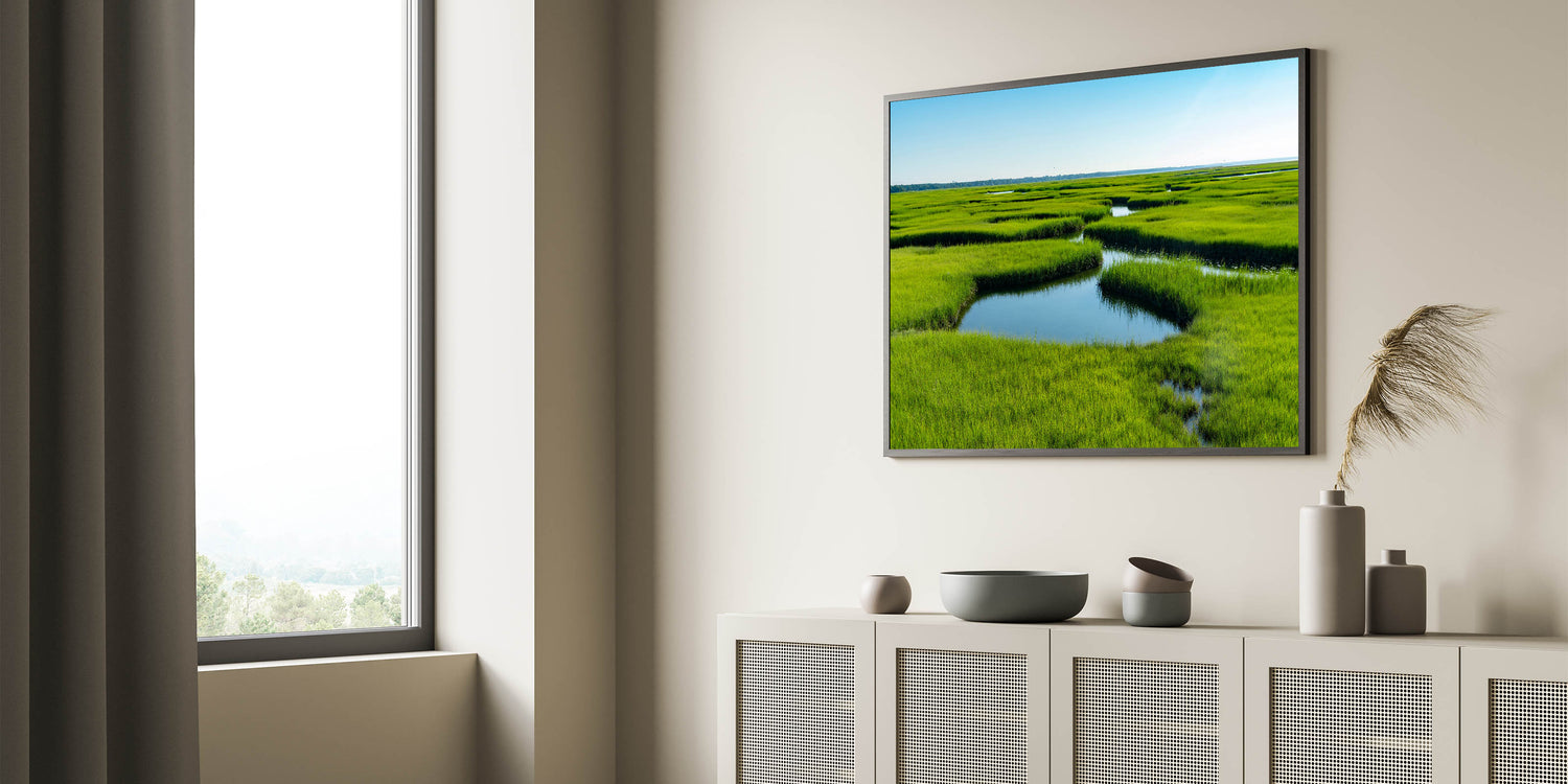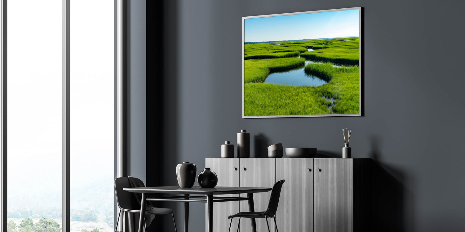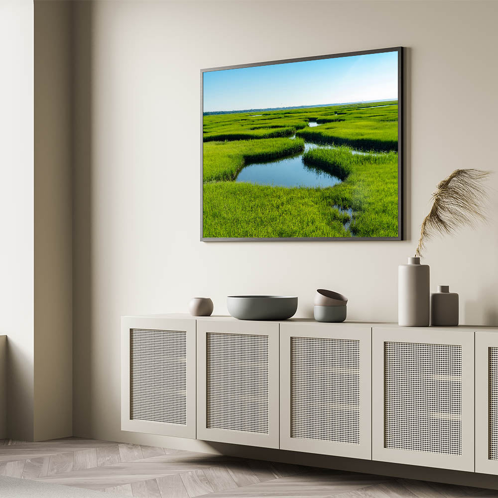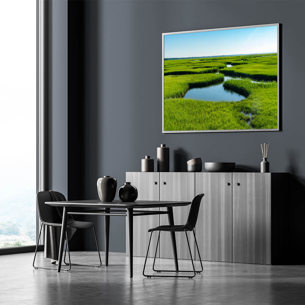 Bring the freshness of nature into your space with this stunning marsh and swamp wall art, featuring a lush green marshland stretching into the horizon. The vivid greenery contrasted with the calm, reflective waters creates a serene and peaceful atmosphere, perfect for brightening up any room in your home.