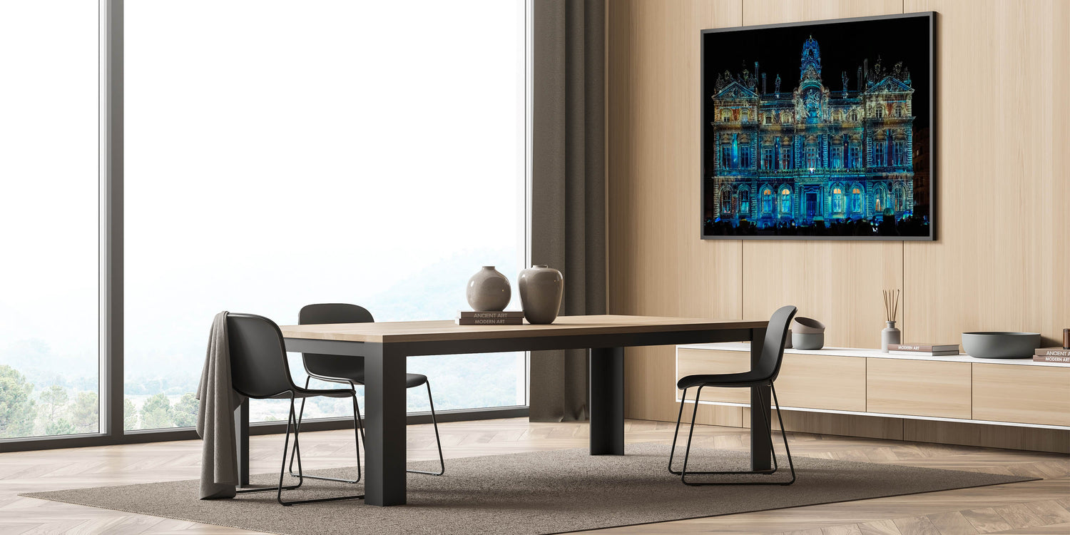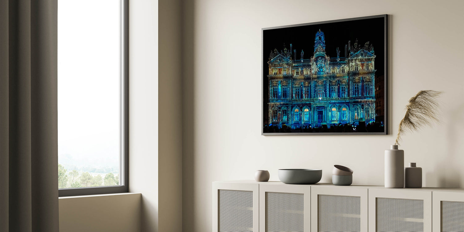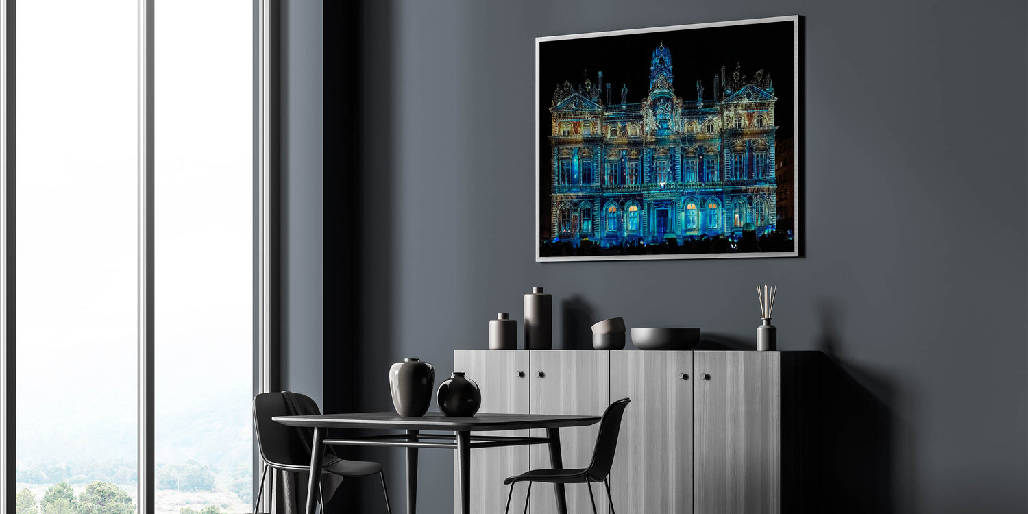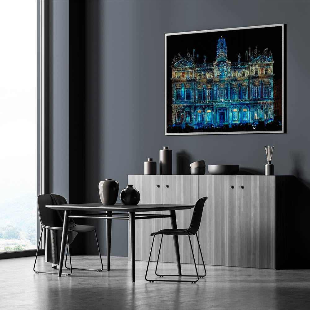 Celebrate Lyon’s magical Festival of Lights with this striking Lyon cityscape print, featuring the illuminated Hôtel de Ville bathed in a dazzling display of blue lights. This captivating artwork perfectly captures the essence of Lyon’s rich cultural heritage and artistic celebrations. Ideal for lovers of French wall decor and iconic French landmarks, this piece brings a festive yet elegant touch to any room.