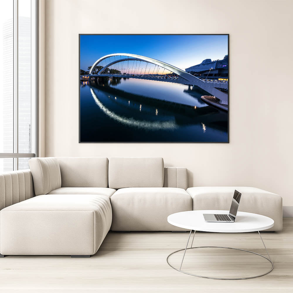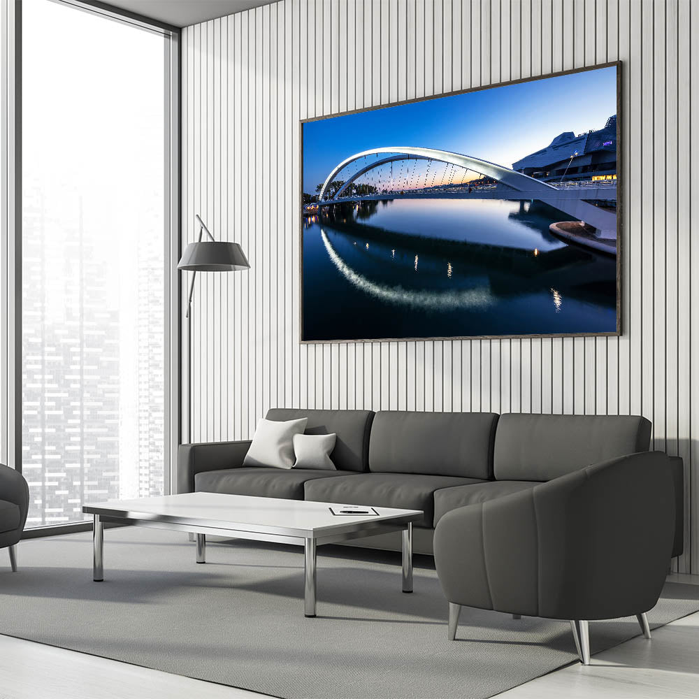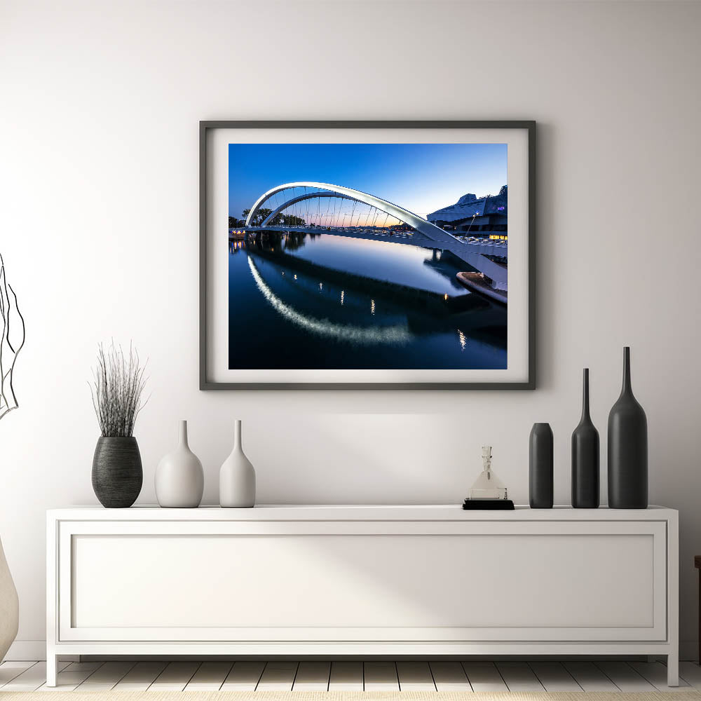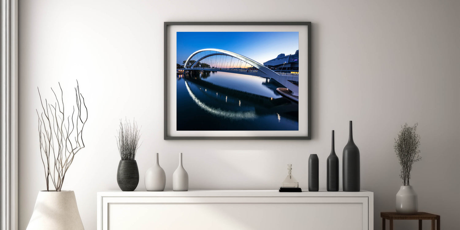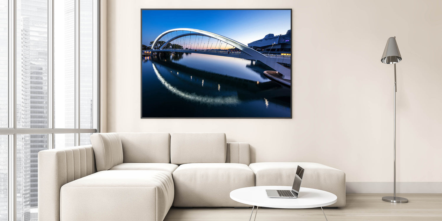 Bring a touch of modern elegance to your space with this Lyon cityscape print, showcasing the stunning architectural beauty of Lyon's contemporary bridge over the river at twilight. The smooth lines of the bridge, reflecting gracefully over the water, combined with the serene colors of the evening sky, make this piece perfect for those who appreciate modern art and urban landscapes. This scenic Lyon artwork captures the harmony between modern design and nature, creating a calming yet stylish atmosphere.