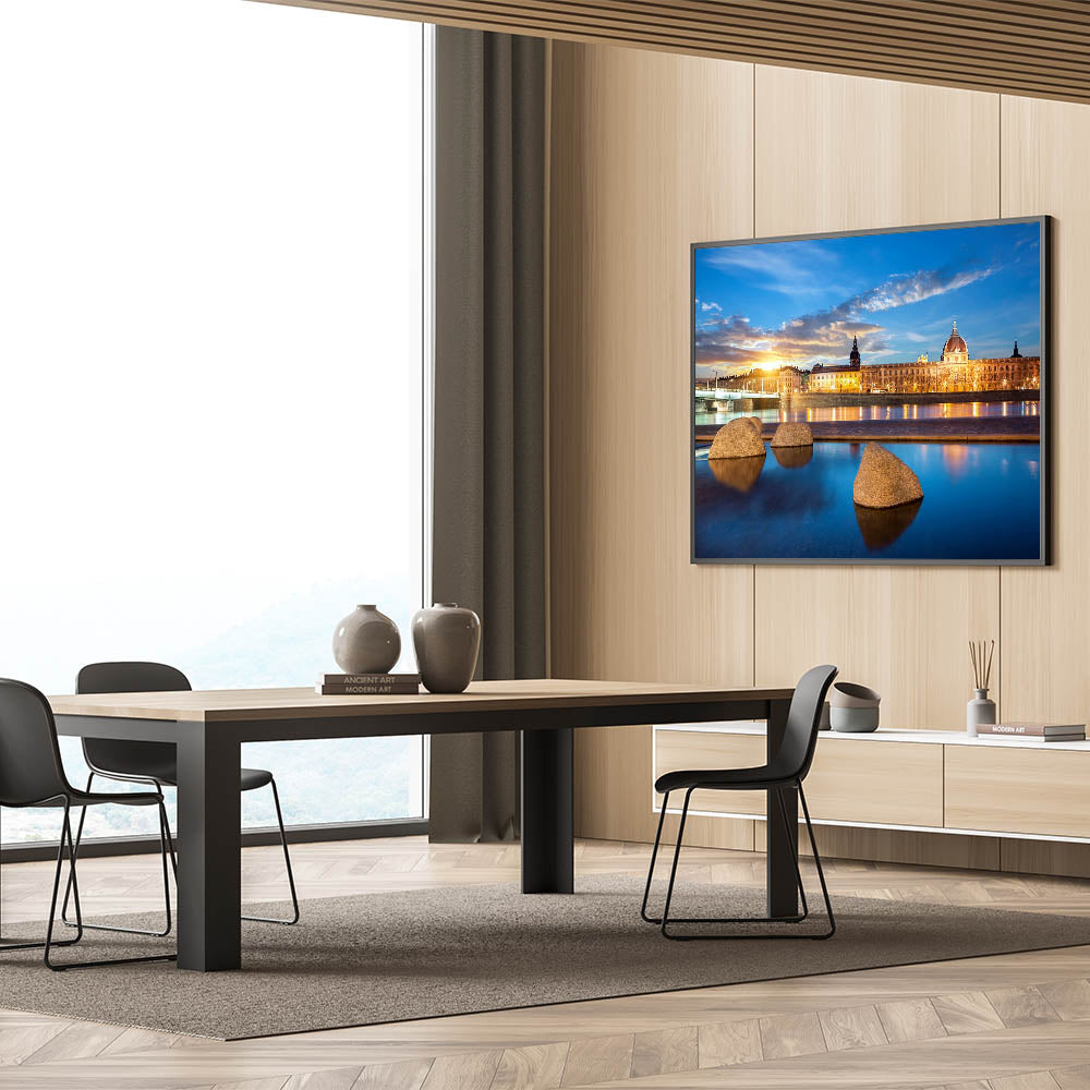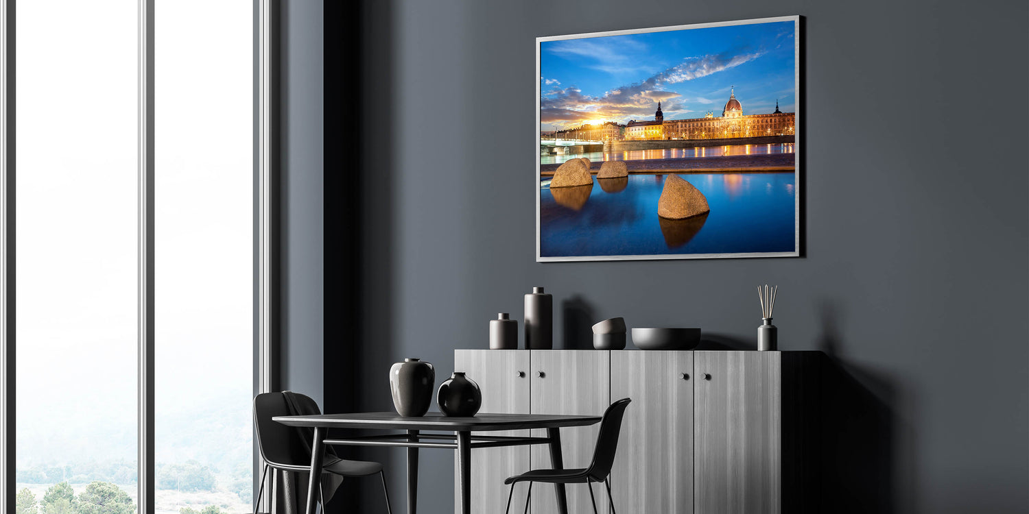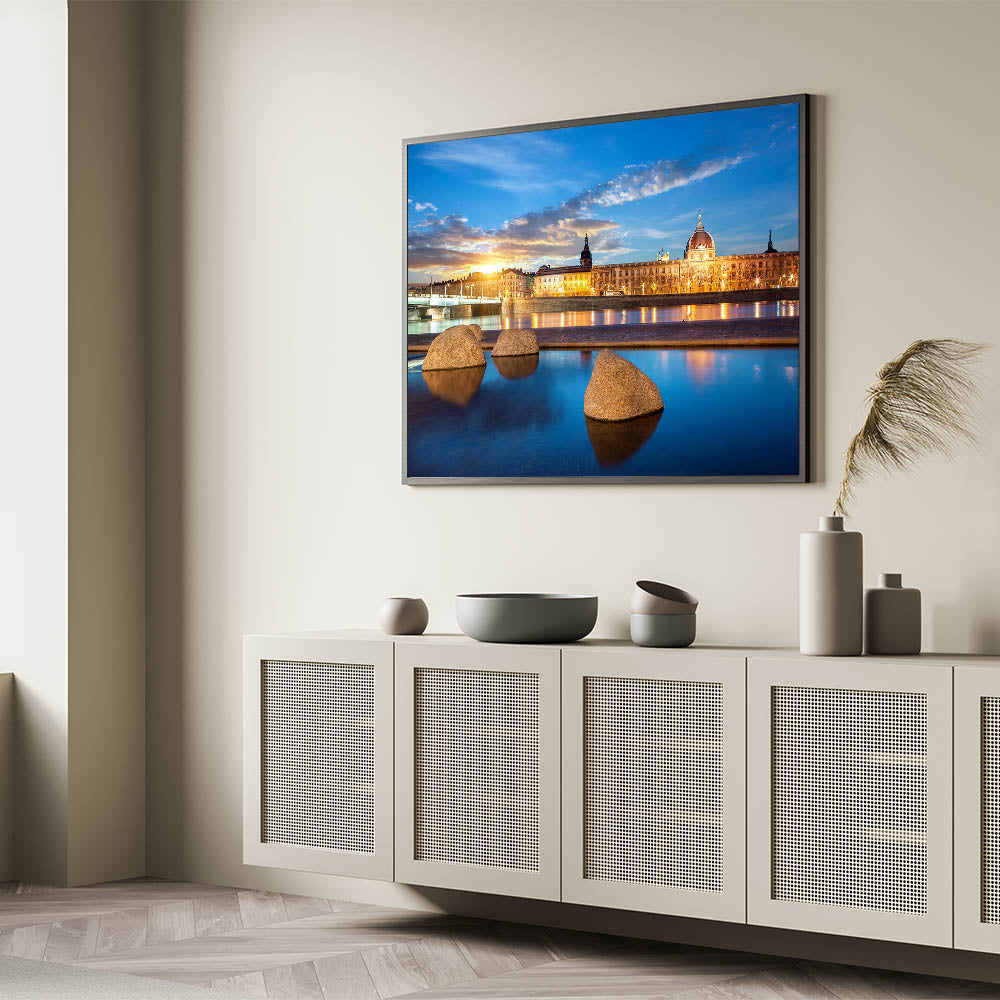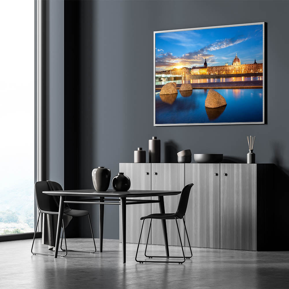 Embrace the beauty of Lyon with this captivating Lyon cityscape print showcasing the stunning sunset over the Rhône River. This beautiful artwork captures the golden glow of the setting sun, reflecting off the river and the iconic Hôtel-Dieu building in Lyon. Perfect for anyone who appreciates the elegance of French decor and the serenity of detailed Lyon city views, this piece adds a touch of luxury and tranquility to any room.