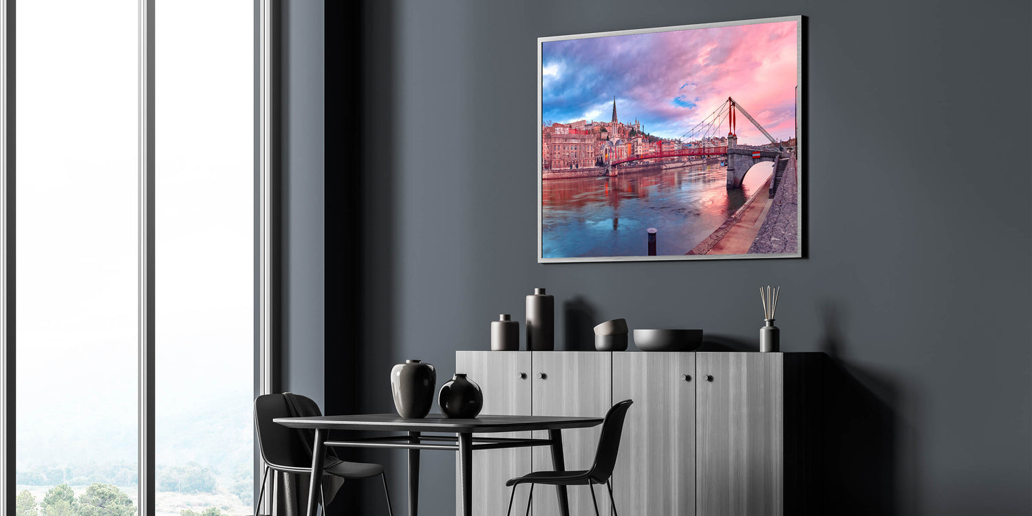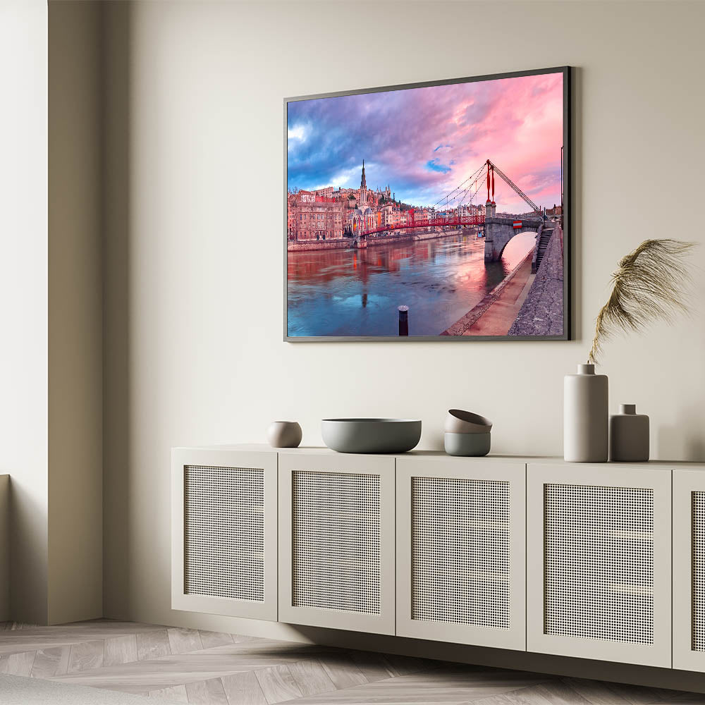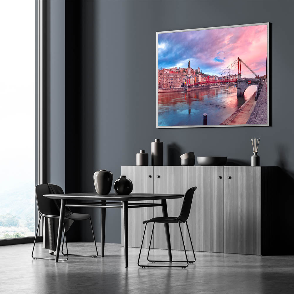 - High-quality reproduction of a sunset over Lyon’s Saône River, with detailed reflections.