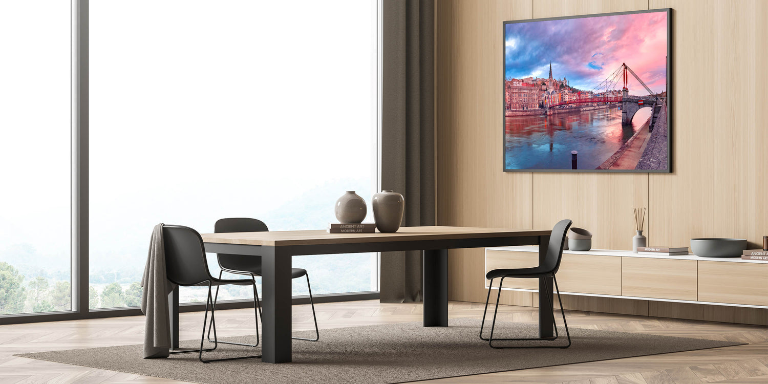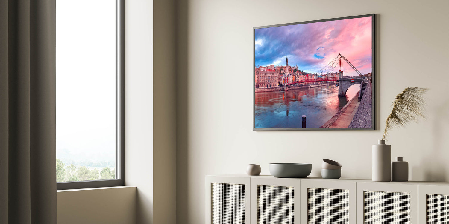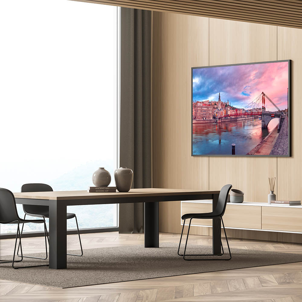- High-quality reproduction of a sunset over Lyon’s Saône River, with detailed reflections.