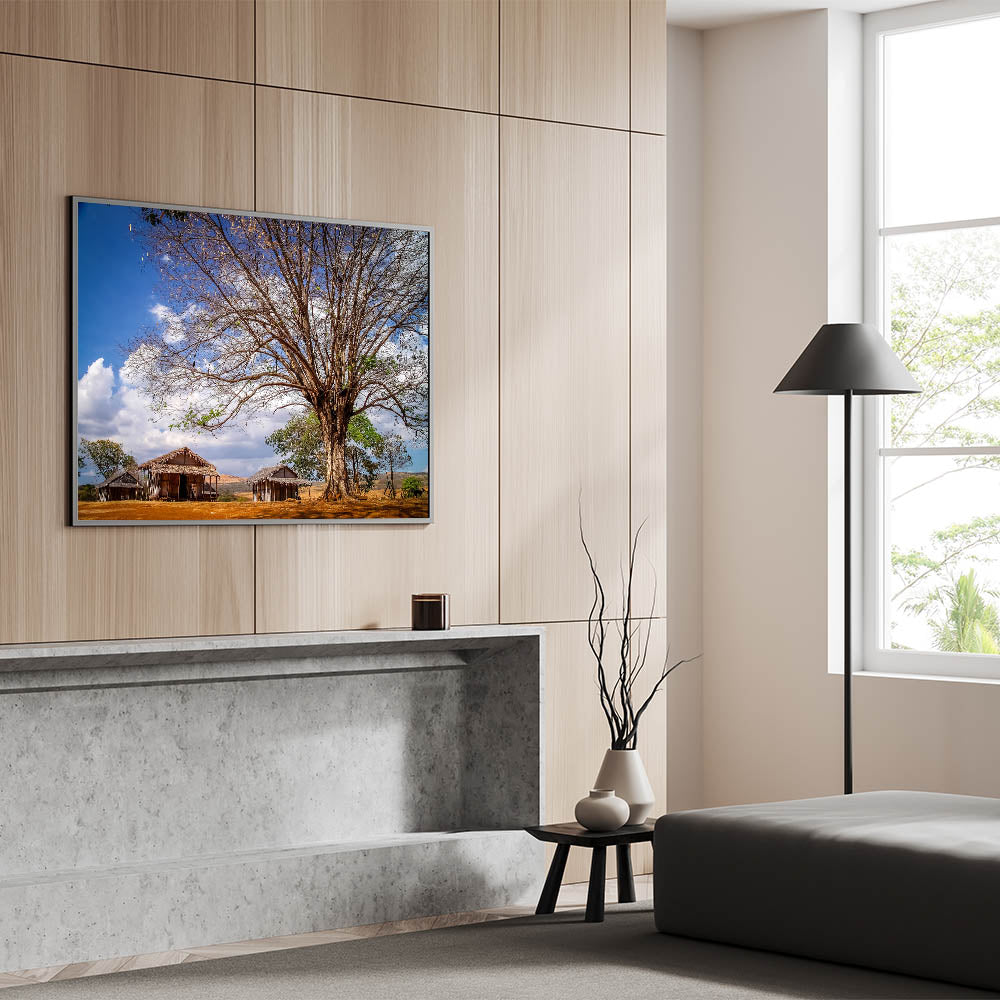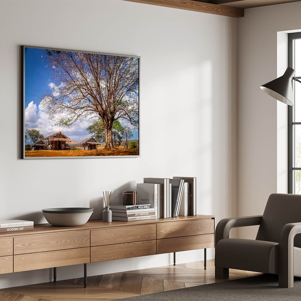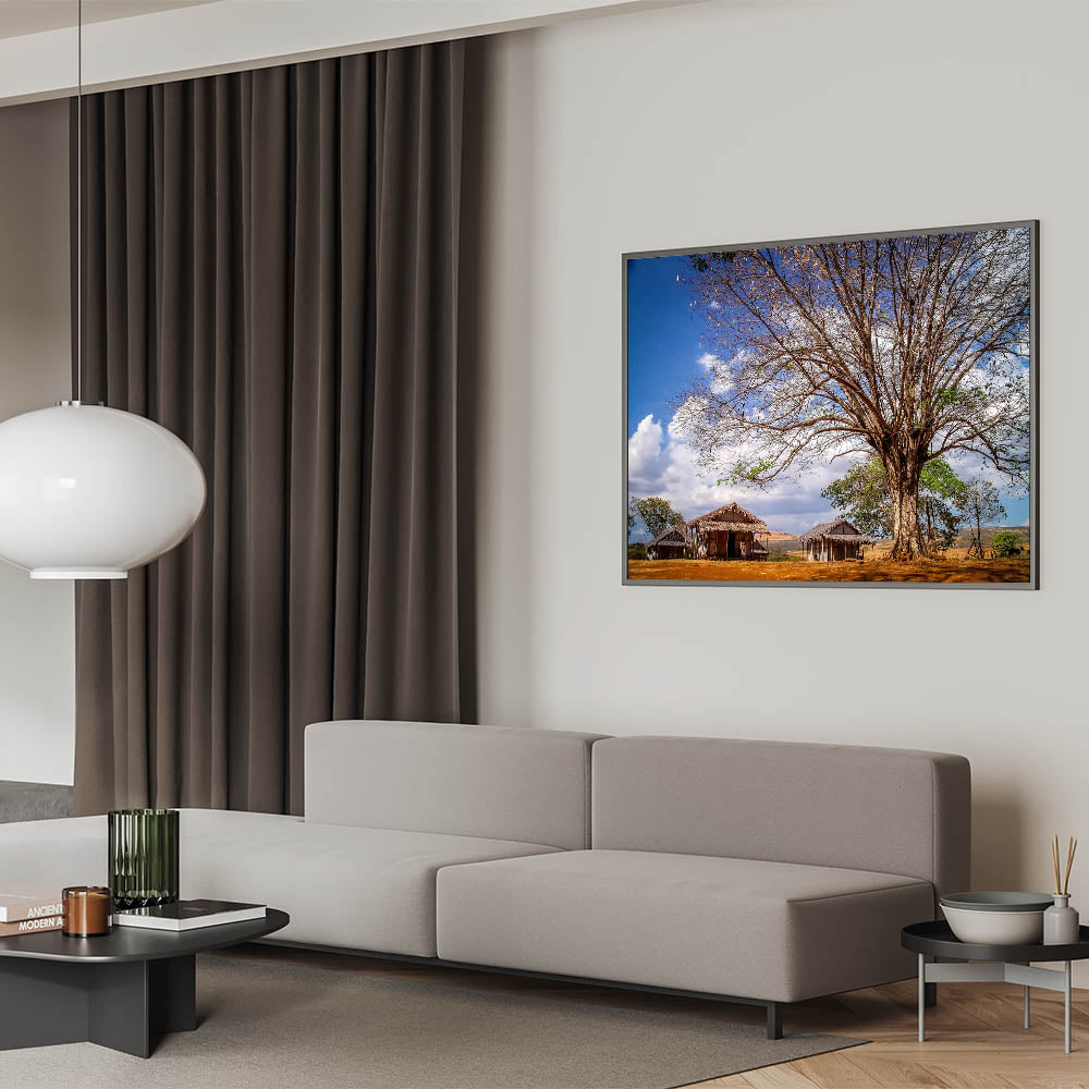 Experience the rustic charm of Madagascar with this beautiful wall art featuring a traditional African village scene. The artwork captures the essence of Madagascar’s rural life, showcasing simple wooden huts nestled under the shade of a grand tree, all set against a brilliant blue sky. This piece offers a glimpse into the serene and timeless landscapes of Madagascar, making it a perfect addition to any home or office decor.