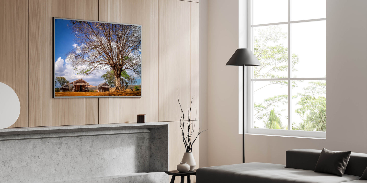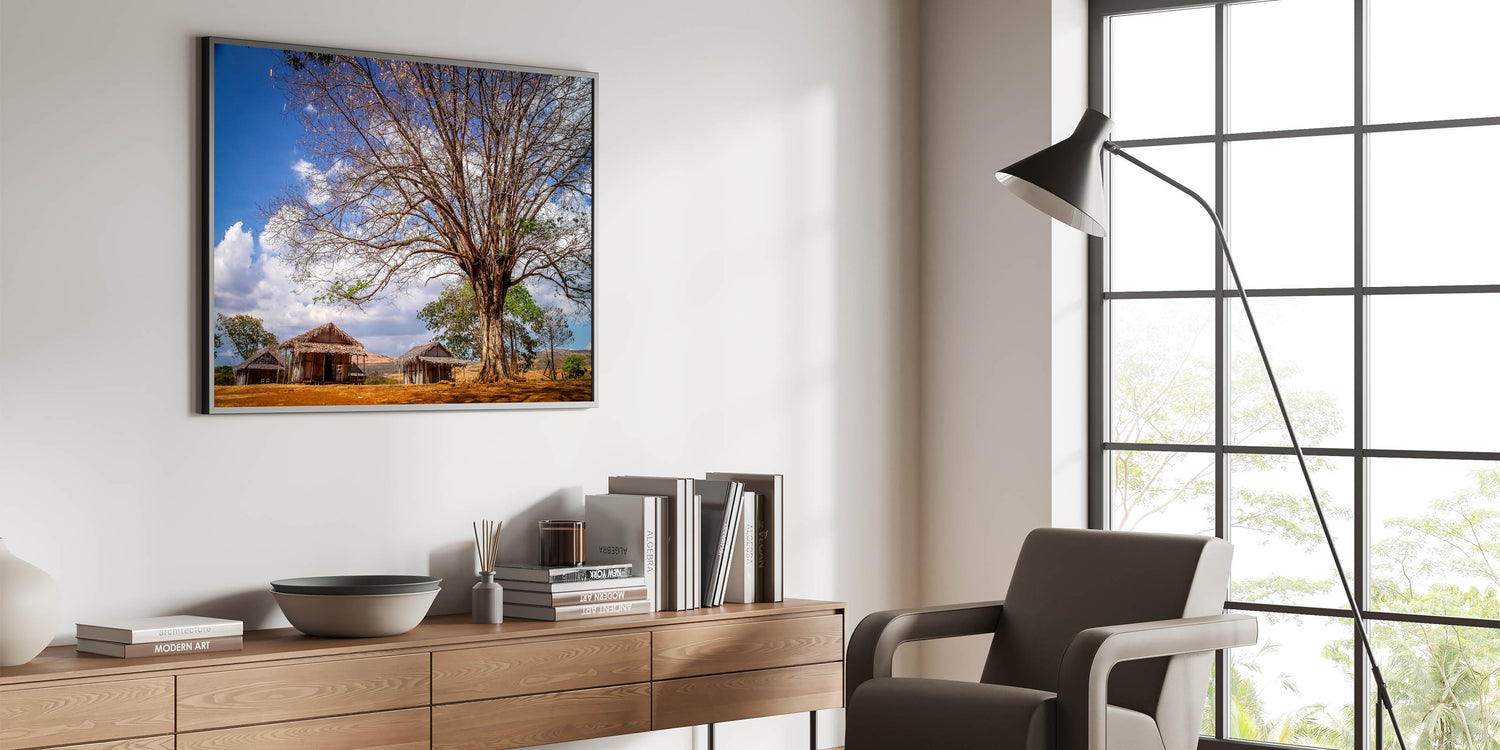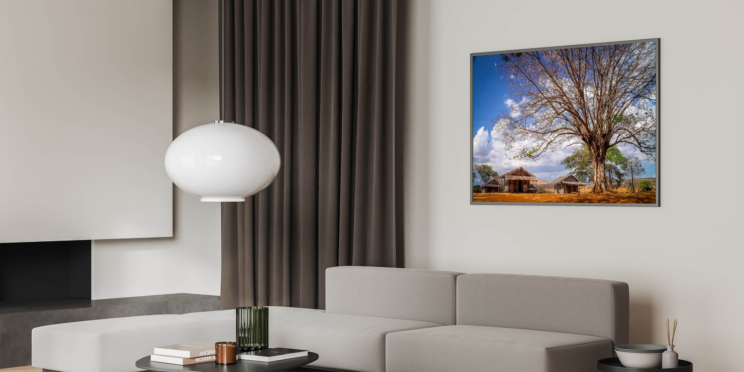 Experience the rustic charm of Madagascar with this beautiful wall art featuring a traditional African village scene. The artwork captures the essence of Madagascar’s rural life, showcasing simple wooden huts nestled under the shade of a grand tree, all set against a brilliant blue sky. This piece offers a glimpse into the serene and timeless landscapes of Madagascar, making it a perfect addition to any home or office decor.