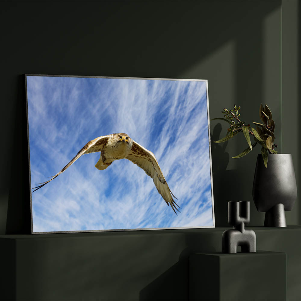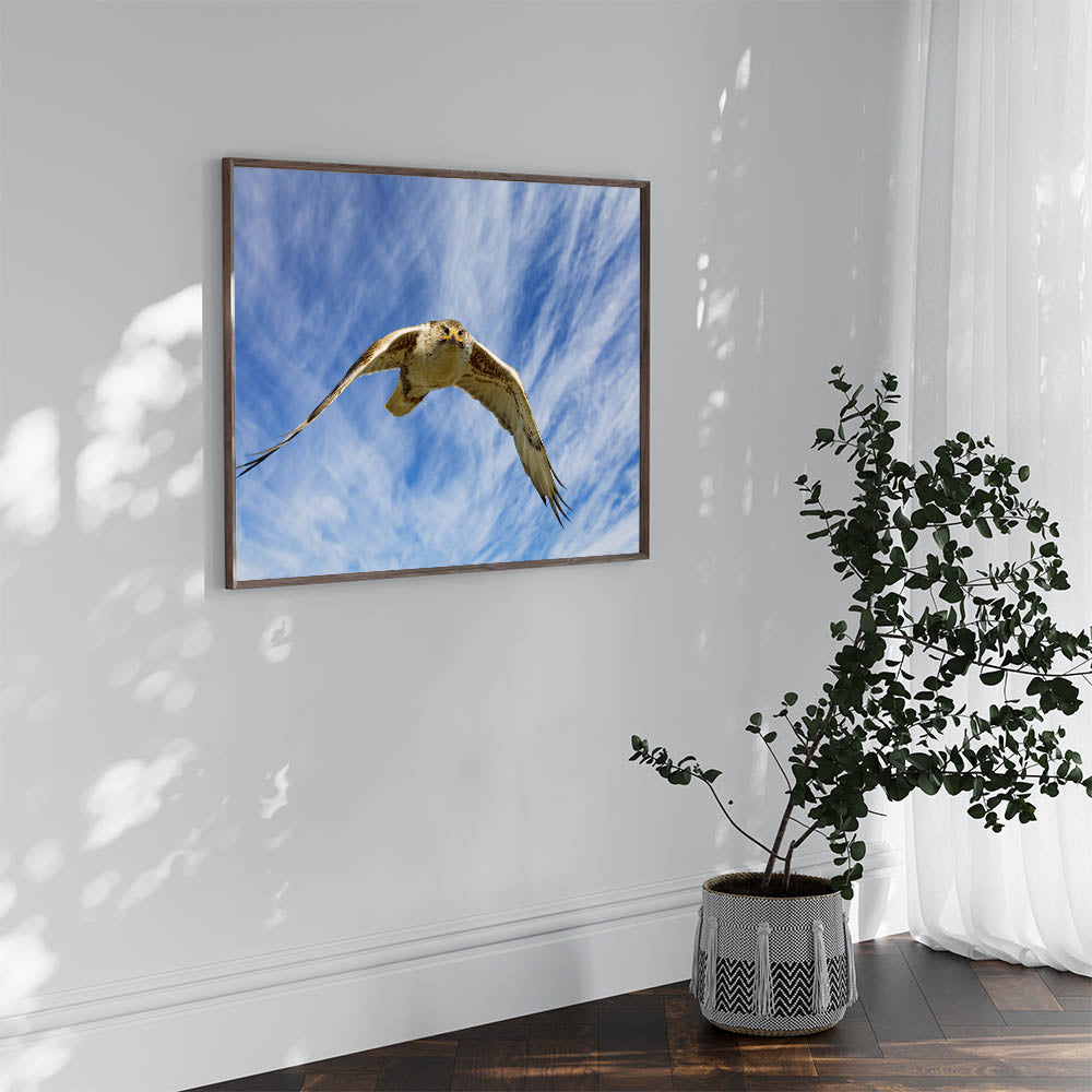 Capture the essence of freedom and power with this breathtaking photograph of a bird of prey soaring against a vibrant blue sky. Part of our Birds of Prey collection, this stunning artwork beautifully showcases the majesty of an eagle in flight. The sharp details of the feathers, coupled with the dynamic backdrop of swirling clouds, create a sense of movement and awe-inspiring beauty.