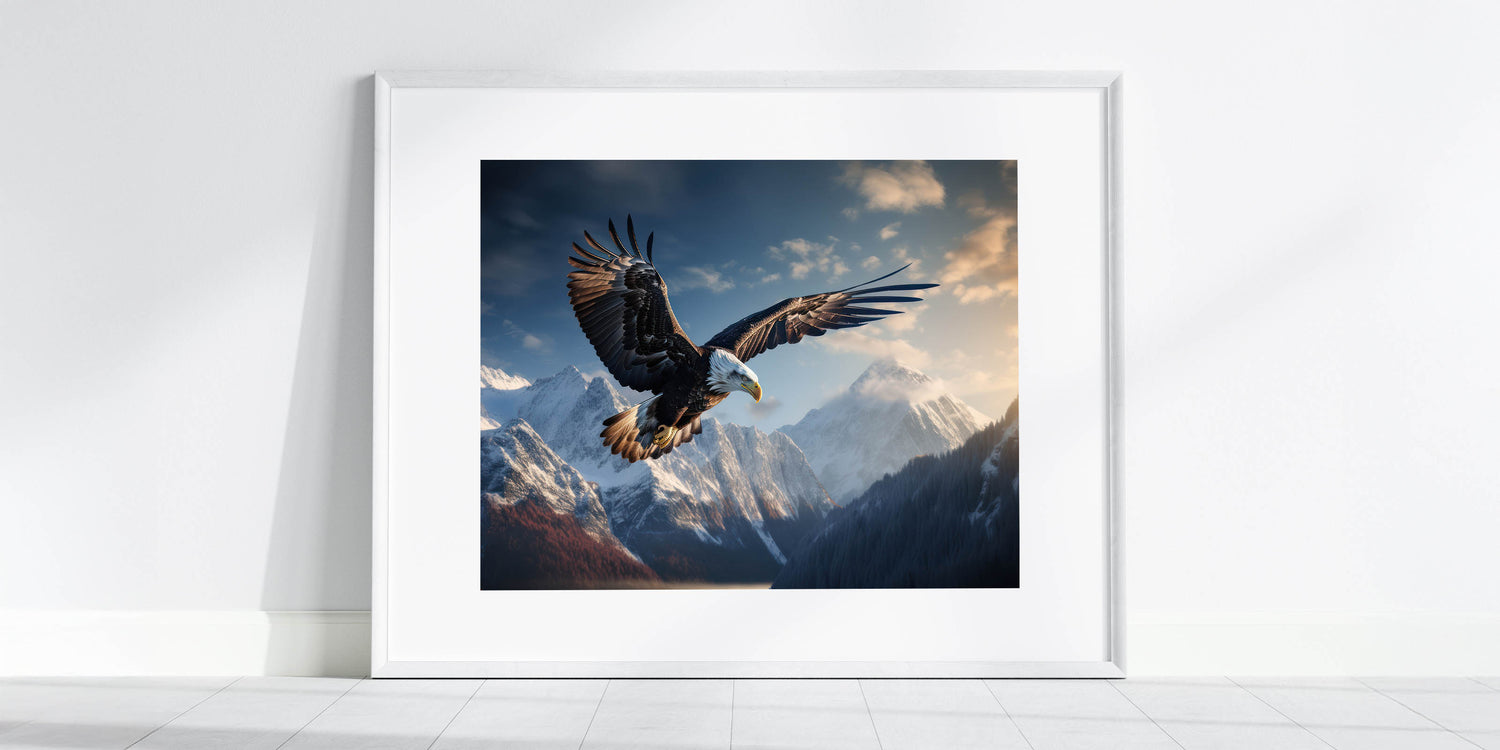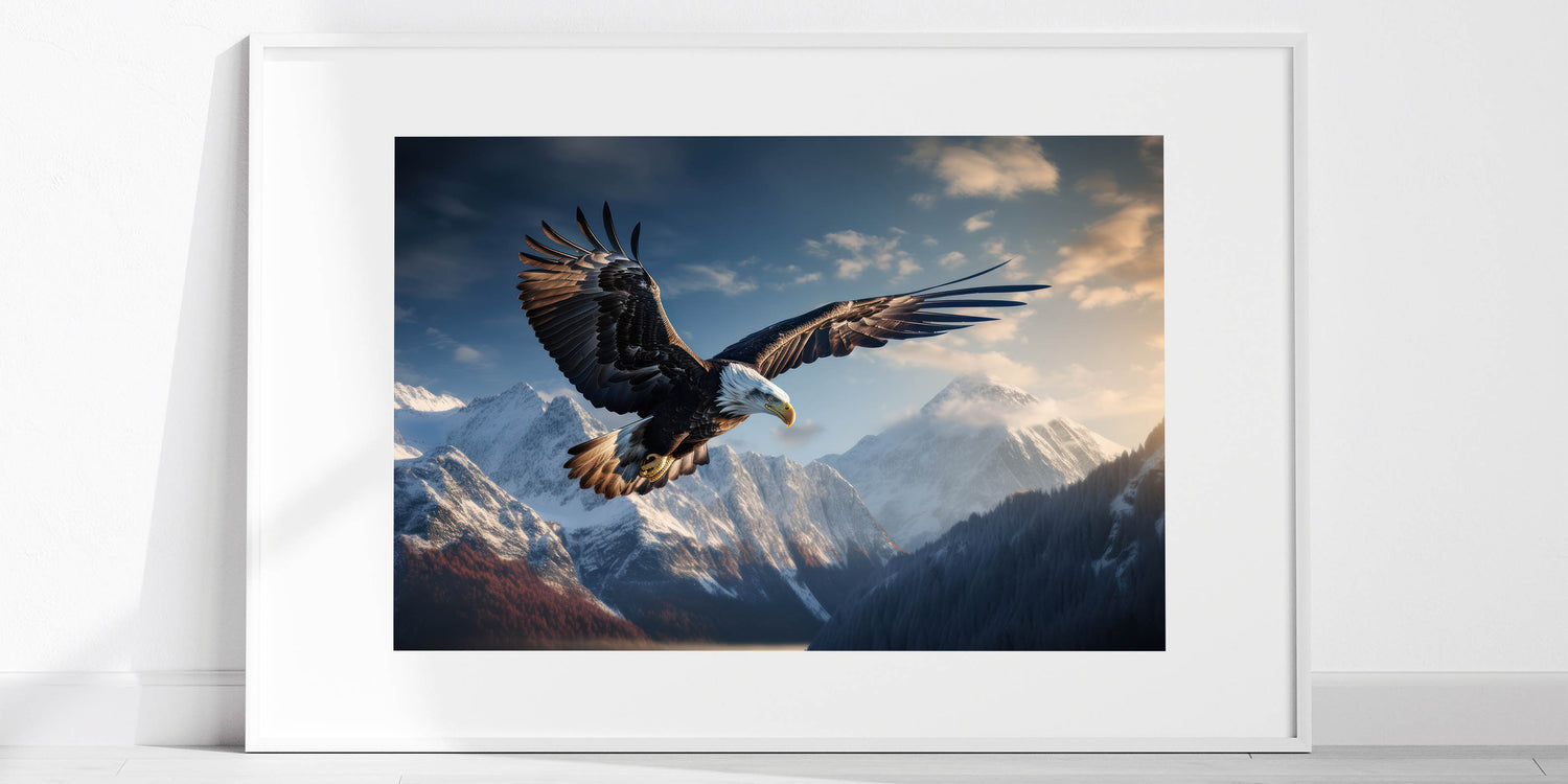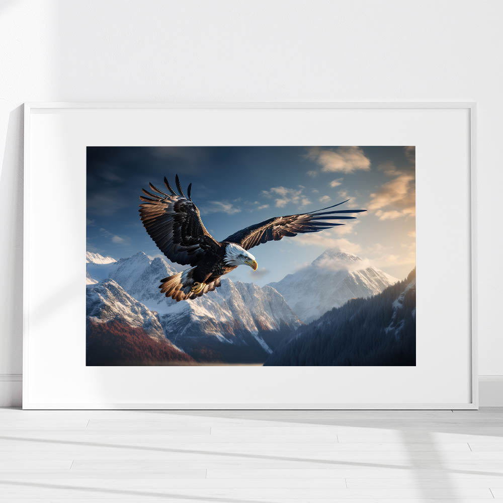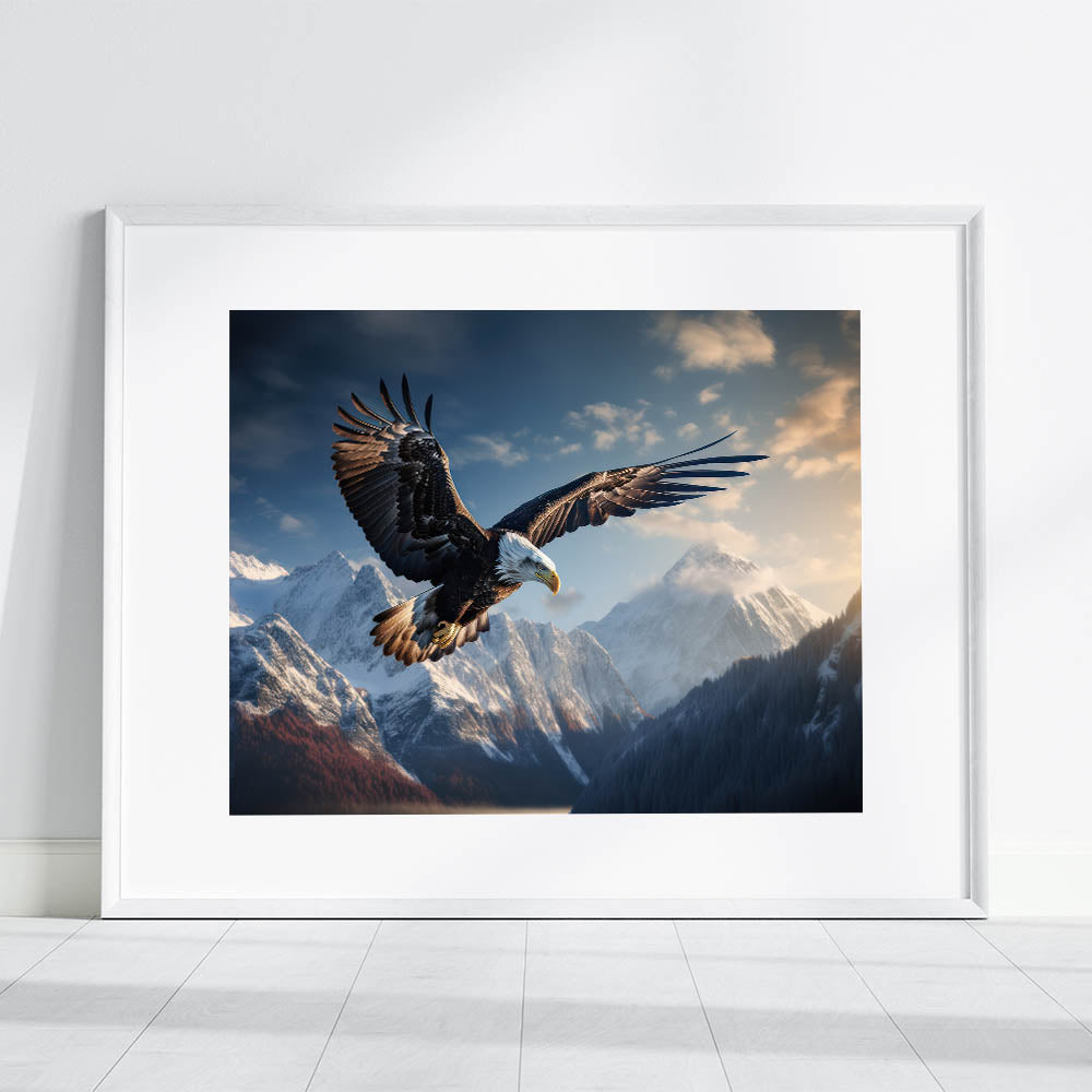 Bring the majestic beauty of nature into your space with this birds of prey wall art featuring a bald eagle soaring over snow-covered mountain peaks. The artwork captures the eagle in mid-flight, its powerful wings gracefully cutting through the crisp mountain air. The soft light of the setting sun bathes the mountains in a warm glow, creating a breathtaking contrast with the cool blues of the sky and the snow. This piece perfectly encapsulates the wild freedom and strength of one of nature’s most revered predators.