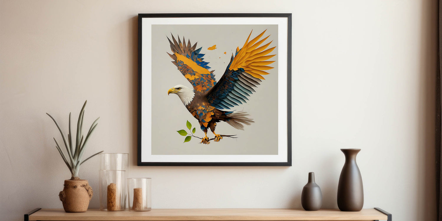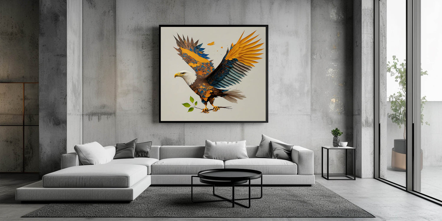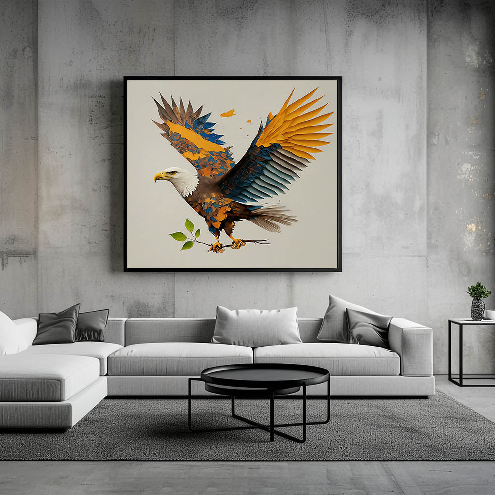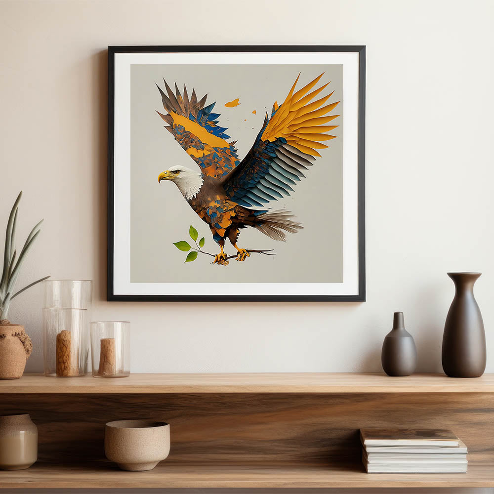 Introduce a touch of wilderness and majesty to your space with this stunning eagle wall art from our Birds of Prey collection. This captivating artwork features a magnificent eagle in flight, with its powerful wings fully extended, embodying the grace and strength of this iconic predator. The vibrant hues of orange and blue contrast beautifully with the eagle’s white head and brown body, making this piece a true statement in any room.