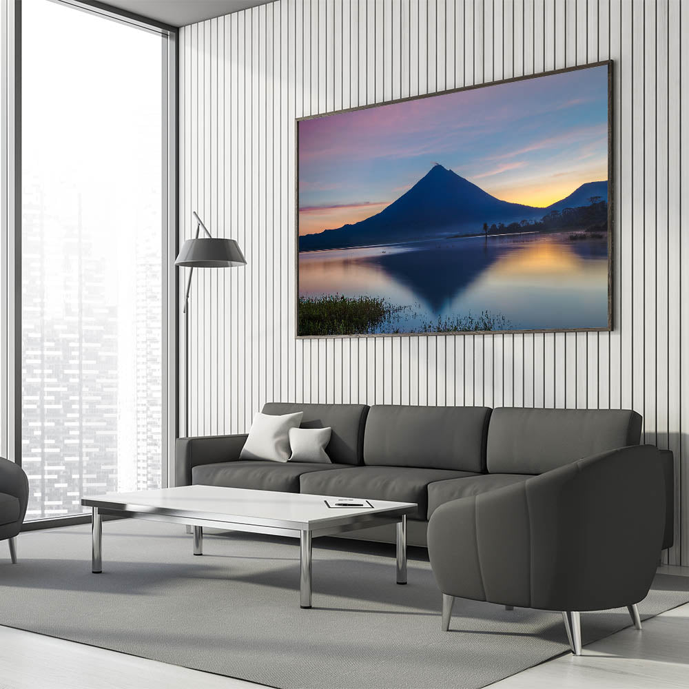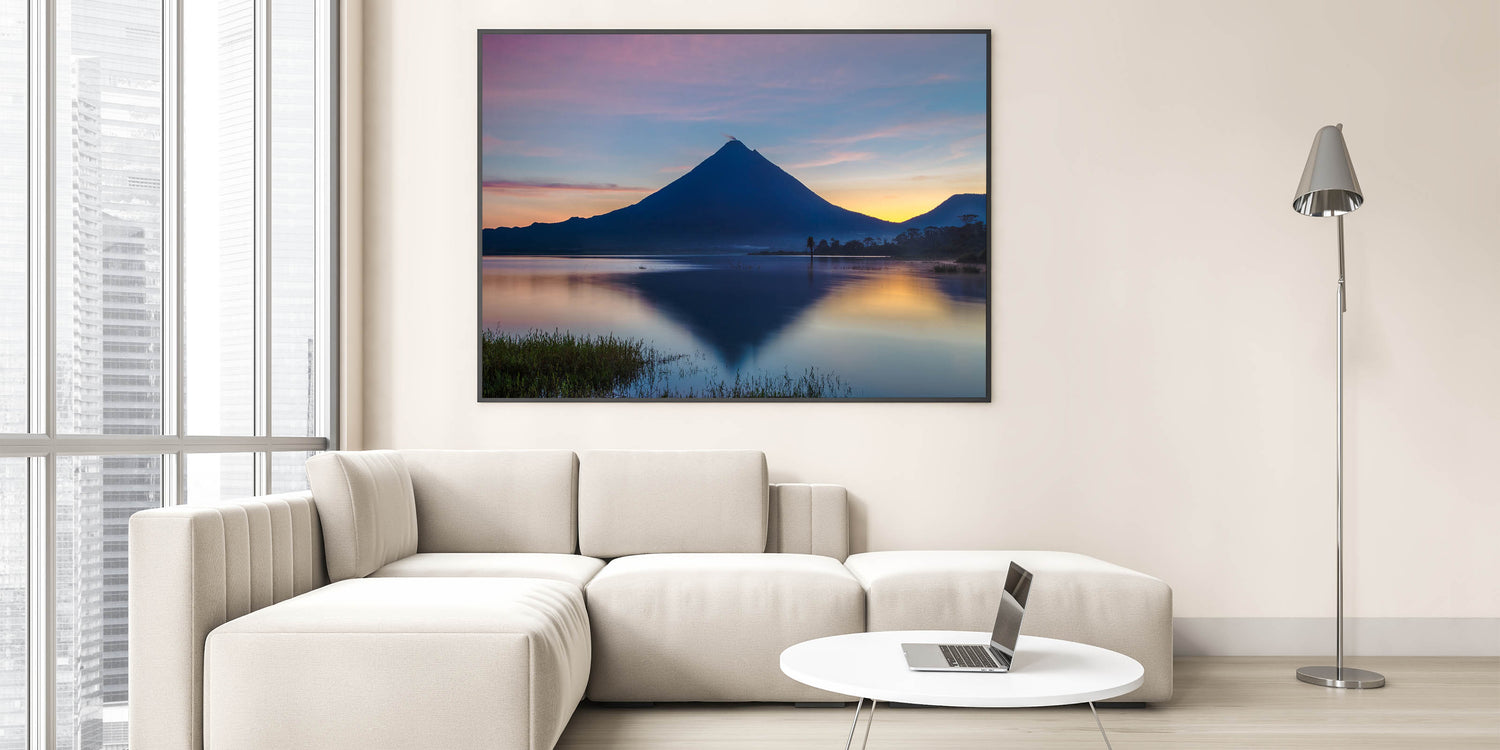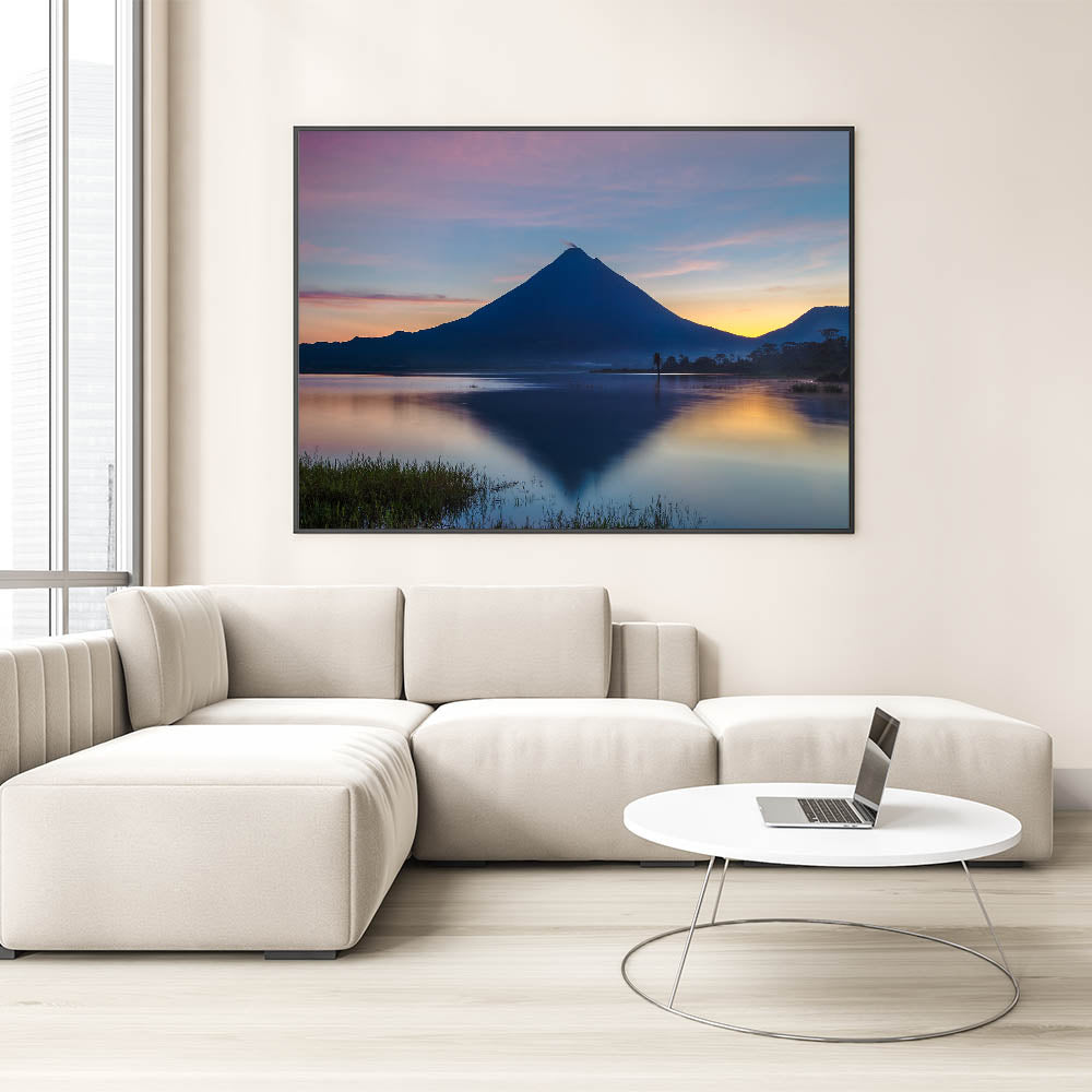 Elevate your decor with our Majestic Costa Rican Volcano Canvas. This breathtaking artwork captures a serene sunset over one of Costa Rica's iconic volcanoes, reflecting beautifully in a tranquil lake. Ideal for those who appreciate natural landscapes and vibrant skies.