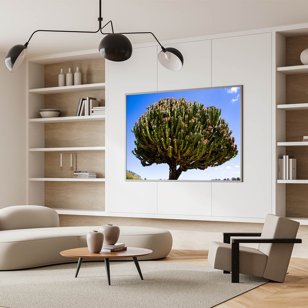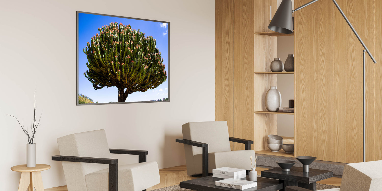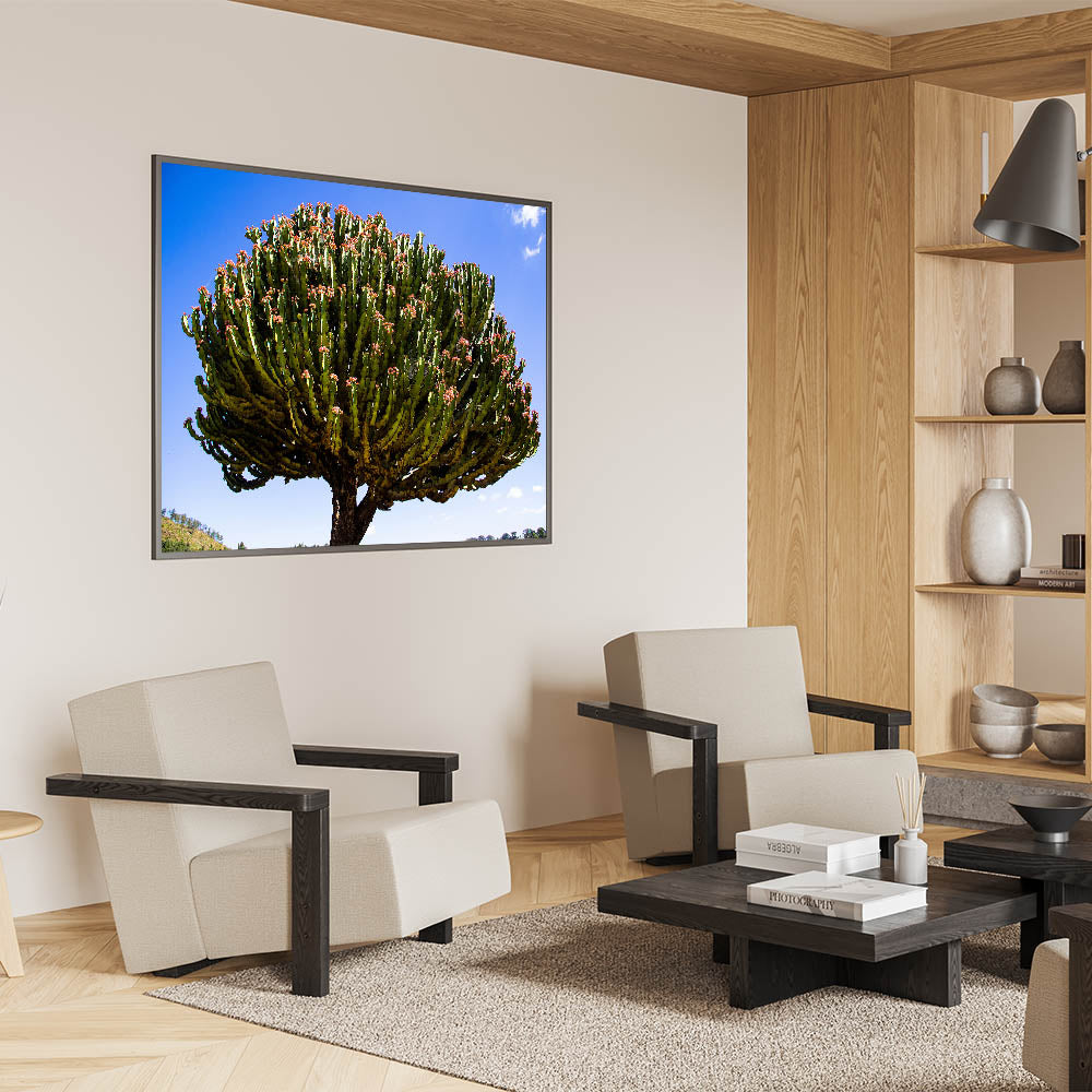 Celebrate the unique and vibrant flora of Ethiopia with this stunning wall art featuring a majestic cactus tree in full bloom. The striking green of the cactus contrasts beautifully with the vivid blue sky, creating a scene that is both bold and serene. This artwork captures the essence of Ethiopia's diverse landscapes, offering a glimpse into the natural beauty that defines this African nation. Perfect for nature lovers and those looking to bring a touch of the outdoors into their home, this piece is a vivid reminder of the resilience and beauty of nature.