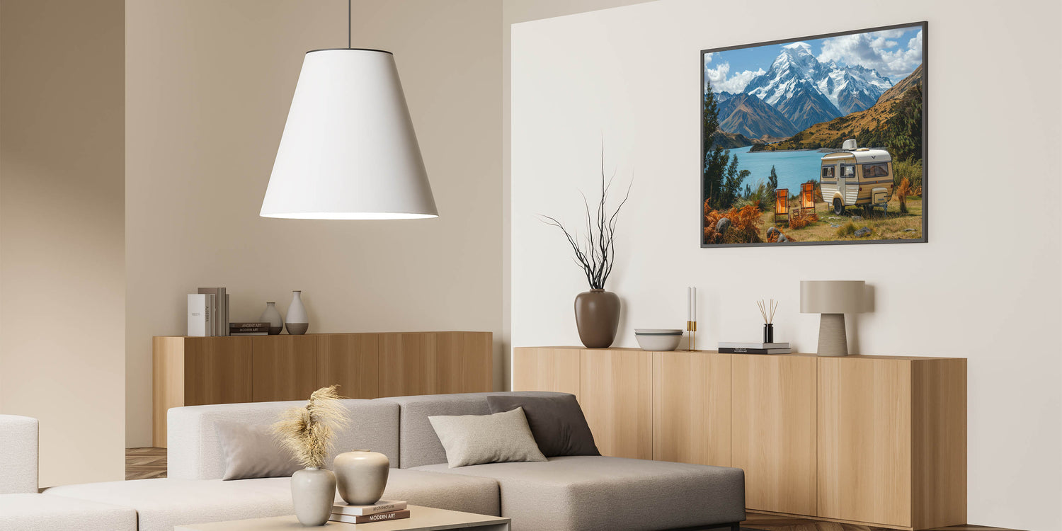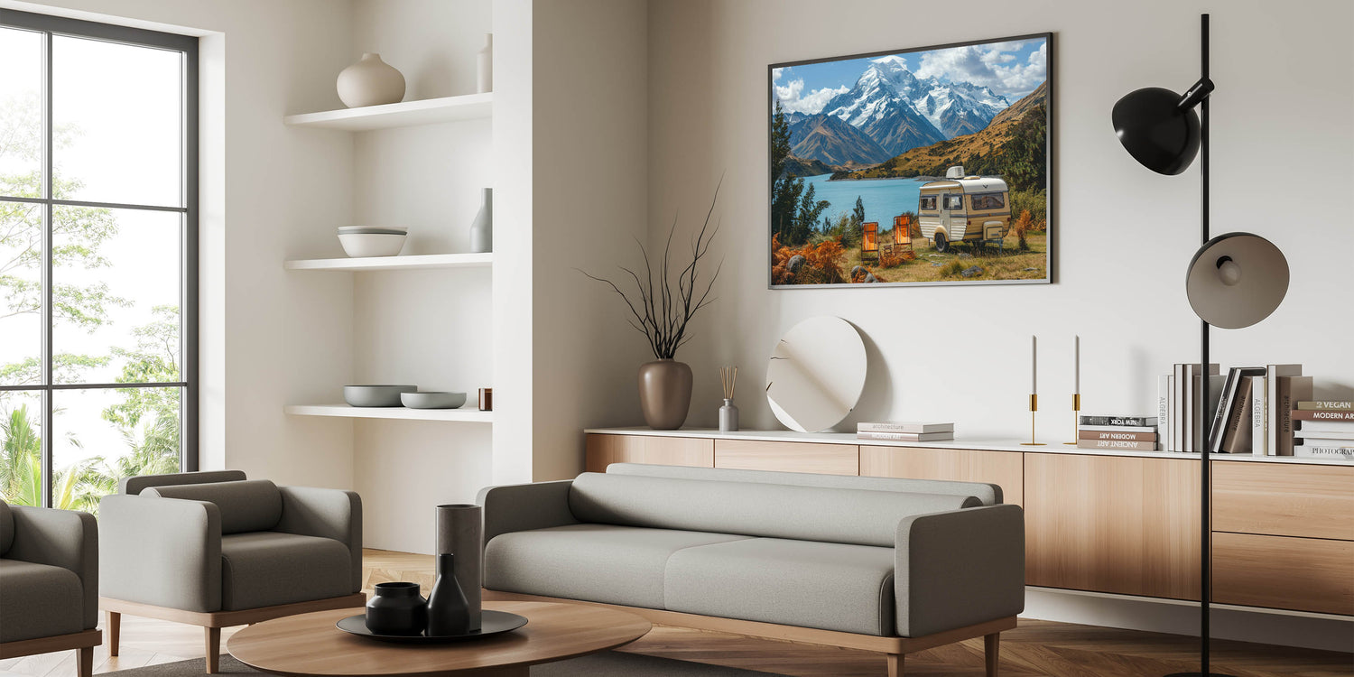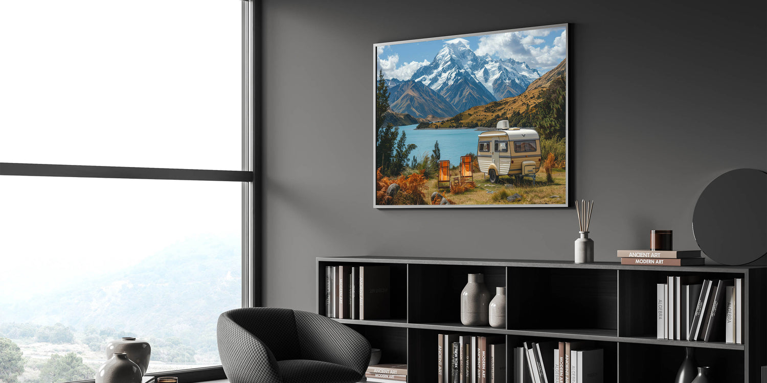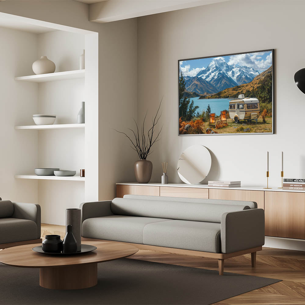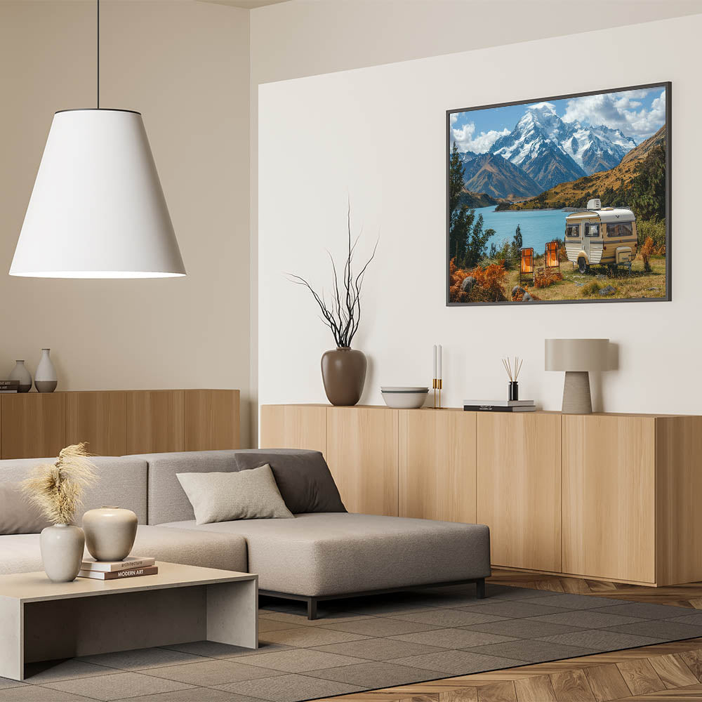 This majestic mountain caravan art is more than just a decoration; it’s a celebration of the natural world and the adventures that await. Whether you're decorating your home or searching for the perfect gift, this artwork will inspire a connection to the great outdoors.