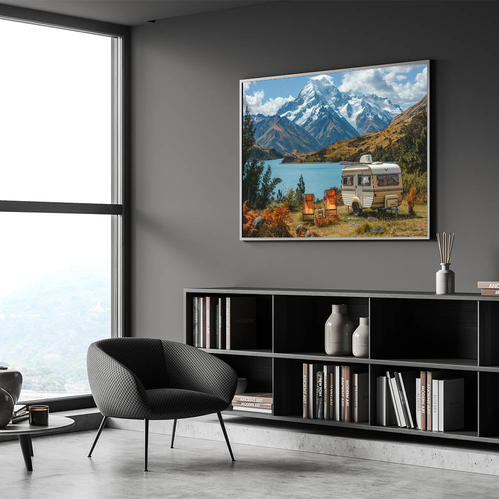 Experience the breathtaking beauty of nature with this majestic mountain caravan wall art. Featuring a serene RV campsite set against a stunning backdrop of snow-capped mountains and a crystal-clear lake, this artwork captures the awe-inspiring power of the great outdoors. Ideal for those who love to explore or simply appreciate the wonders of nature, this piece will bring a sense of tranquility and adventure to any space.