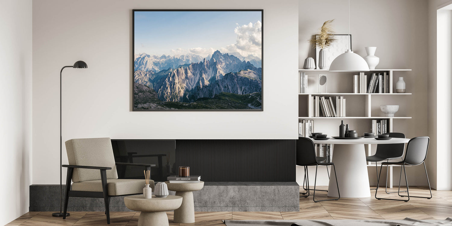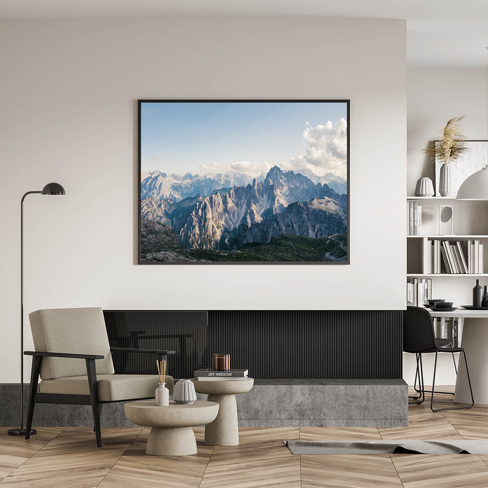 Transform your home decor with this striking mountain peaks artwork. The majestic mountains and their powerful presence create an inspiring atmosphere that will make any room feel grand and captivating. Order today to bring this dramatic landscape into your home.