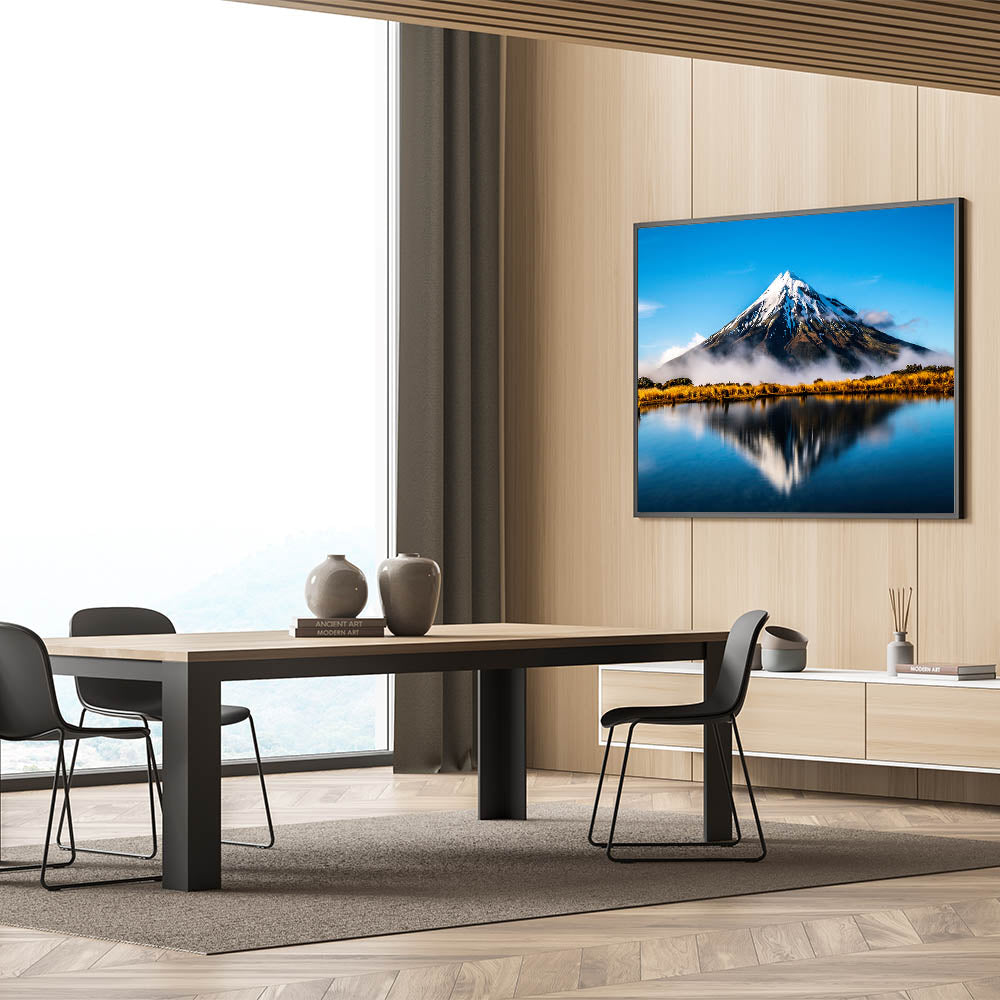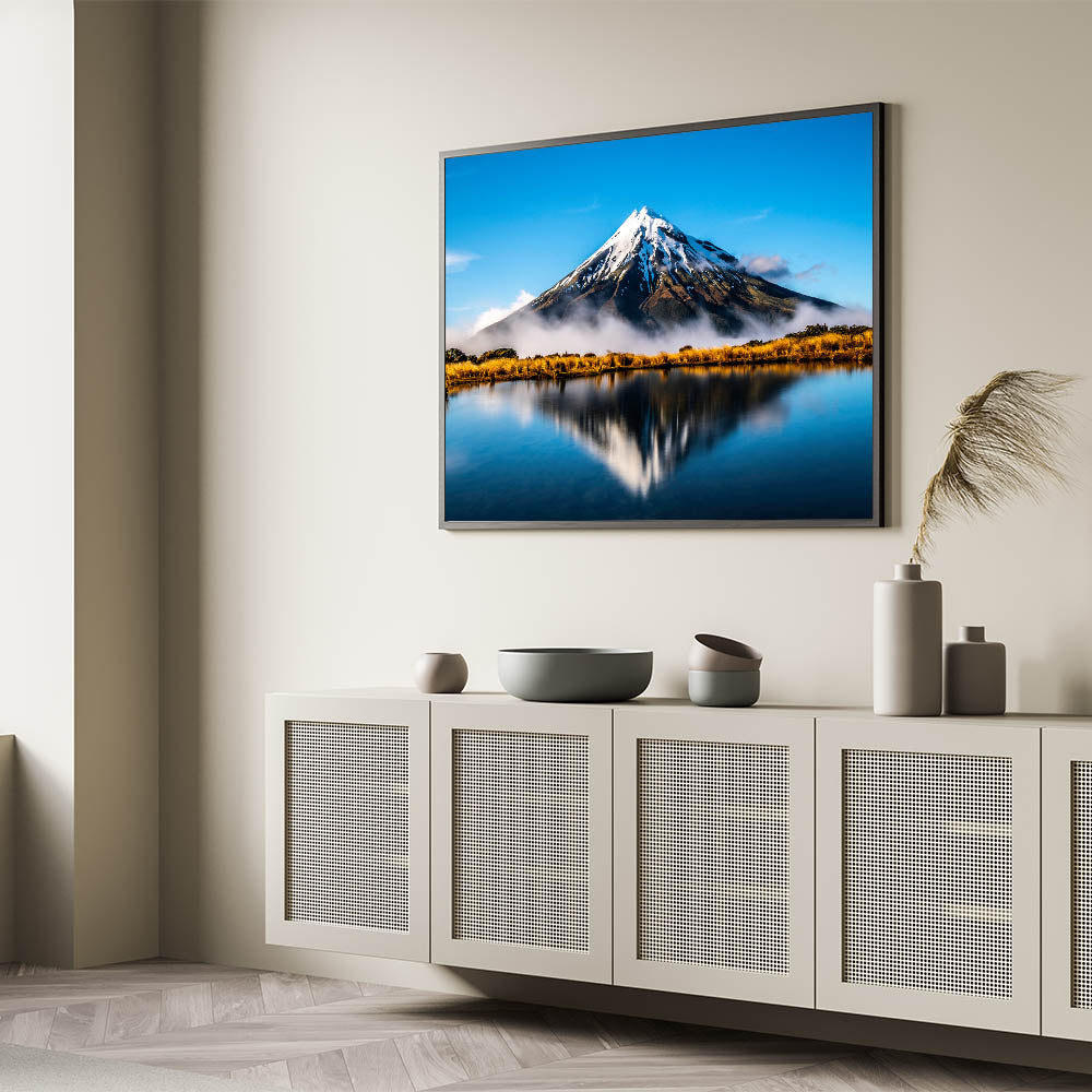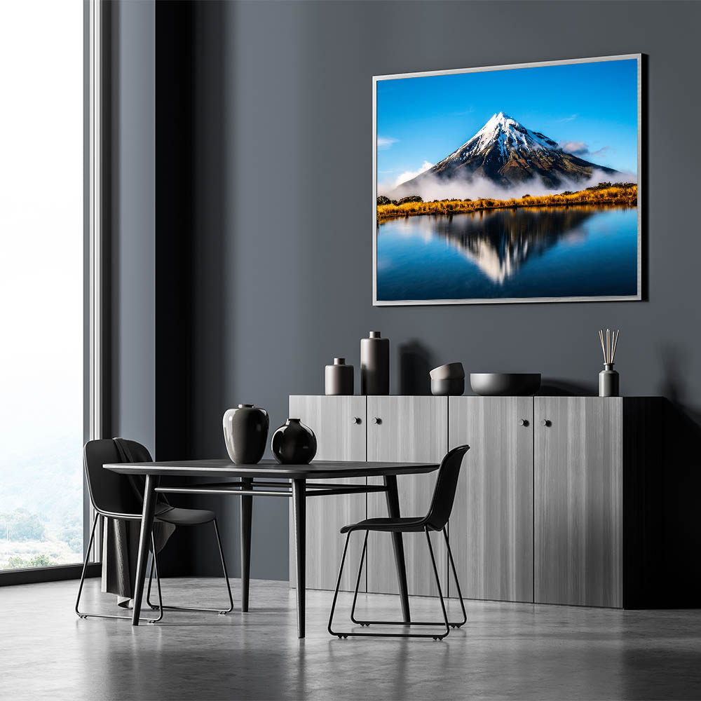 - High-resolution printing ensures that every detail, from the mountain's rugged textures to the tranquil water reflections, is captured with stunning clarity.